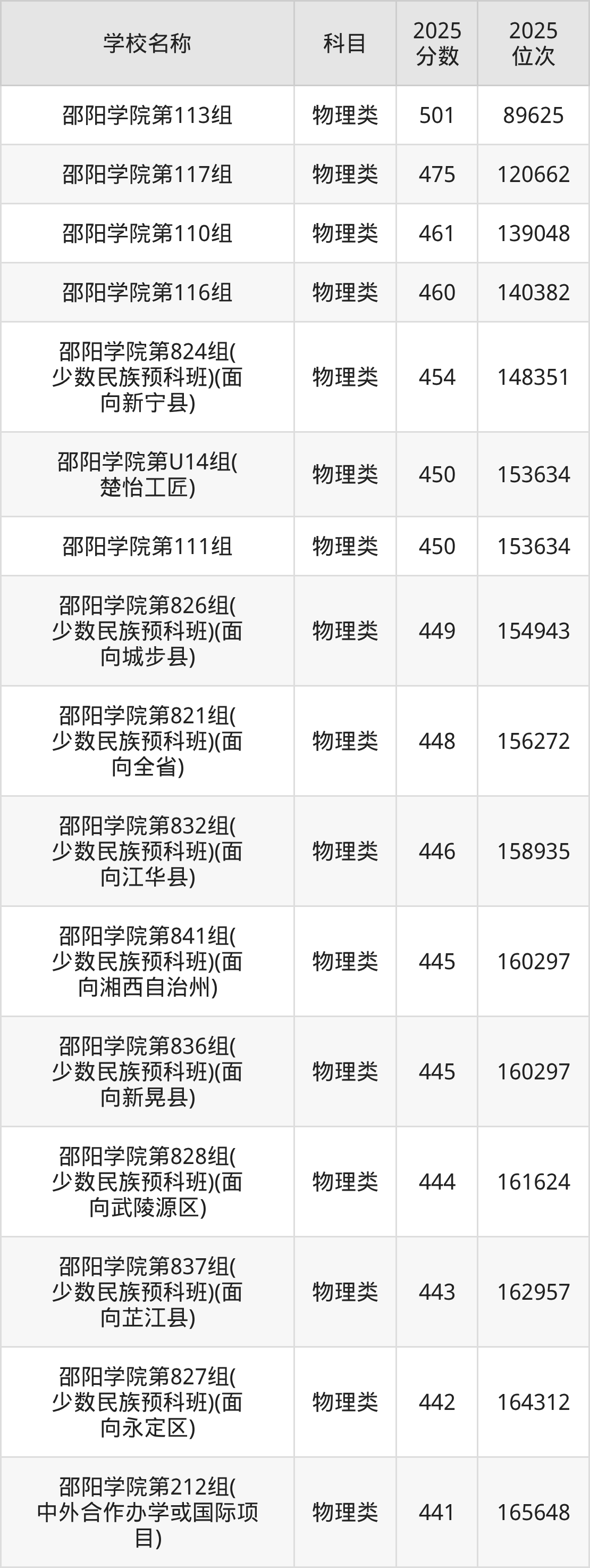 下文为2025年邵阳市本科大学在湖南物理类录取分数线和位次排名表,供大家参考: