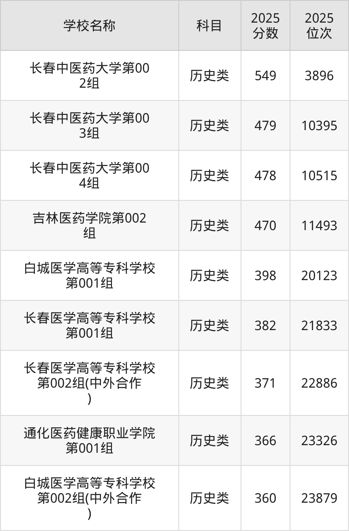 下文为2025年吉林省医科大学在吉林历史类录取分数线和位次排名表,供大家参考: