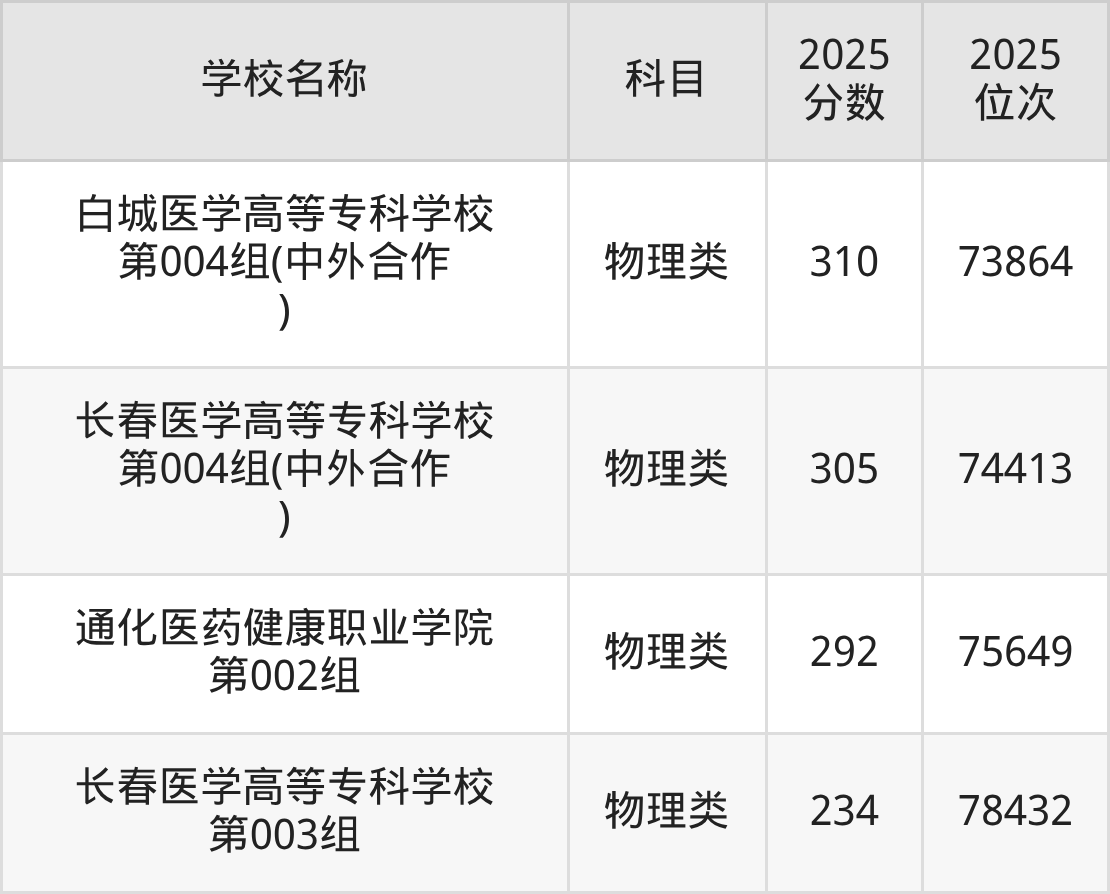 下文为2025年吉林省医科大学在吉林物理类录取分数线和位次排名表,供大家参考: