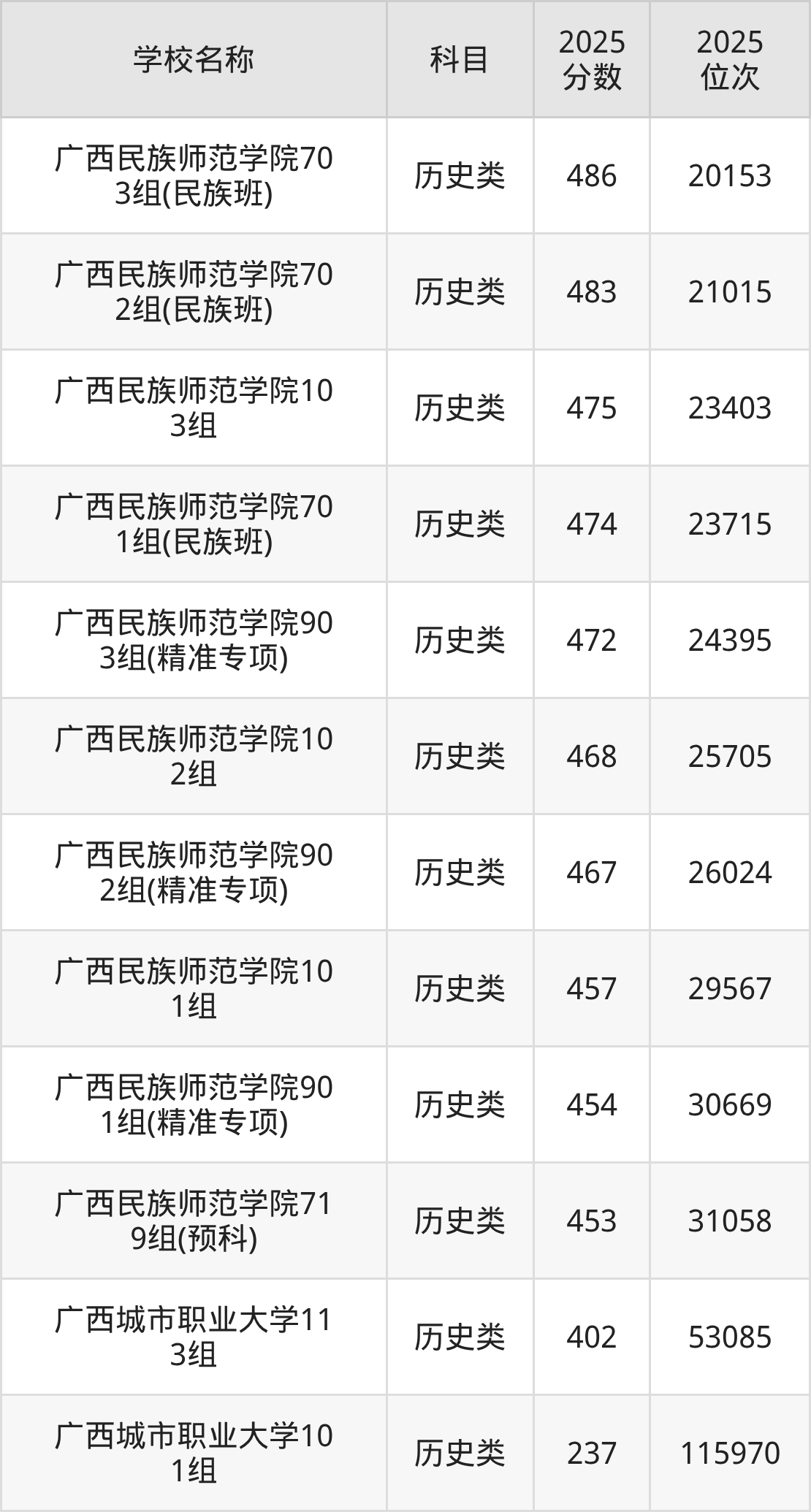 下文为2025年崇左市本科大学在广西历史类录取分数线和位次排名表,供大家参考: