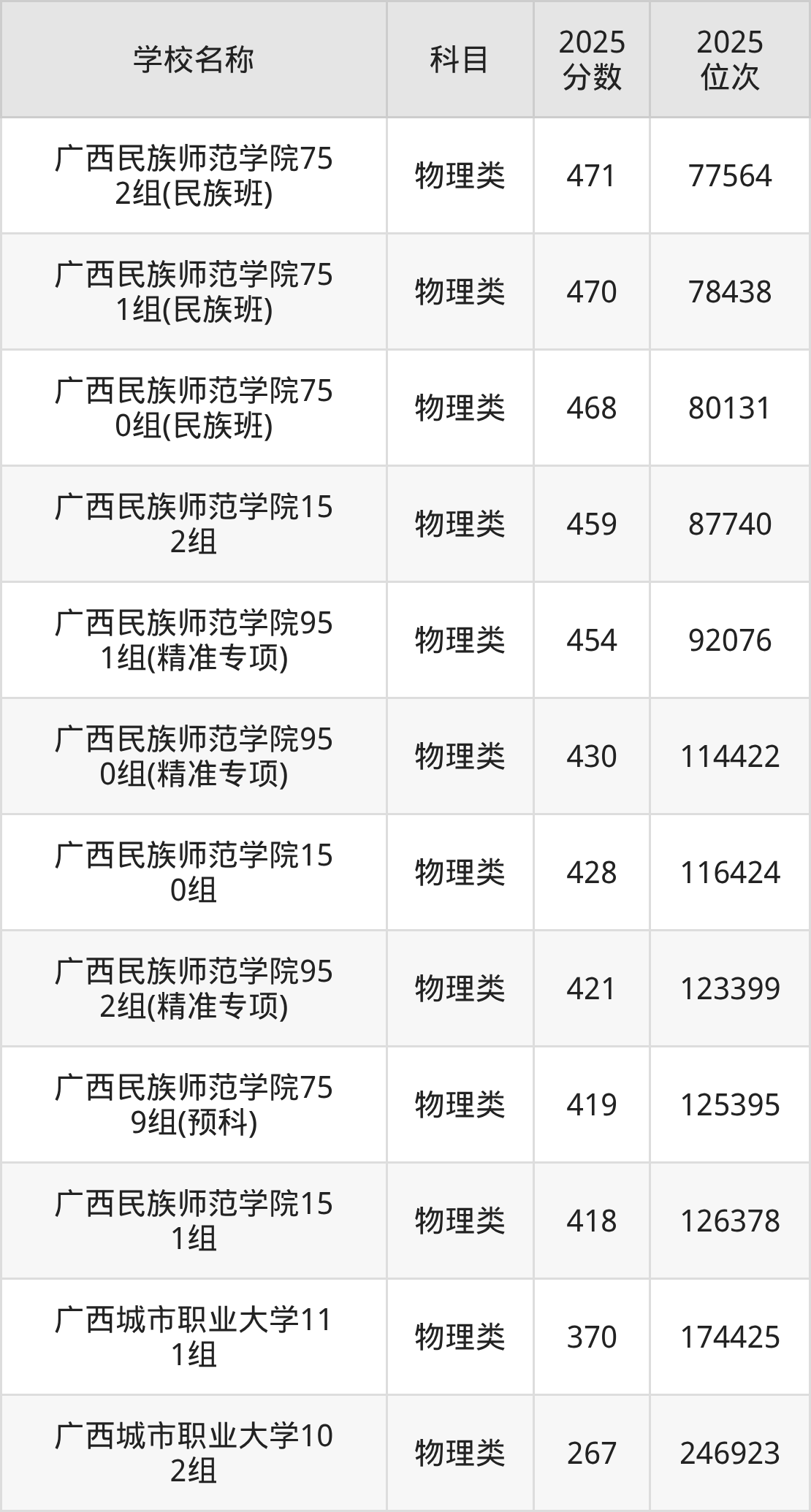 下文为2025年崇左市本科大学在广西物理类录取分数线和位次排名表,供大家参考: