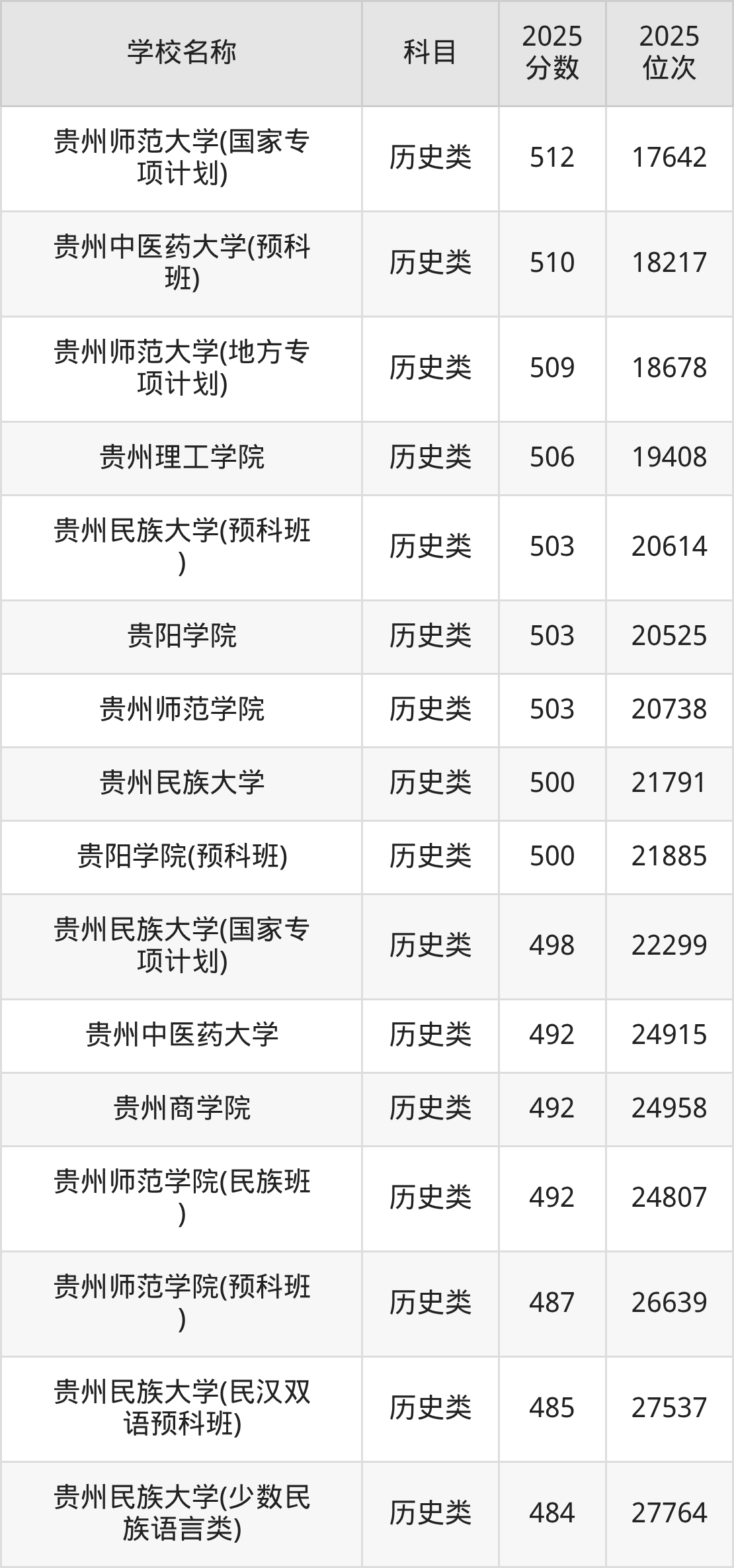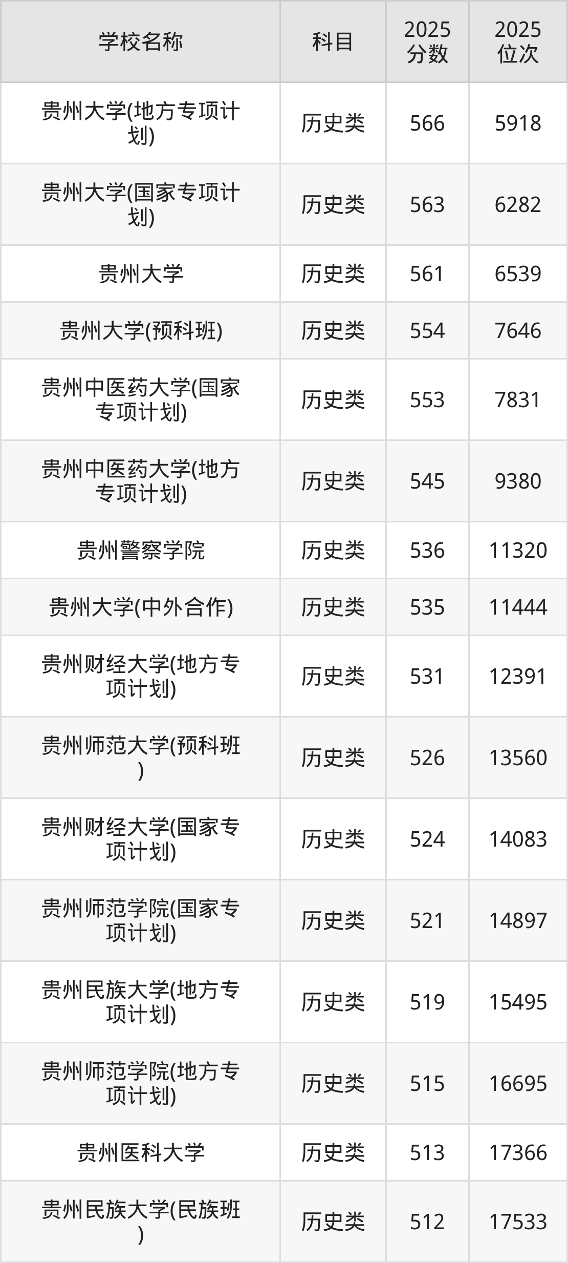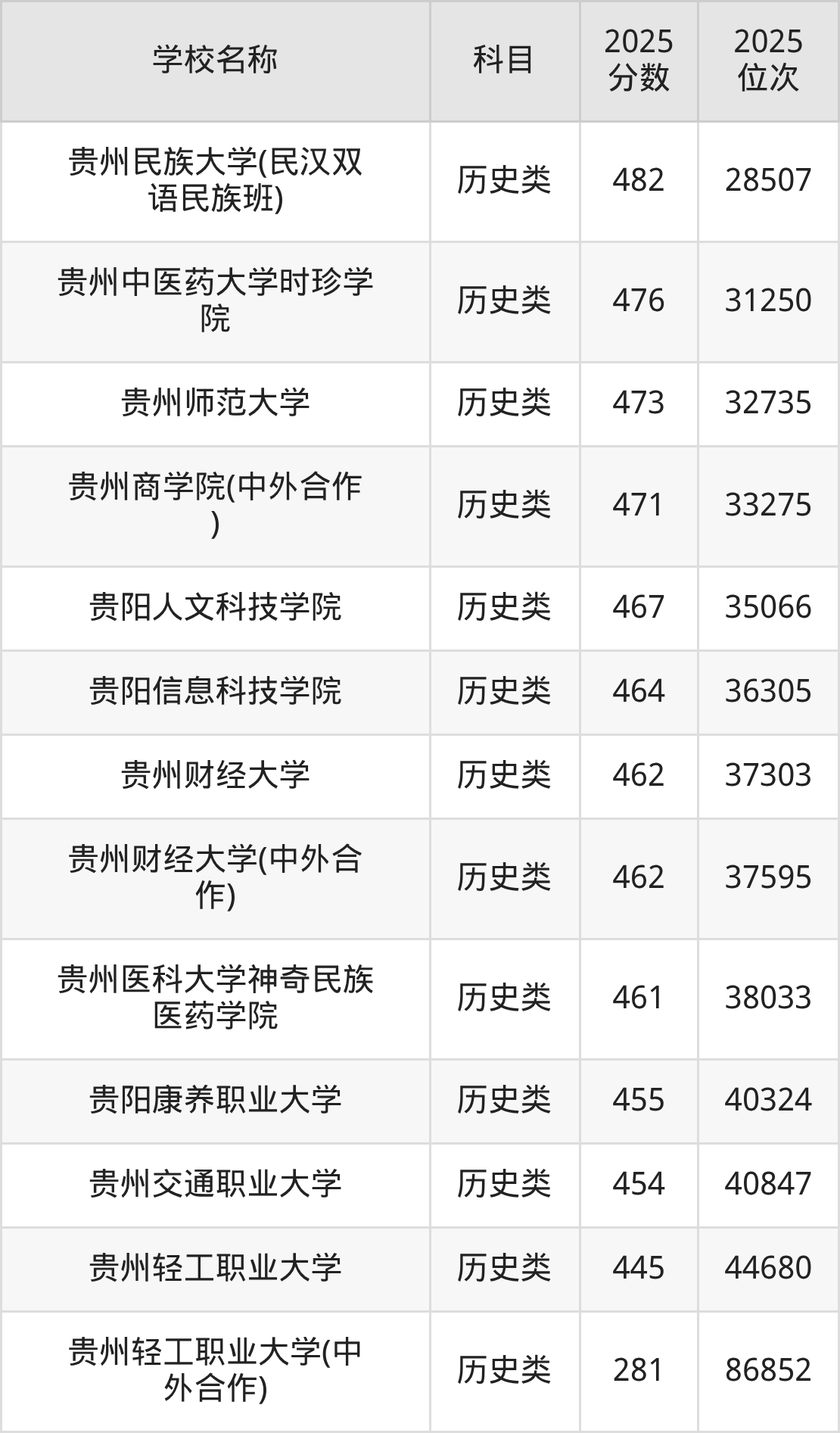 下文为2025年贵阳市本科大学在贵州历史类录取分数线和位次排名表,供大家参考: