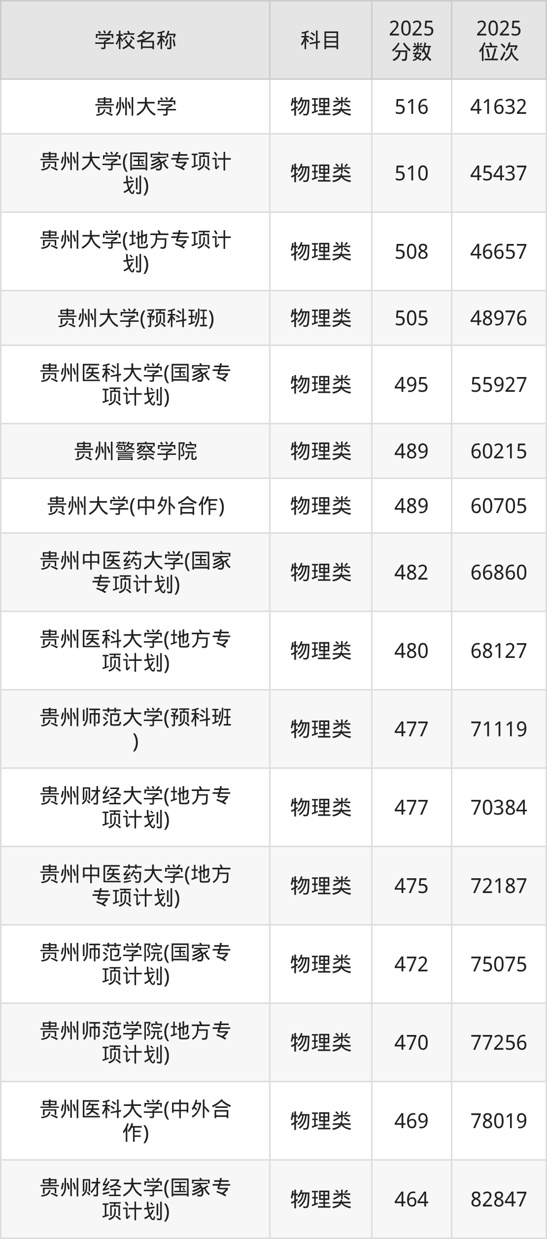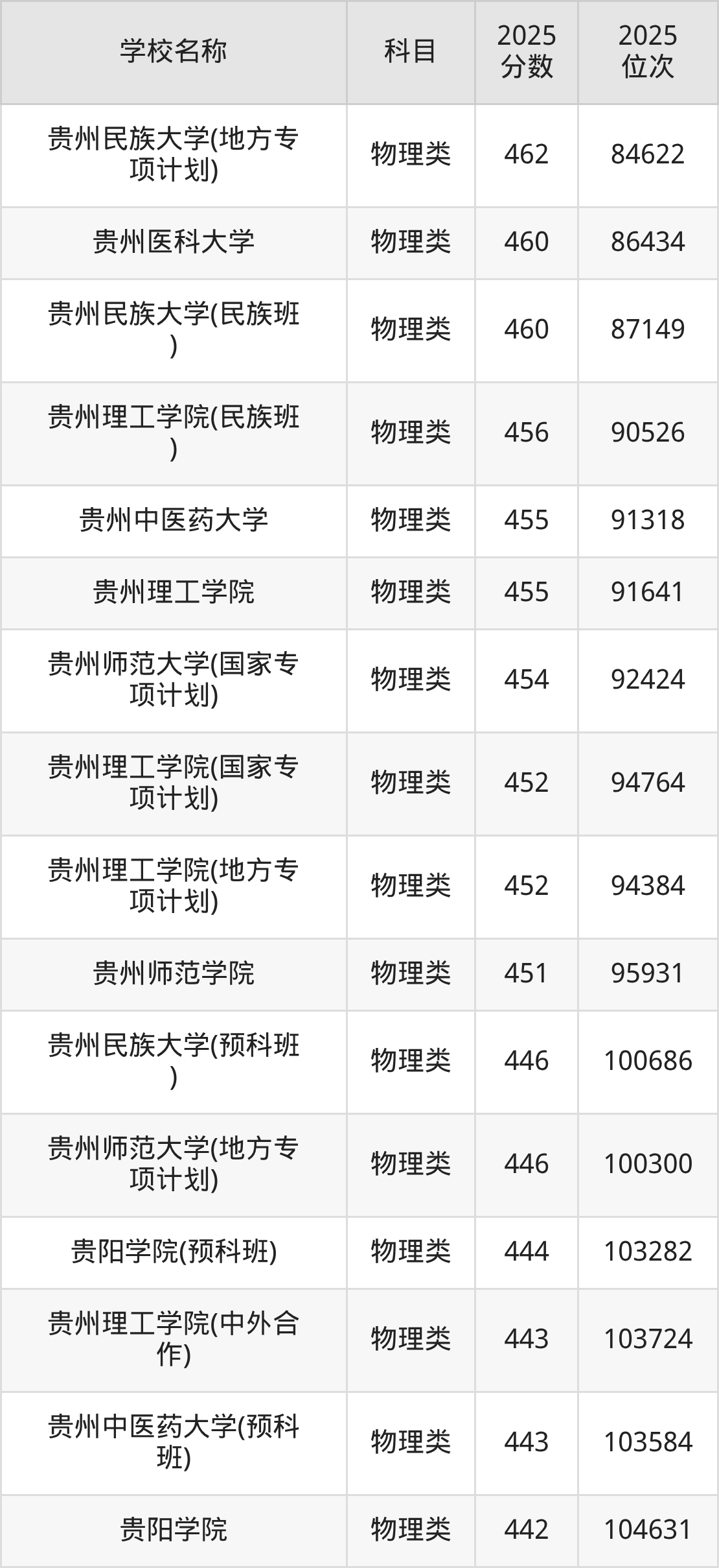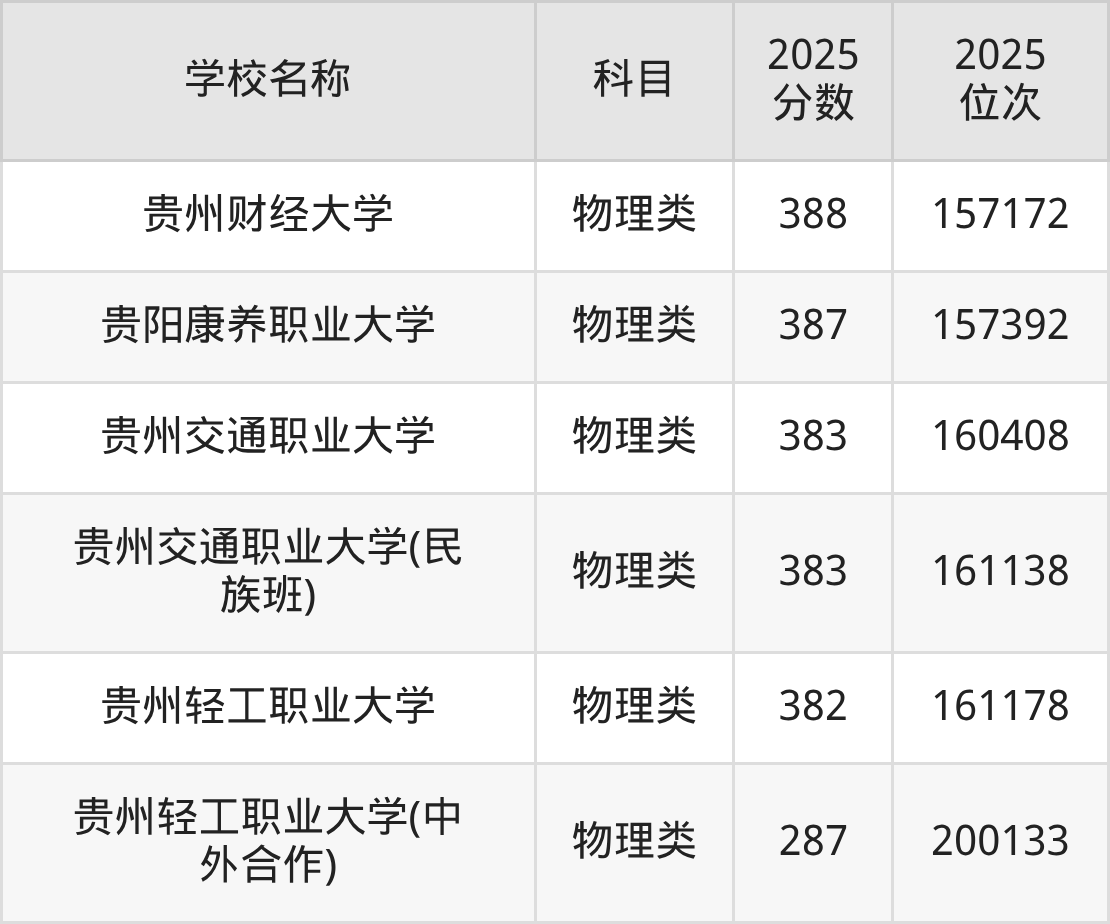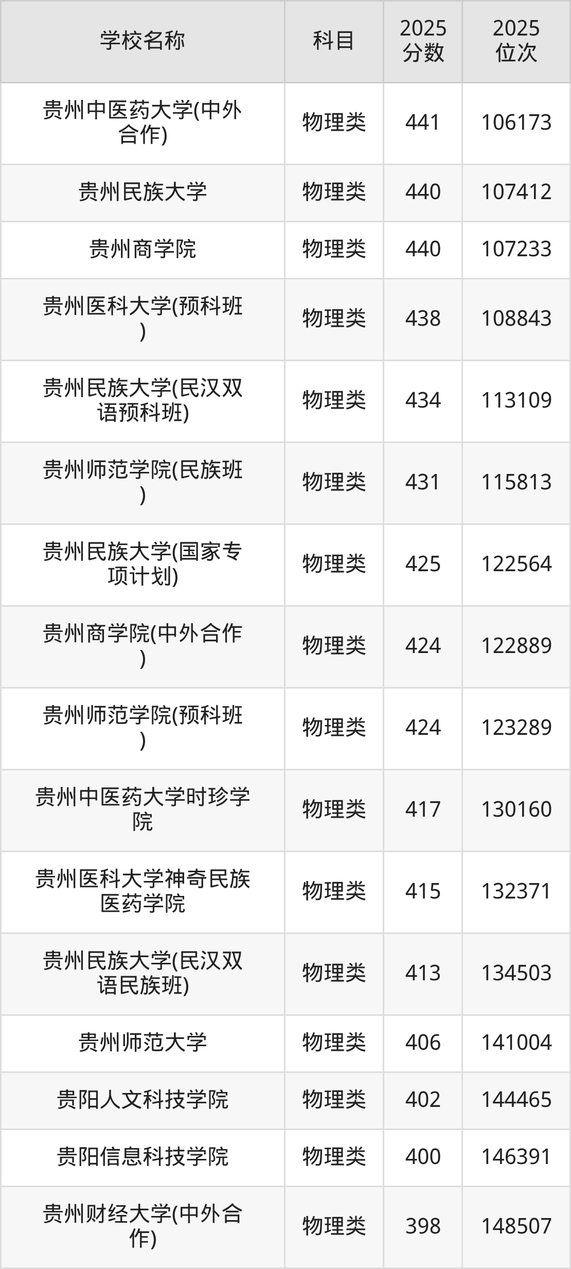 下文为2025年贵阳市本科大学在贵州物理类录取分数线和位次排名表,供大家参考: