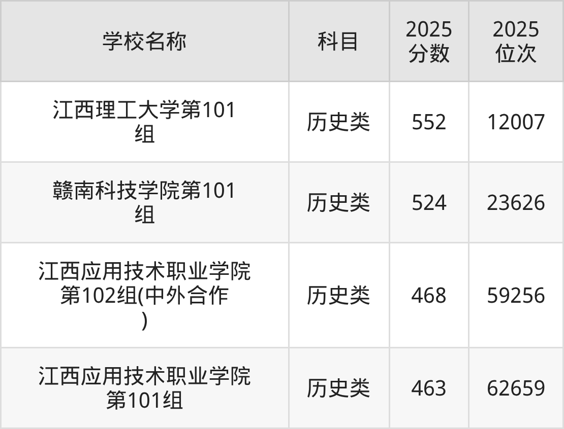 下文为2025年赣州市理工类大学在江西历史类录取分数线和位次排名表,供大家参考: