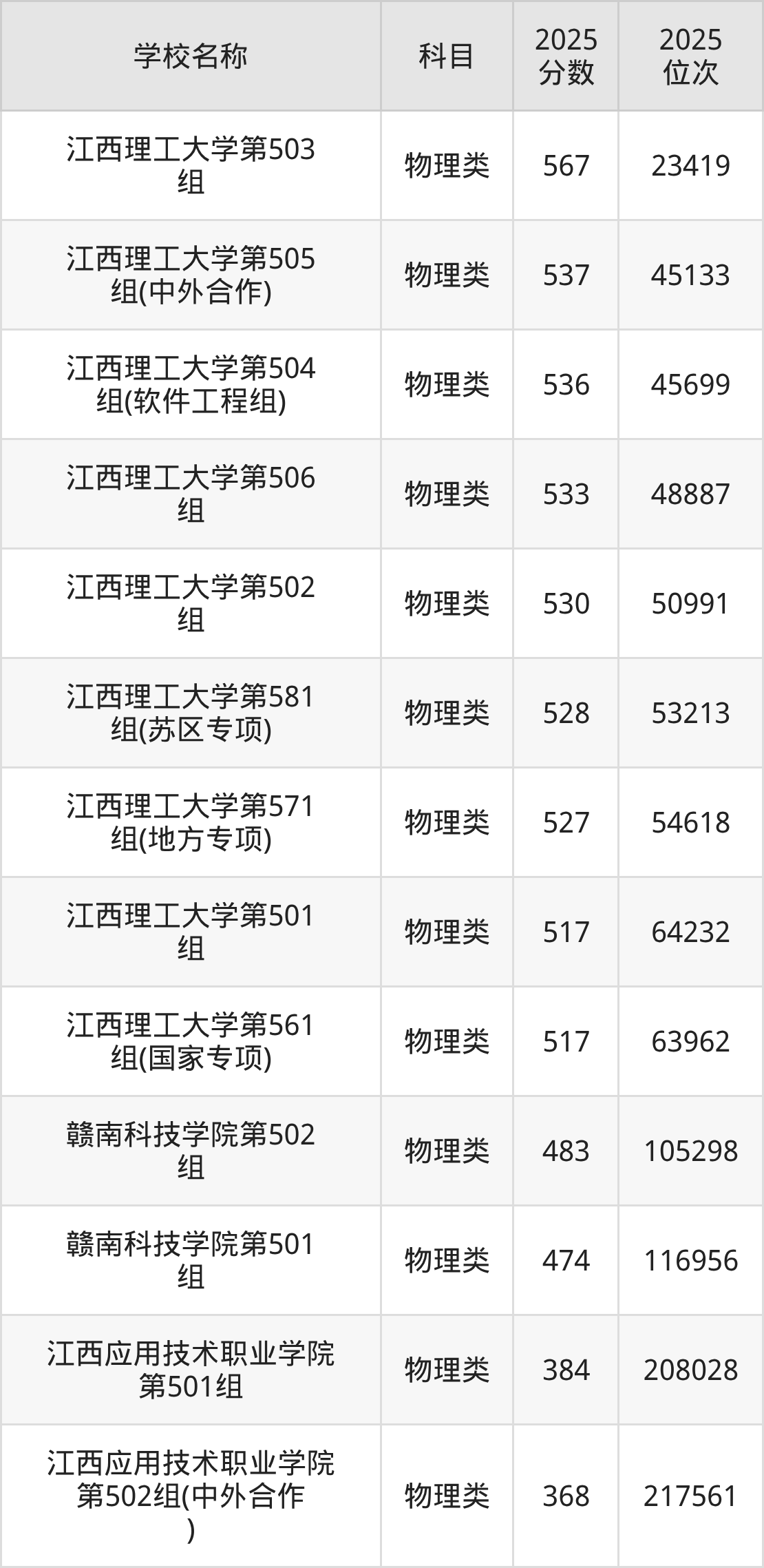 下文为2025年赣州市理工类大学在江西物理类录取分数线和位次排名表,供大家参考: