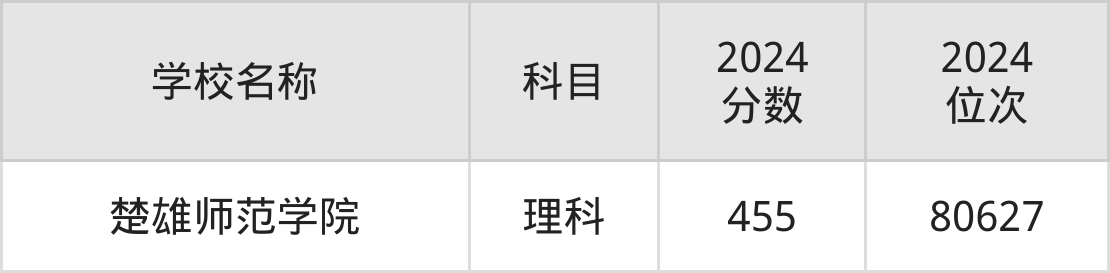 下文为2024年楚雄彝族自治州二本师范大学在云南理科录取分数线和位次排名表,供大家参考: