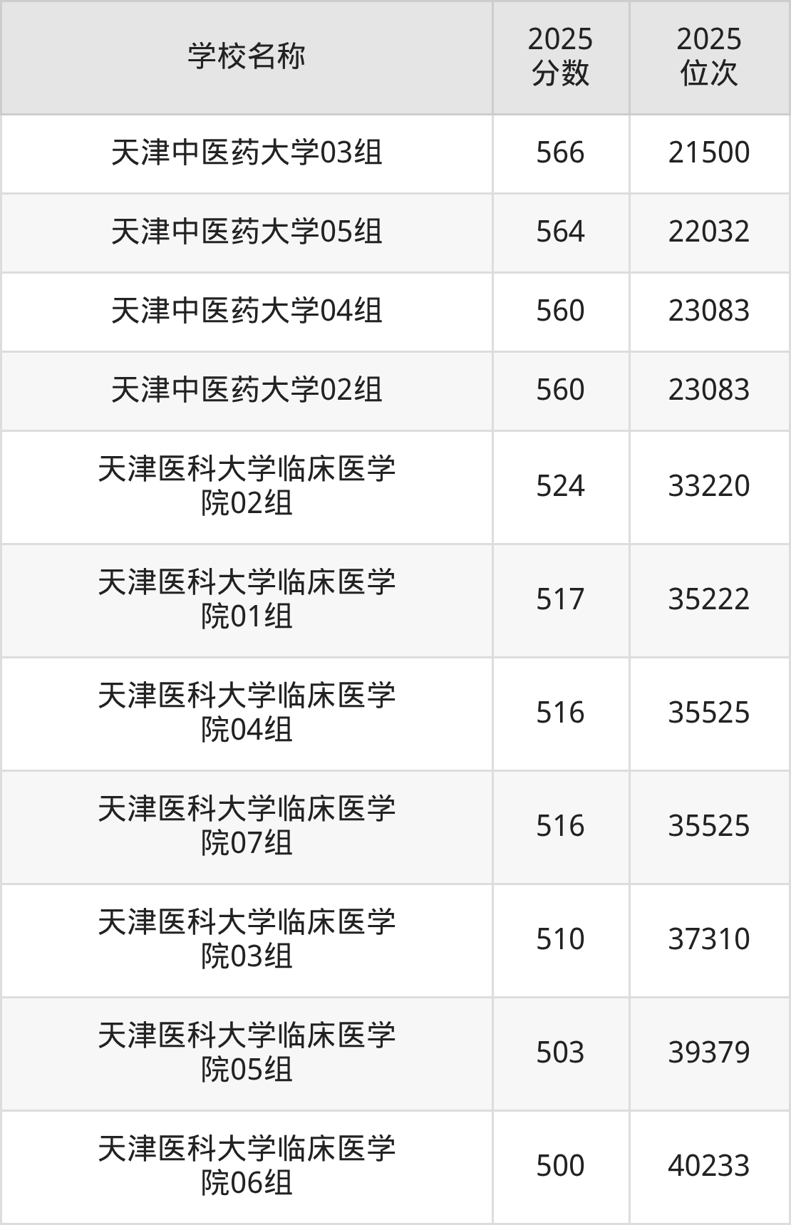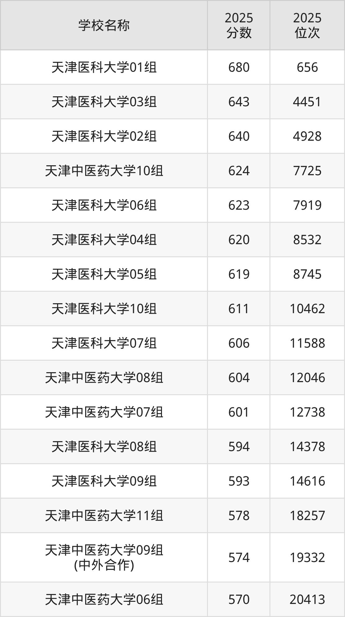 下文为2025年天津市医科大学在天津录取分数线和位次排名表,供大家参考:
