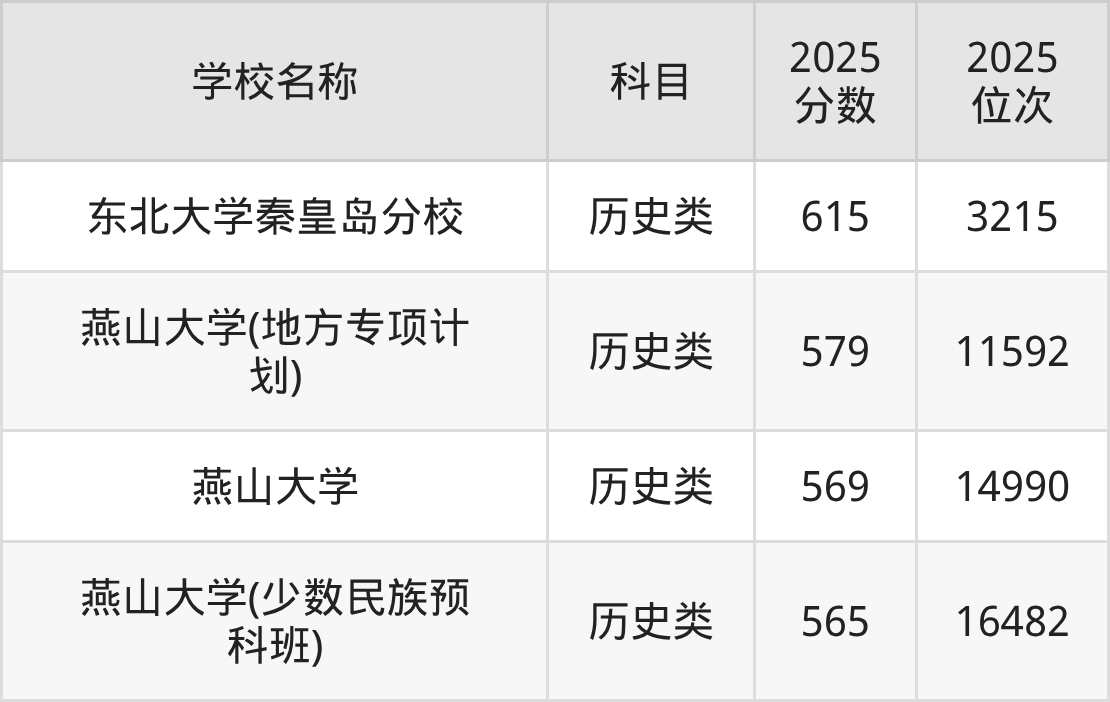 下文为2025年秦皇岛市一本大学在河北历史类录取分数线和位次排名表,供大家参考:
