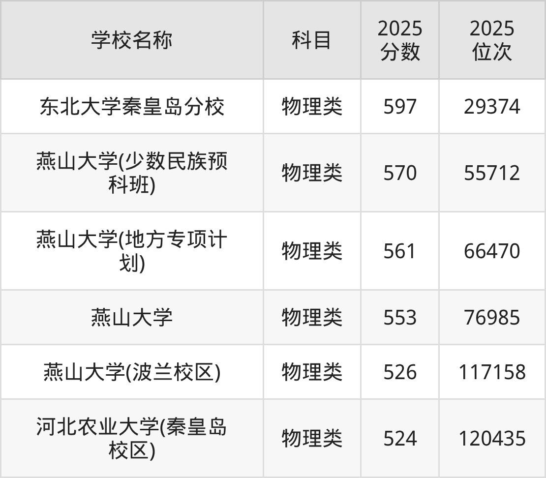 下文为2025年秦皇岛市一本大学在河北物理类录取分数线和位次排名表,供大家参考: