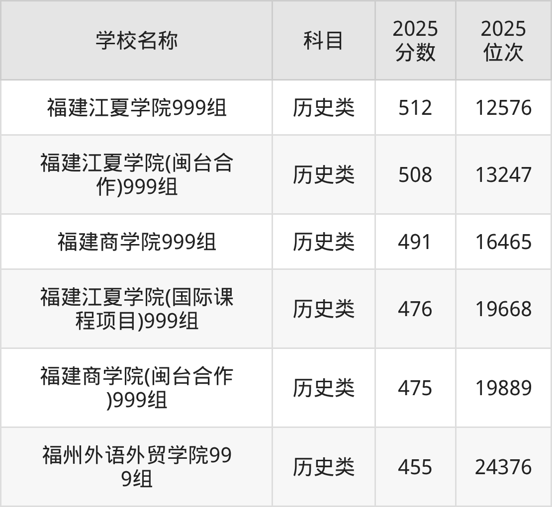 下文为2025年福州市财经类大学在福建历史类录取分数线和位次排名表,供大家参考: