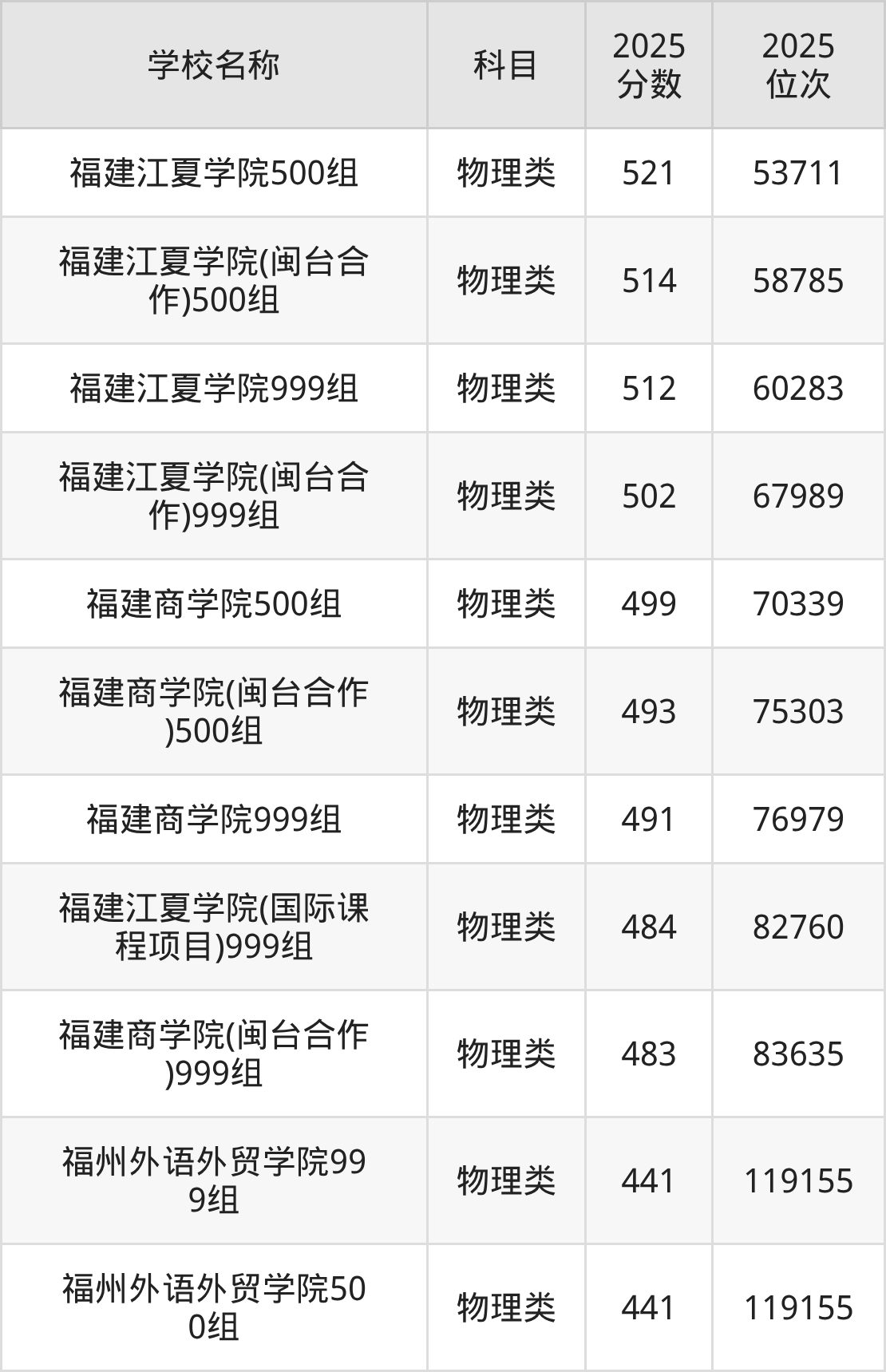 下文为2025年福州市财经类大学在福建物理类录取分数线和位次排名表,供大家参考: