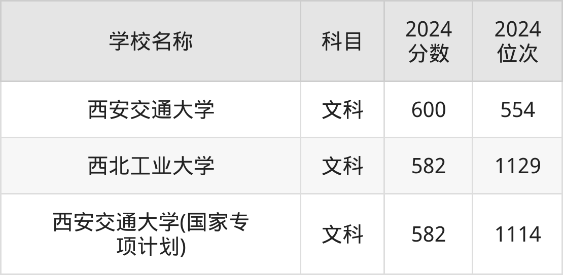 下文为2024年西安市985大学在陕西文科录取分数线和位次排名表,供大家参考:
