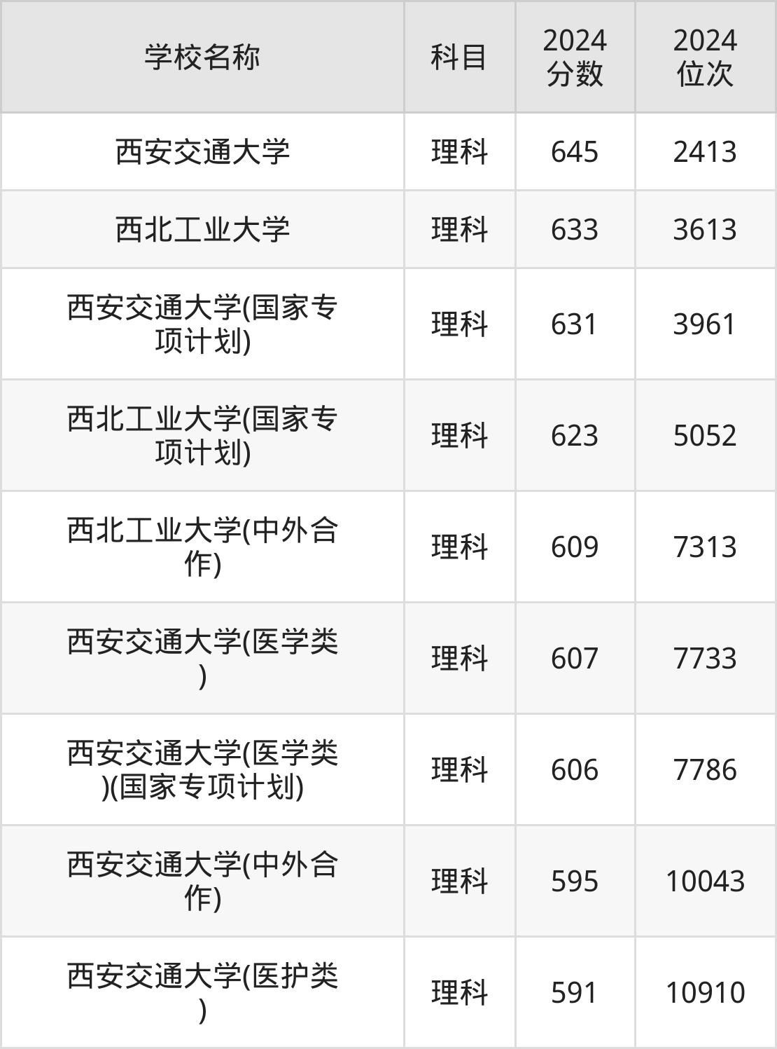 下文为2024年西安市985大学在陕西理科录取分数线和位次排名表,供大家参考: