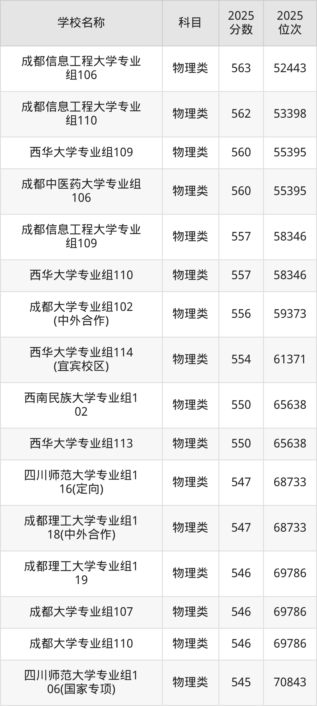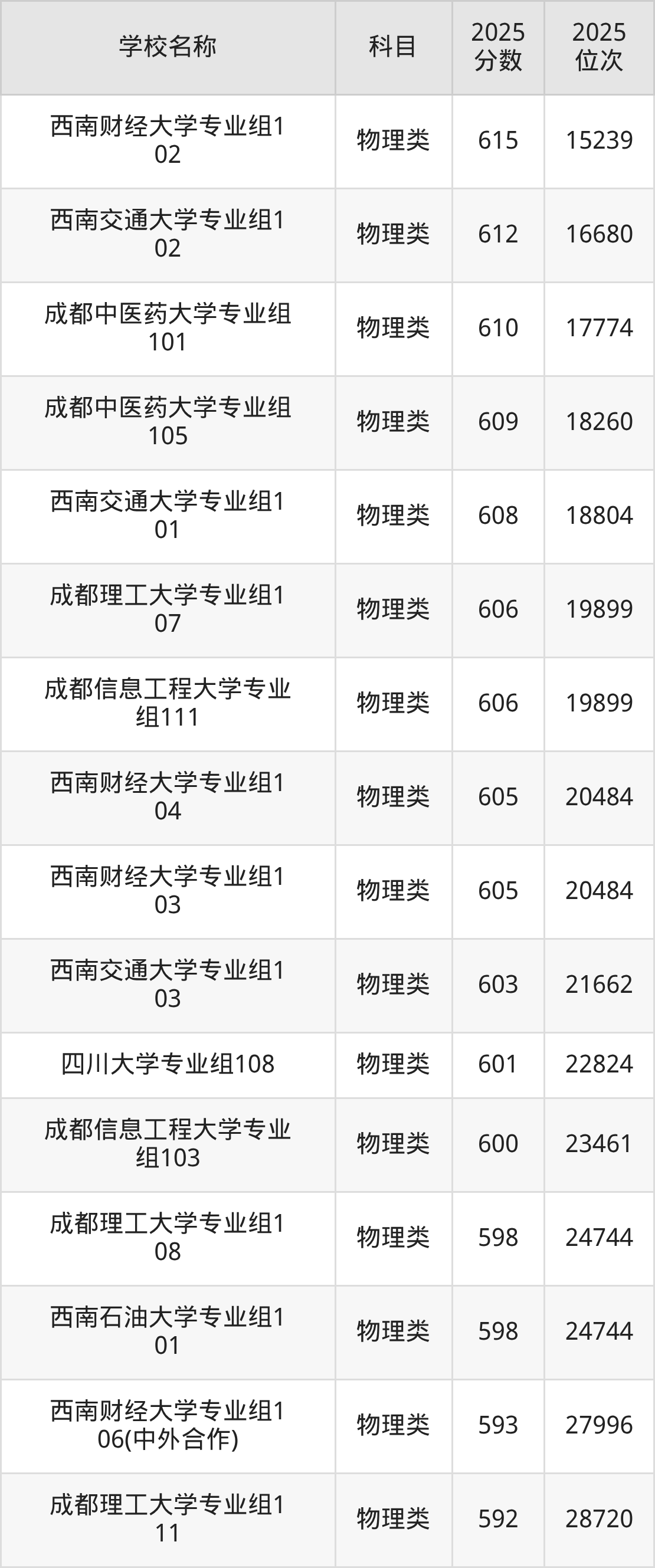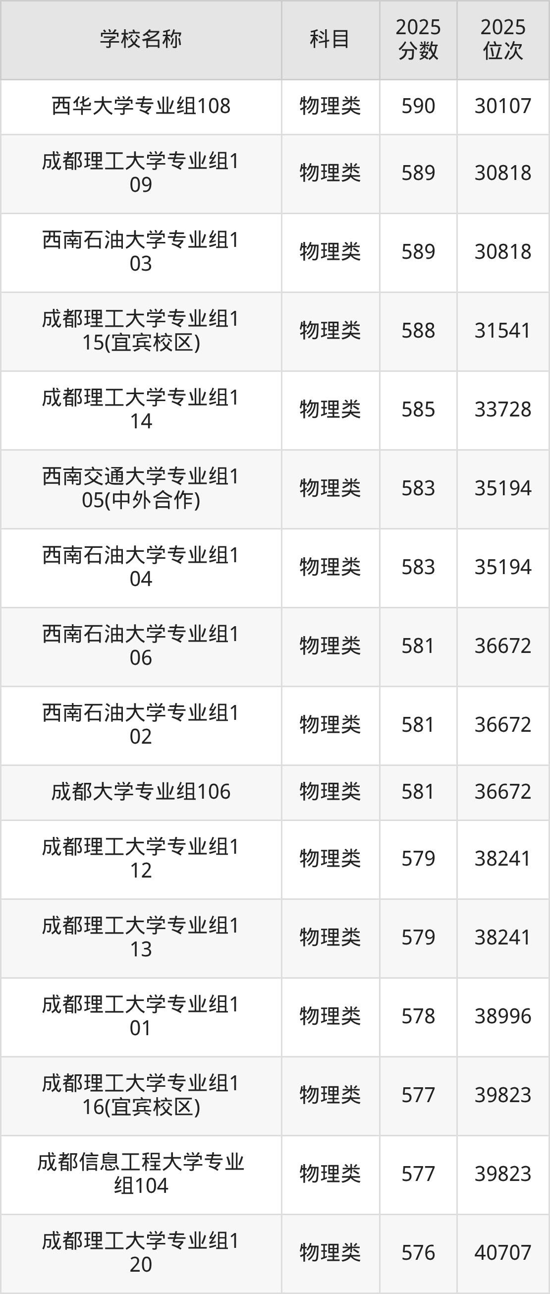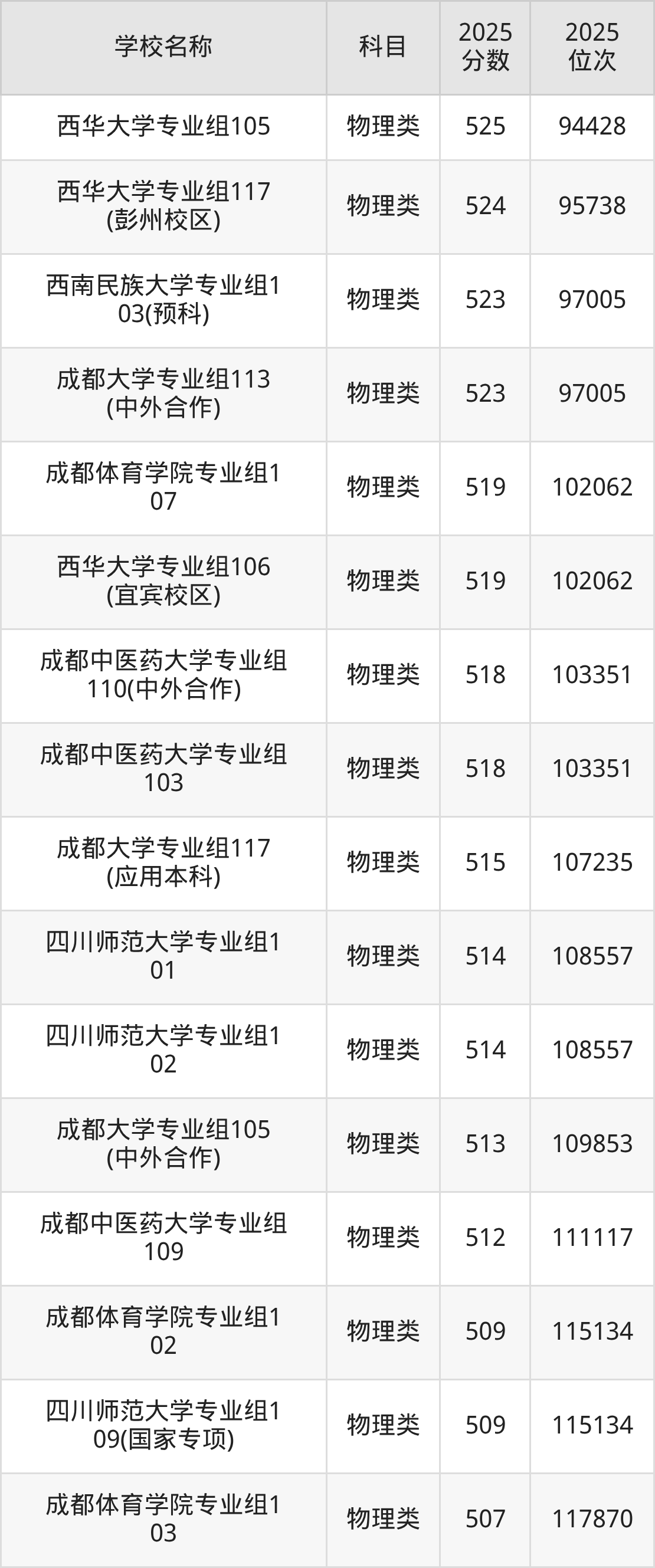 下文为2025年成都市含保研资格的大学在四川物理类录取分数线和位次排名表,供大家参考: