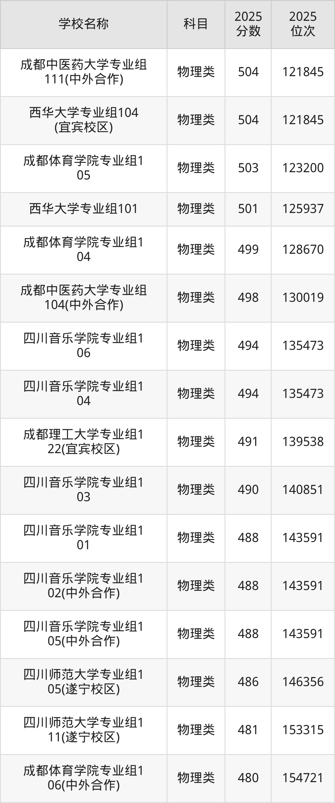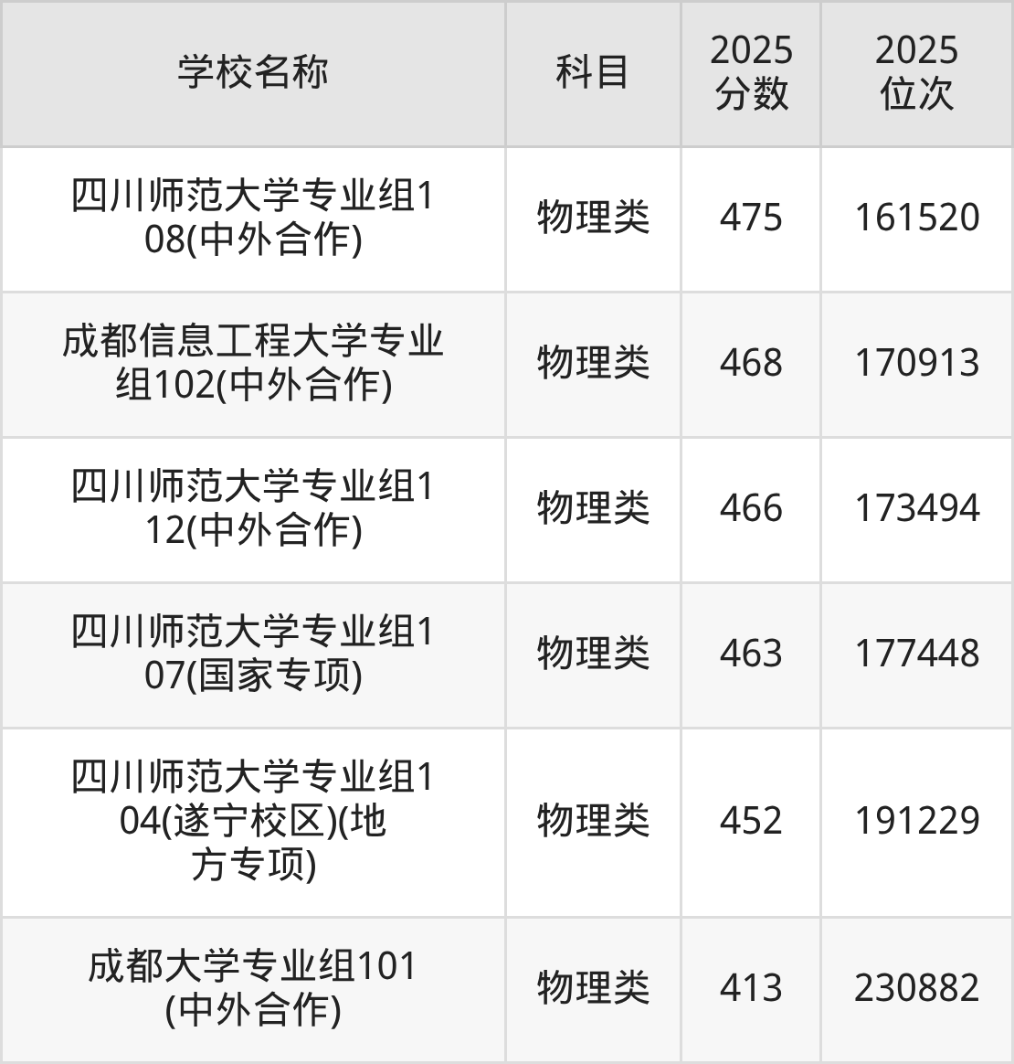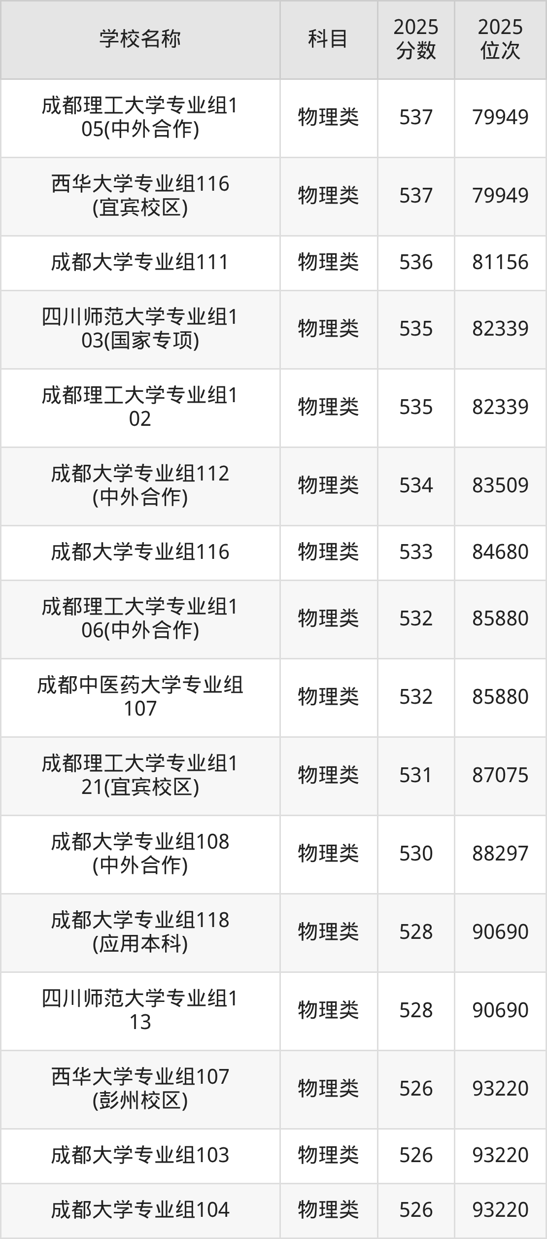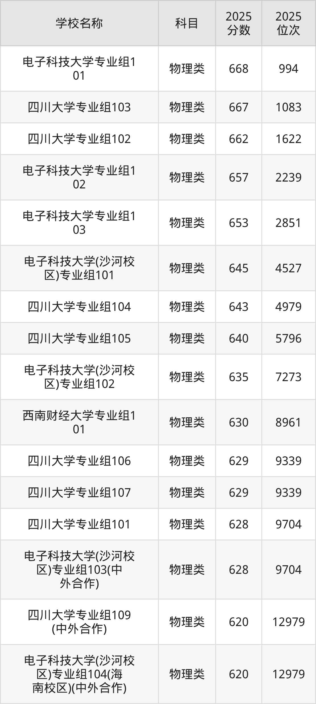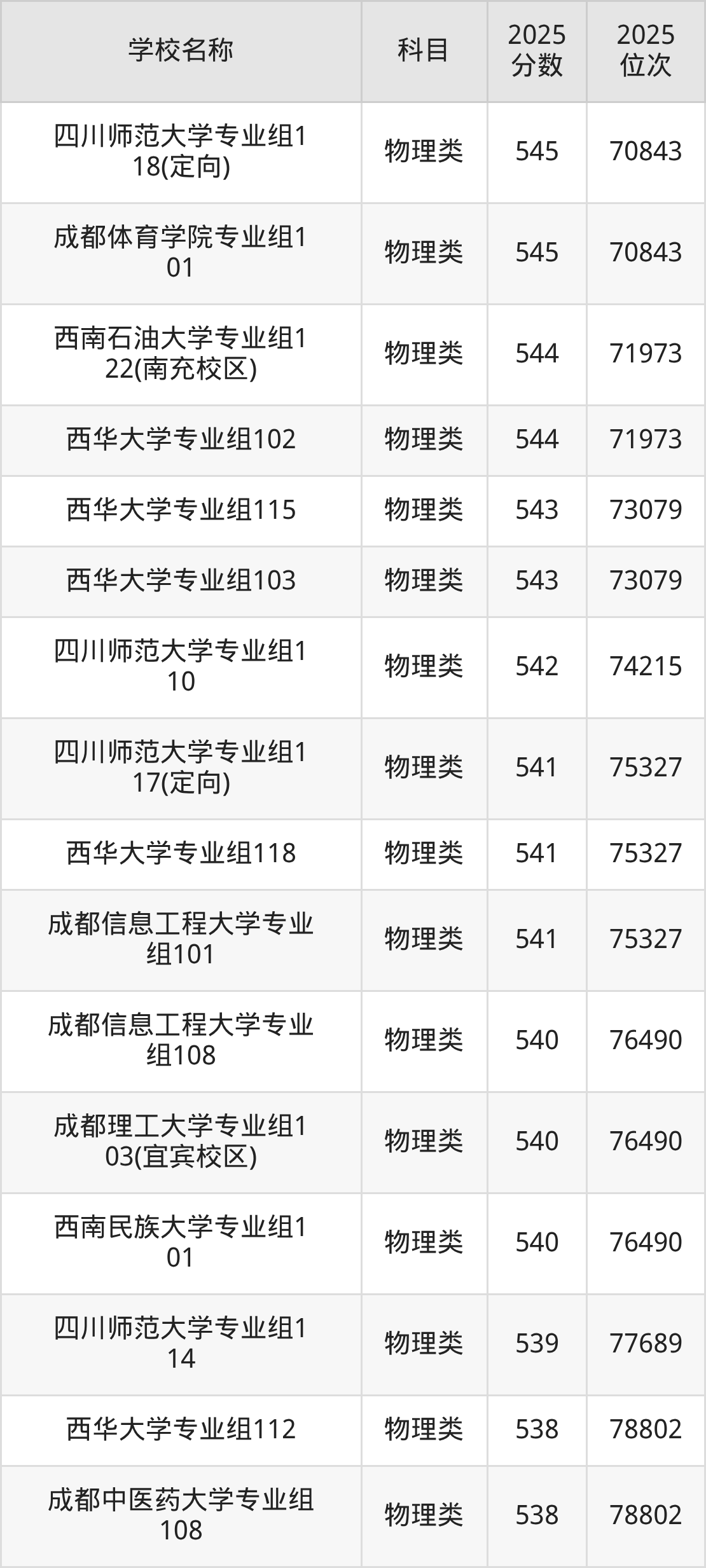 下文为2025年成都市含保研资格的大学在四川物理类录取分数线和位次排名表,供大家参考: