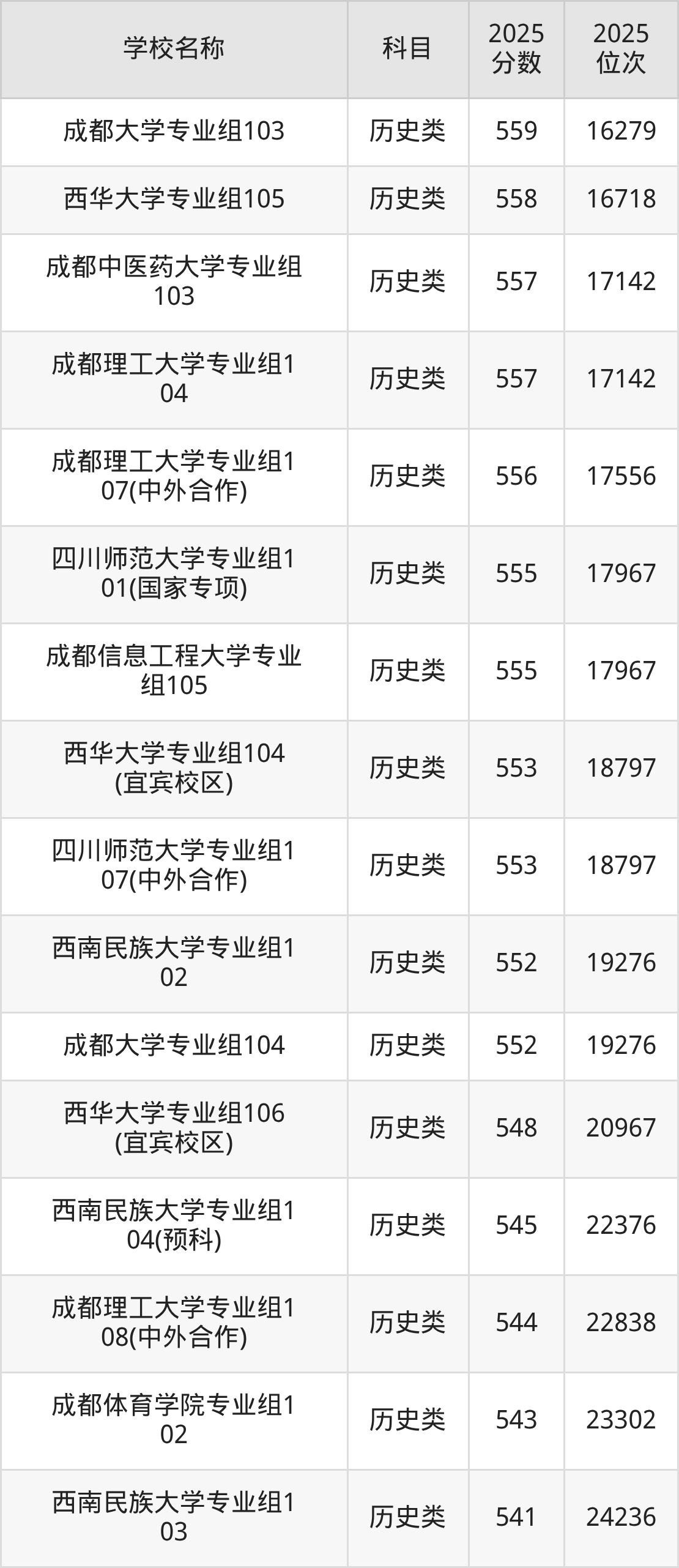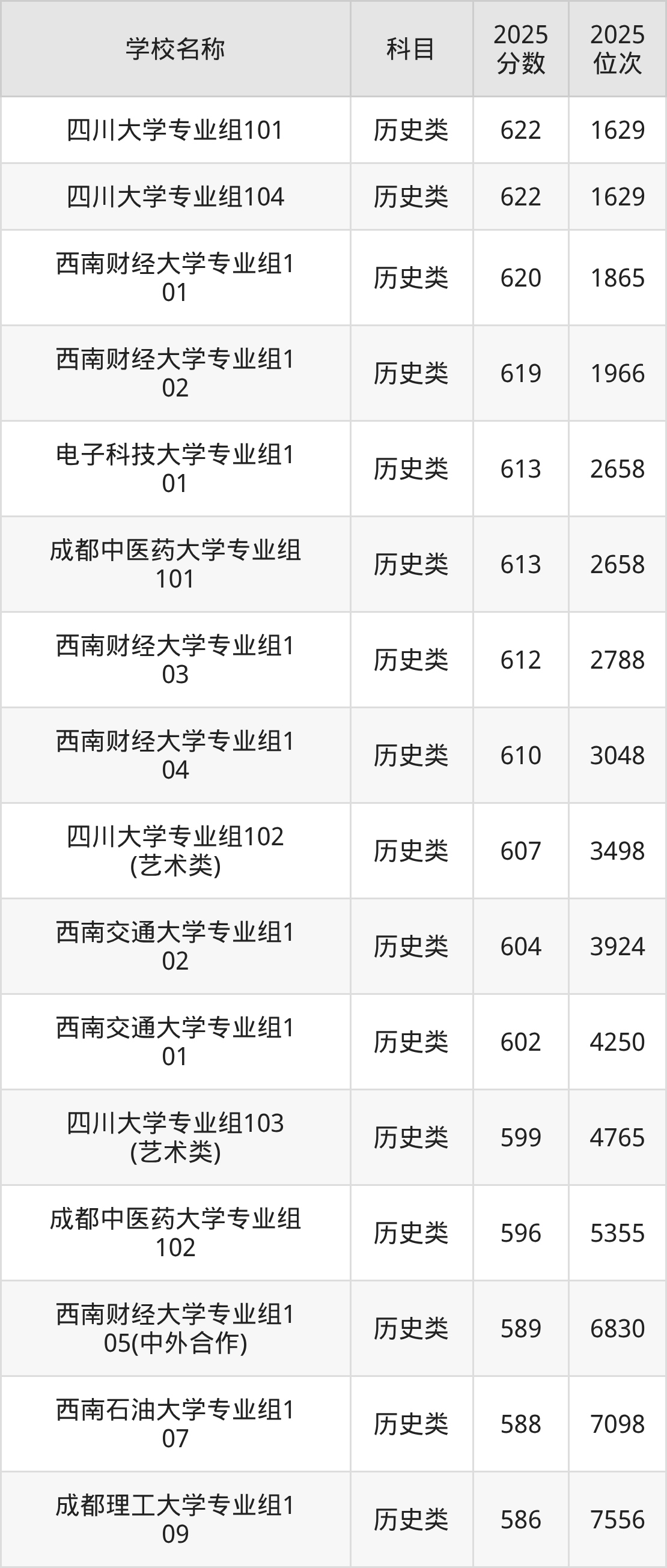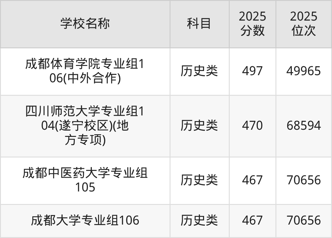 下文为2025年成都市含保研资格的大学在四川历史类录取分数线和位次排名表,供大家参考: