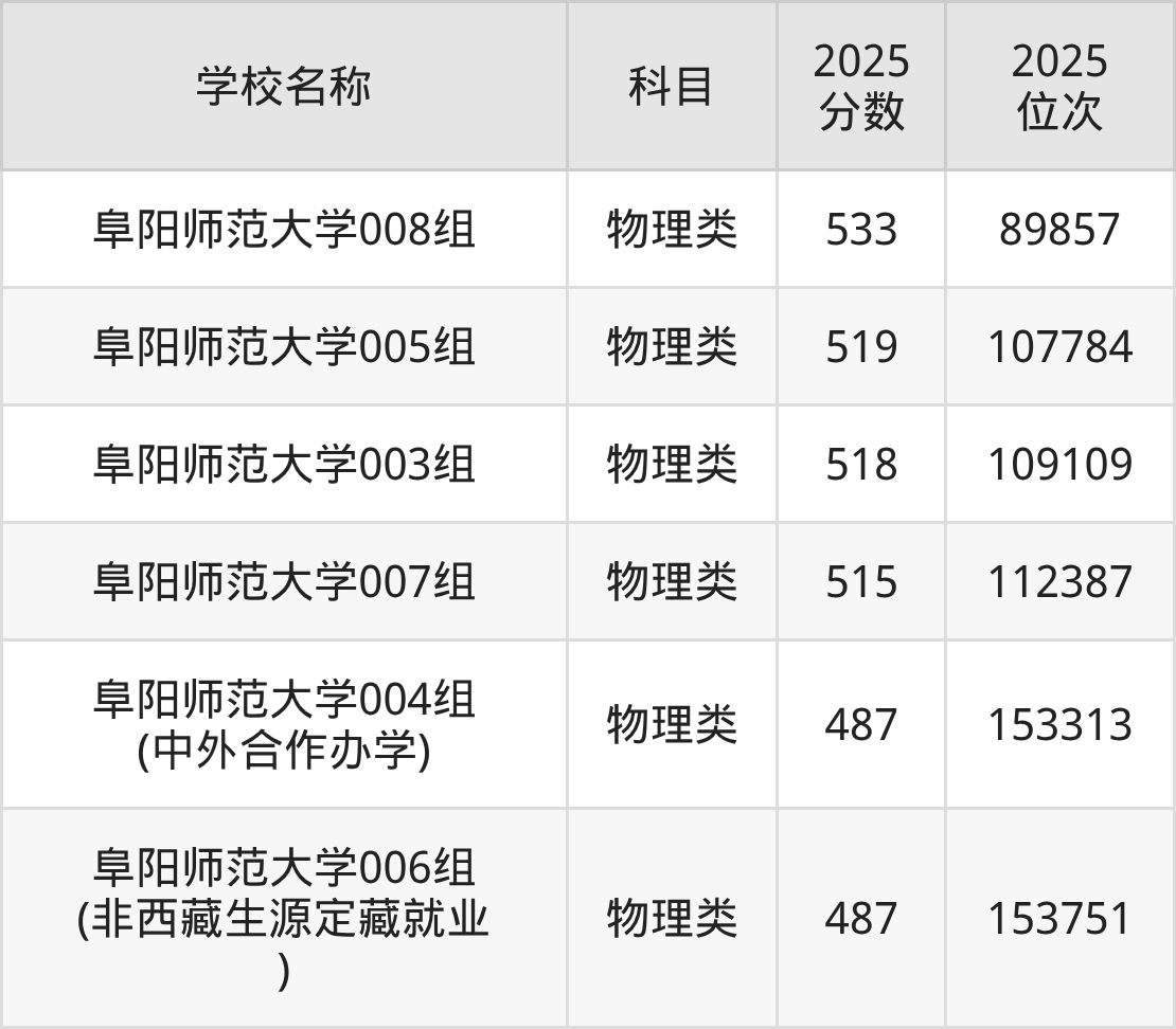 下文为2025年阜阳市一本大学在安徽物理类录取分数线和位次排名表,供大家参考: