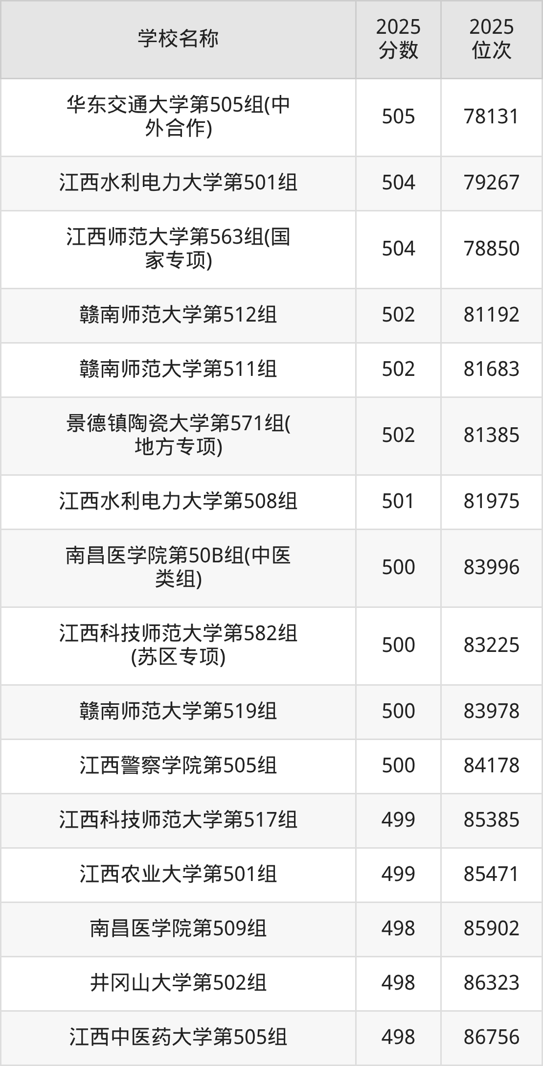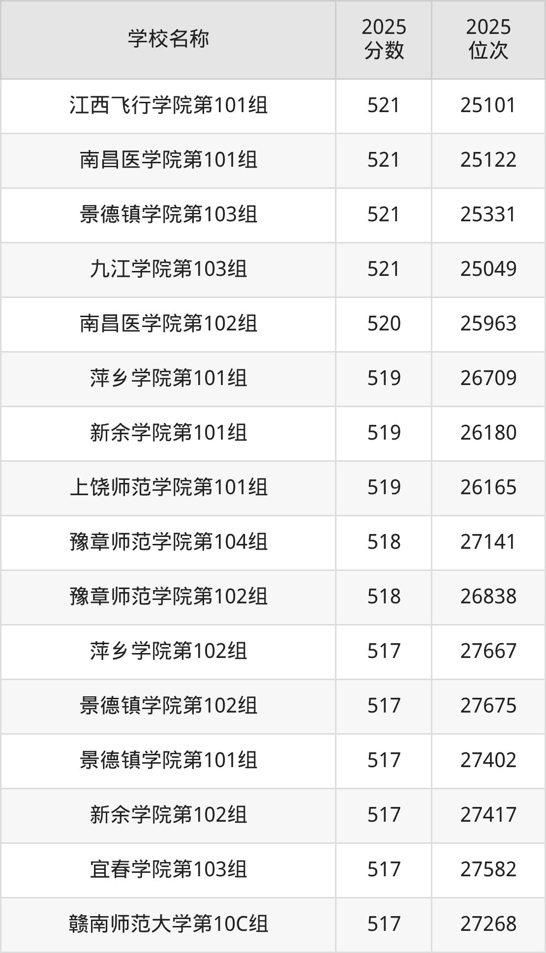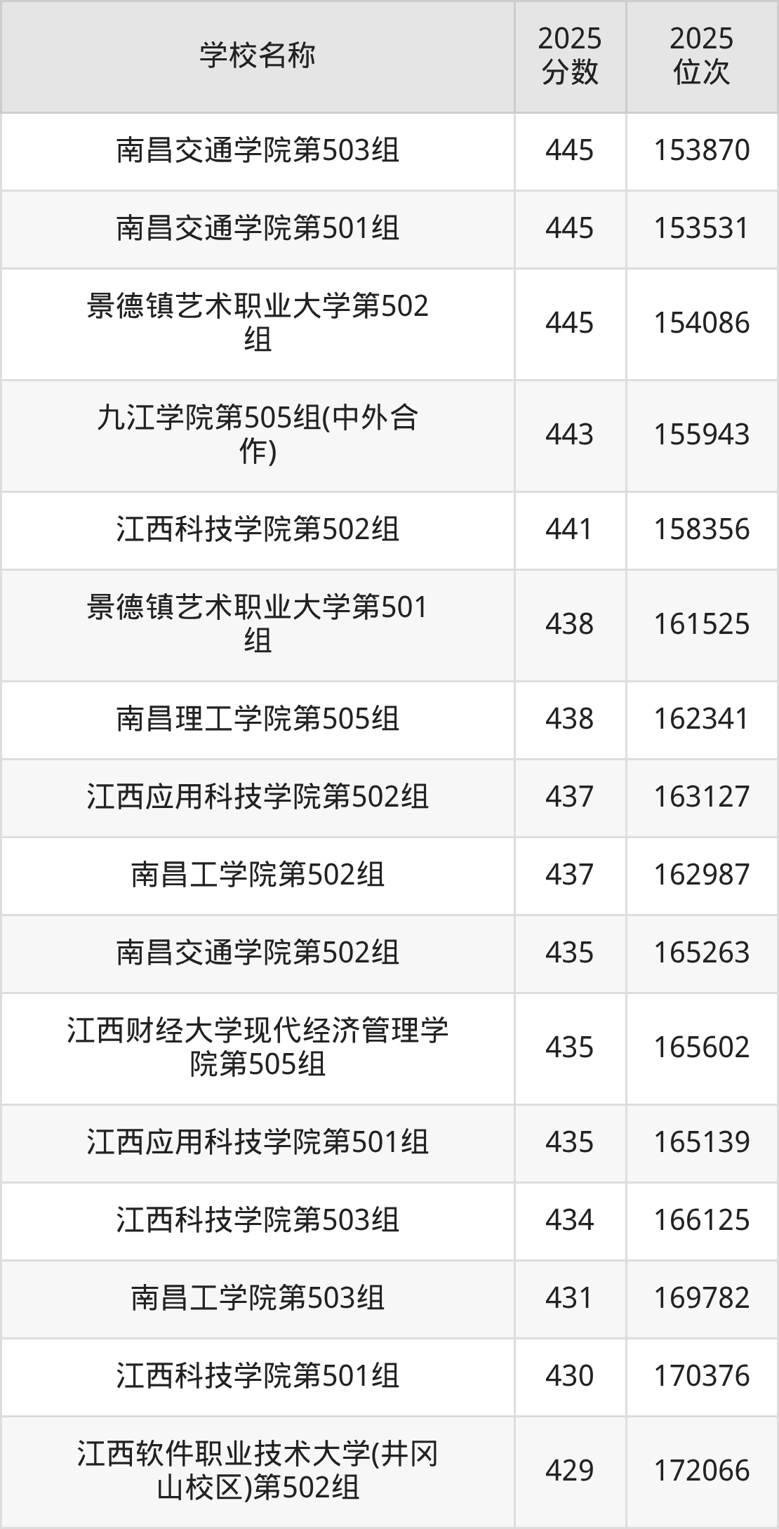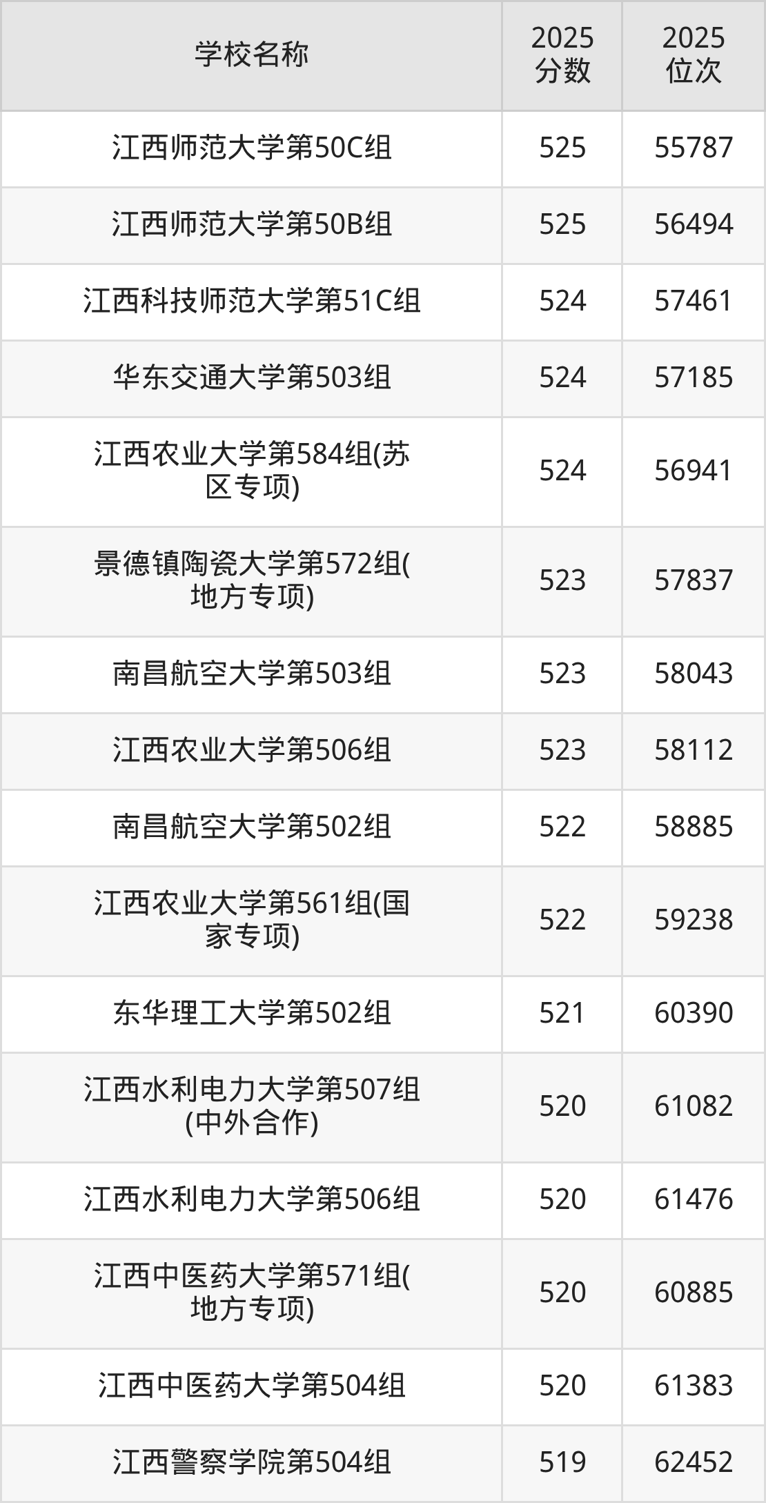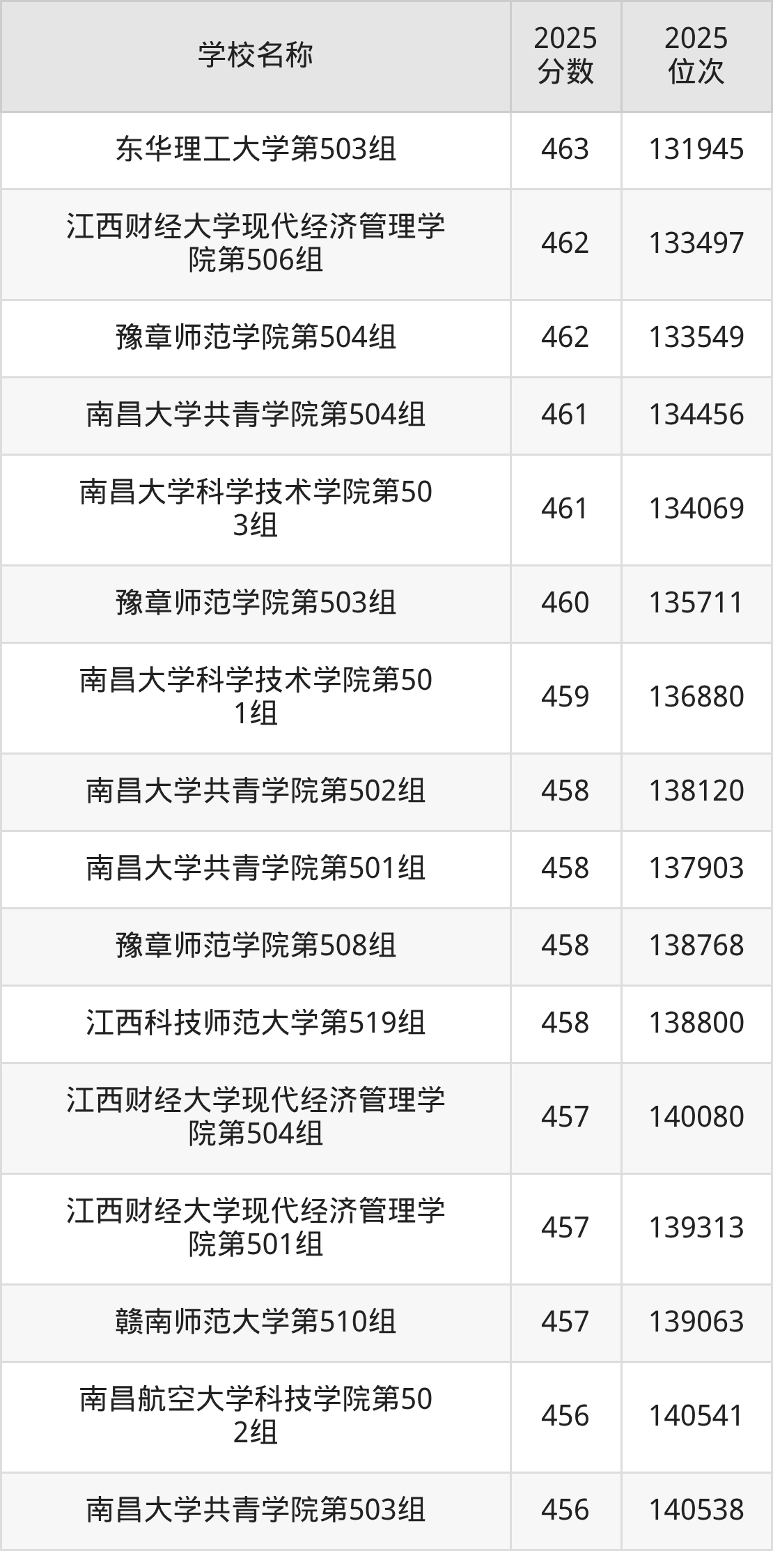 下文为2025年江西省本科大学在江西物理类录取分数线和位次排名表,供大家参考: