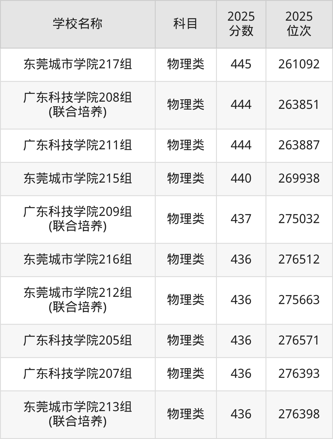 下文为2025年东莞市本科大学在广东物理类录取分数线和位次排名表,供大家参考: