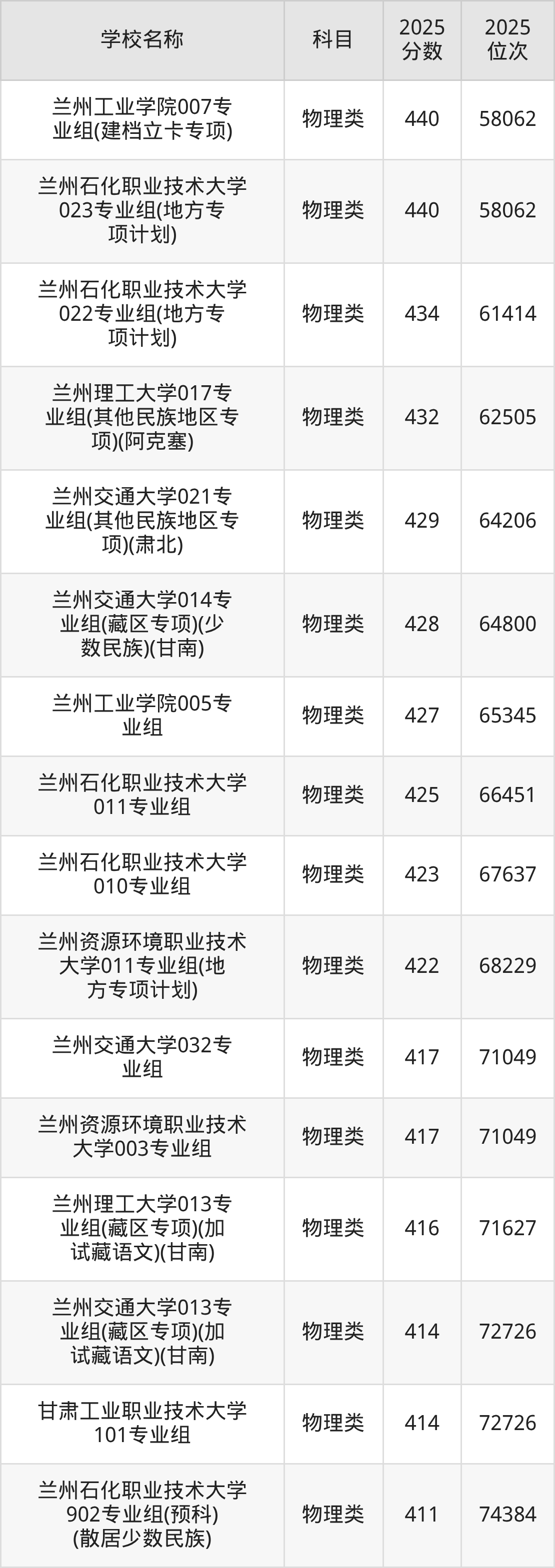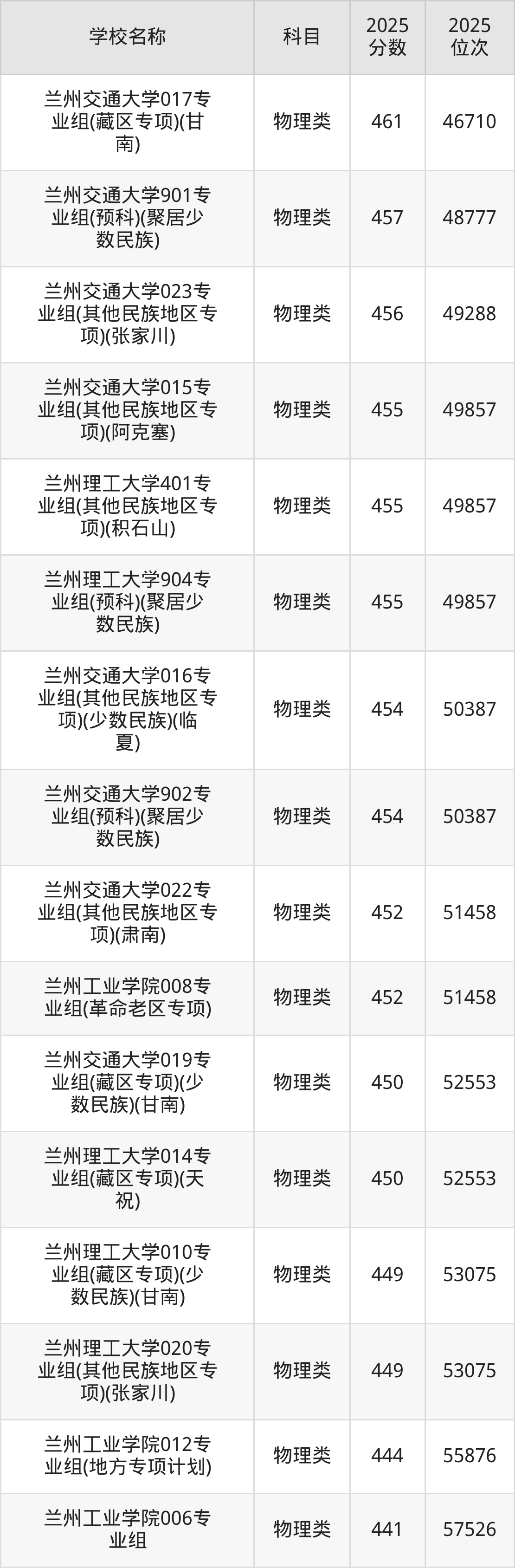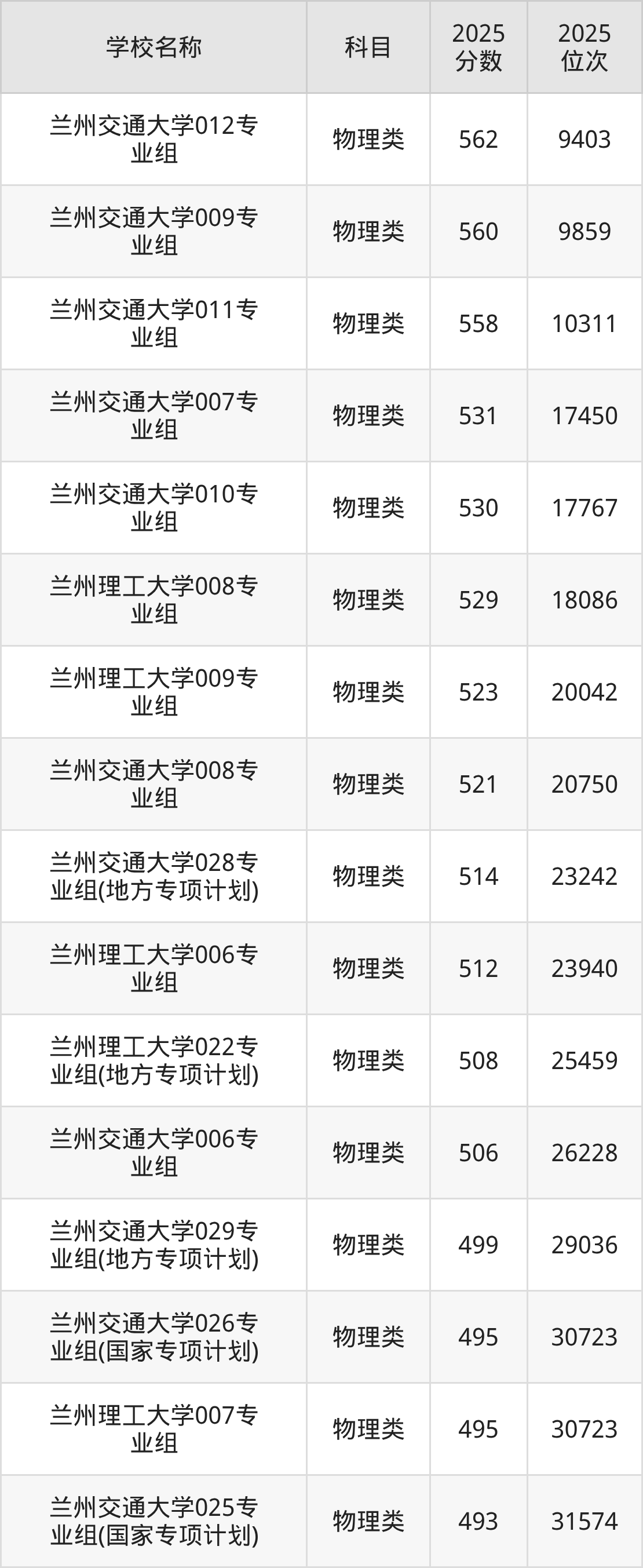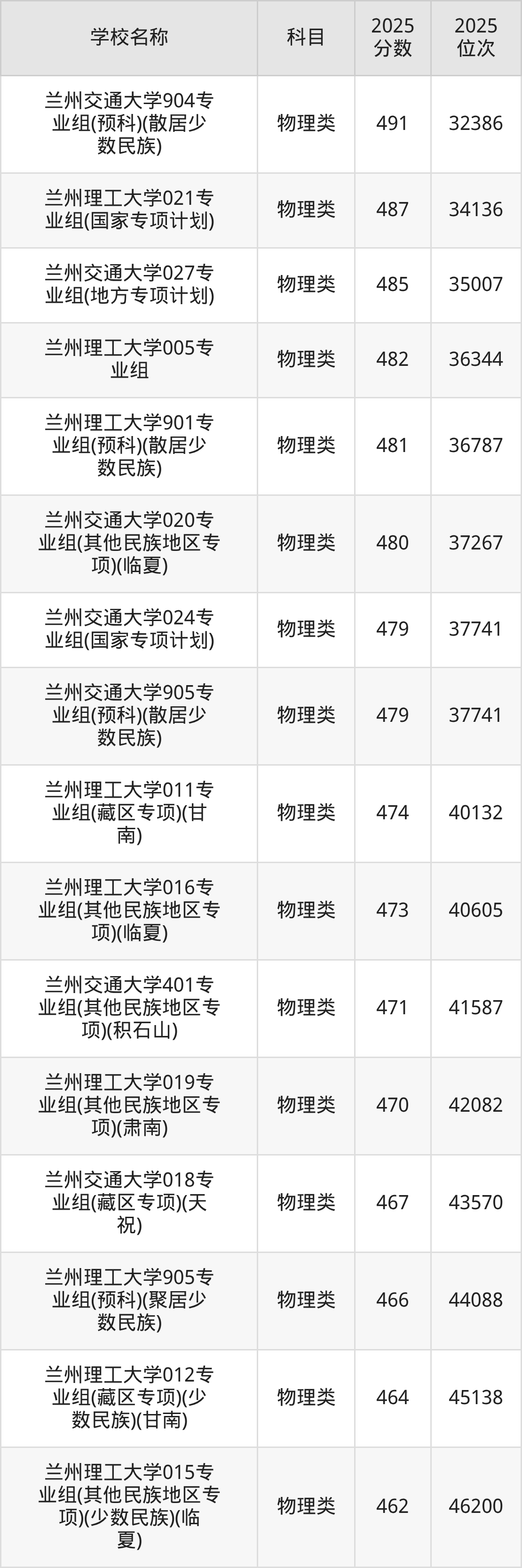 下文为2025年甘肃省理工类大学在甘肃物理类录取分数线和位次排名表,供大家参考: