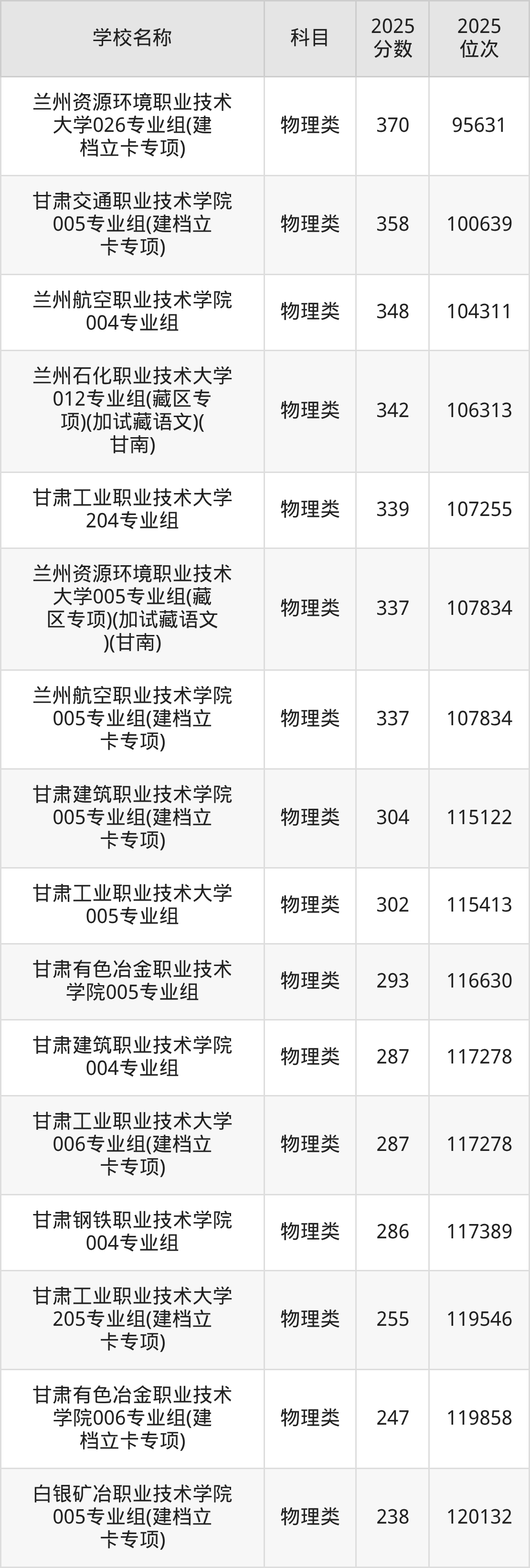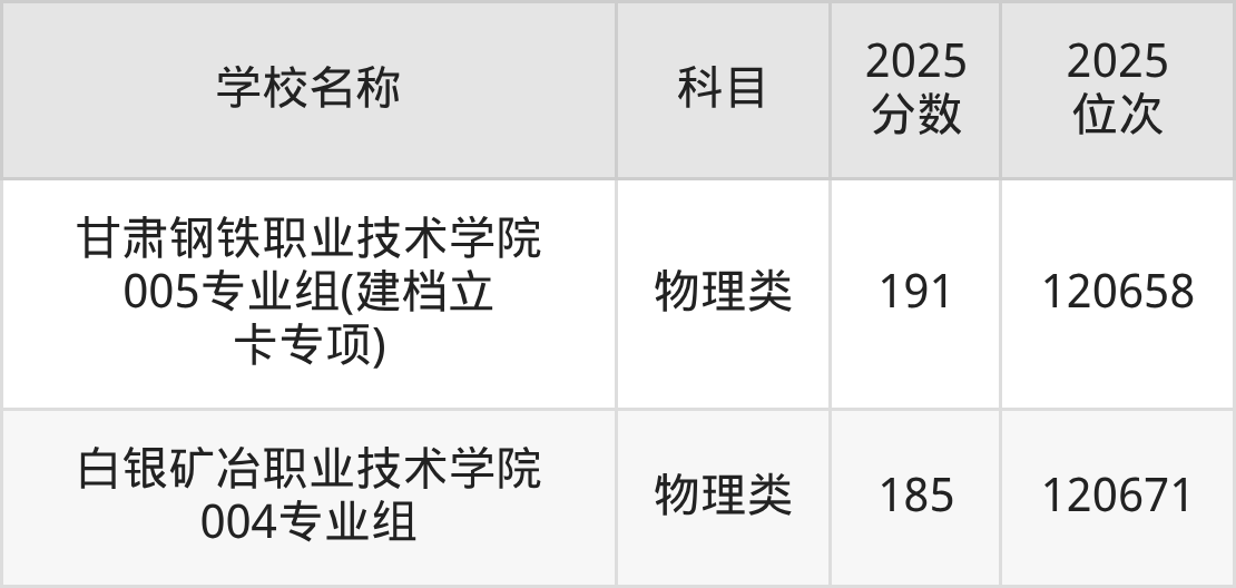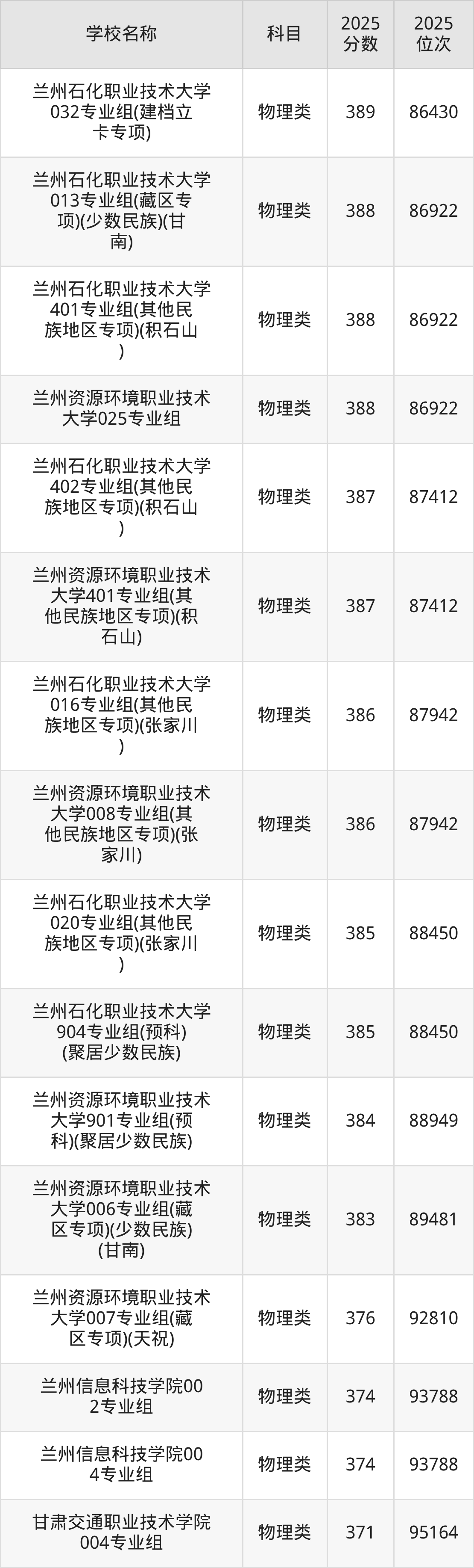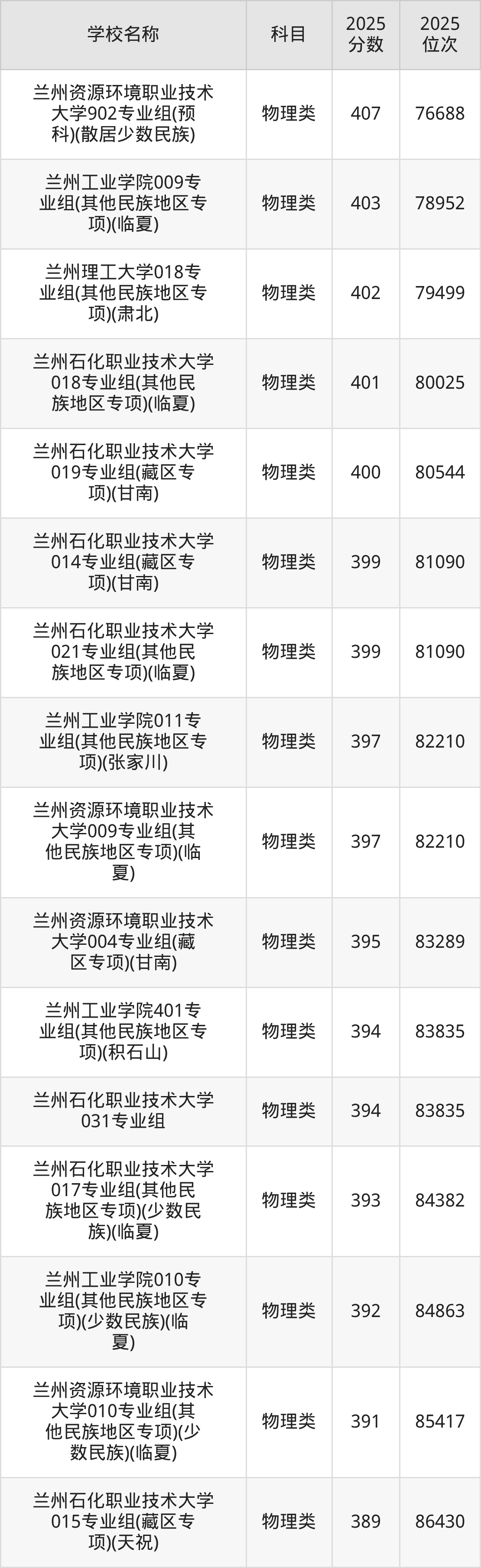 下文为2025年甘肃省理工类大学在甘肃物理类录取分数线和位次排名表,供大家参考: