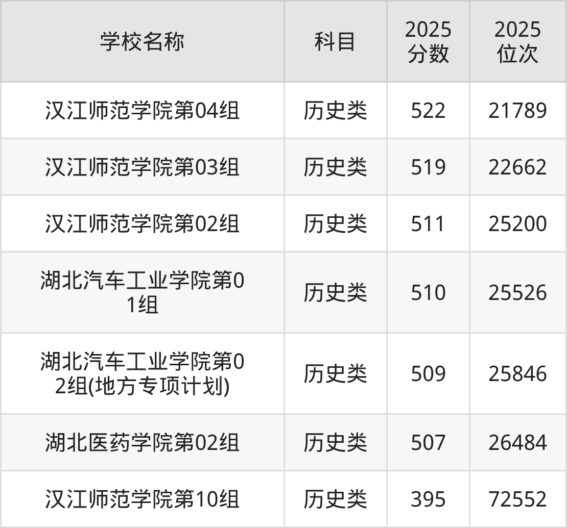 下文为2025年十堰市公办二本大学在湖北历史类录取分数线和位次排名表,供大家参考: