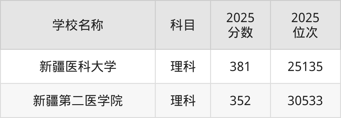 下文为2025年新疆维吾尔自治区医科大学在新疆理科录取分数线和位次排名表,供大家参考: