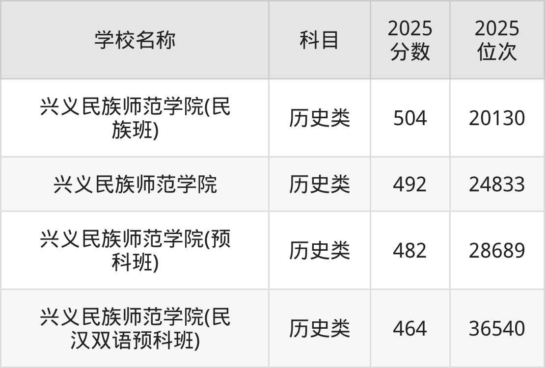下文为2025年黔西南布依族苗族自治州本科大学在贵州历史类录取分数线和位次排名表,供大家参考: