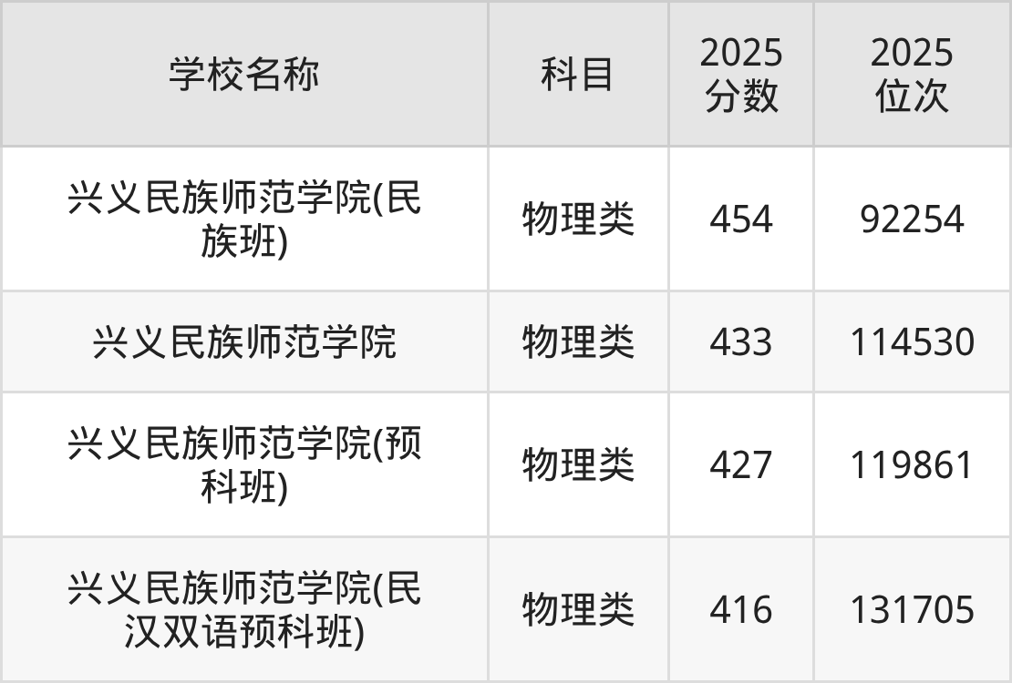 下文为2025年黔西南布依族苗族自治州本科大学在贵州物理类录取分数线和位次排名表,供大家参考: