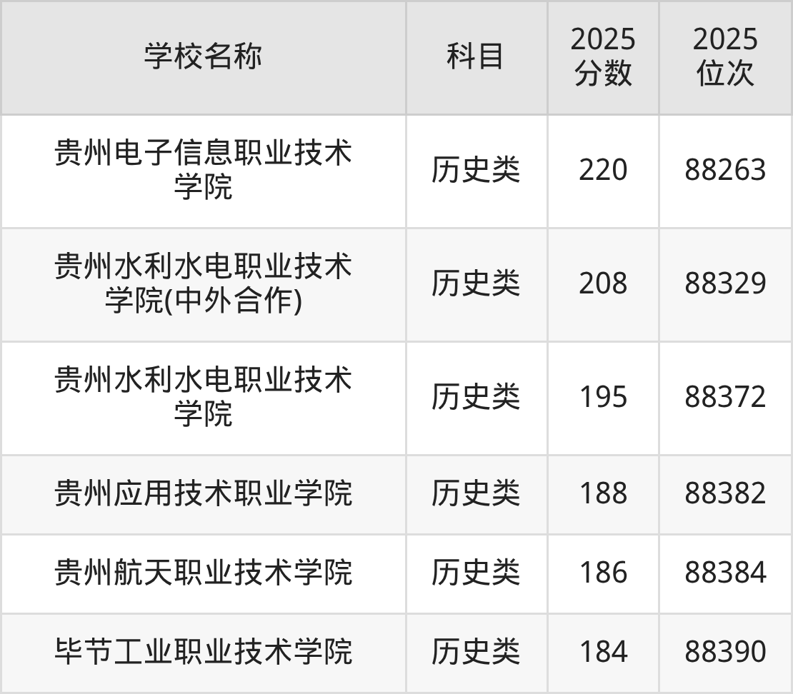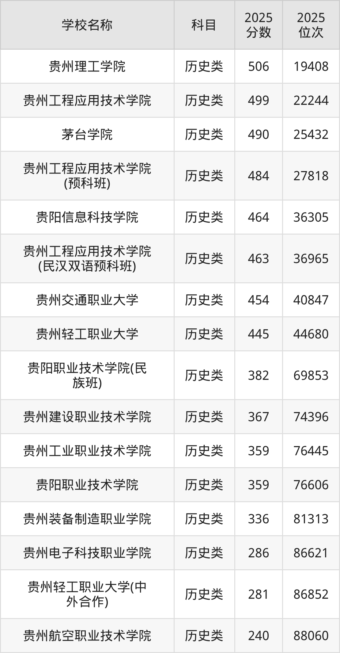 下文为2025年贵州省理工类大学在贵州历史类录取分数线和位次排名表,供大家参考: