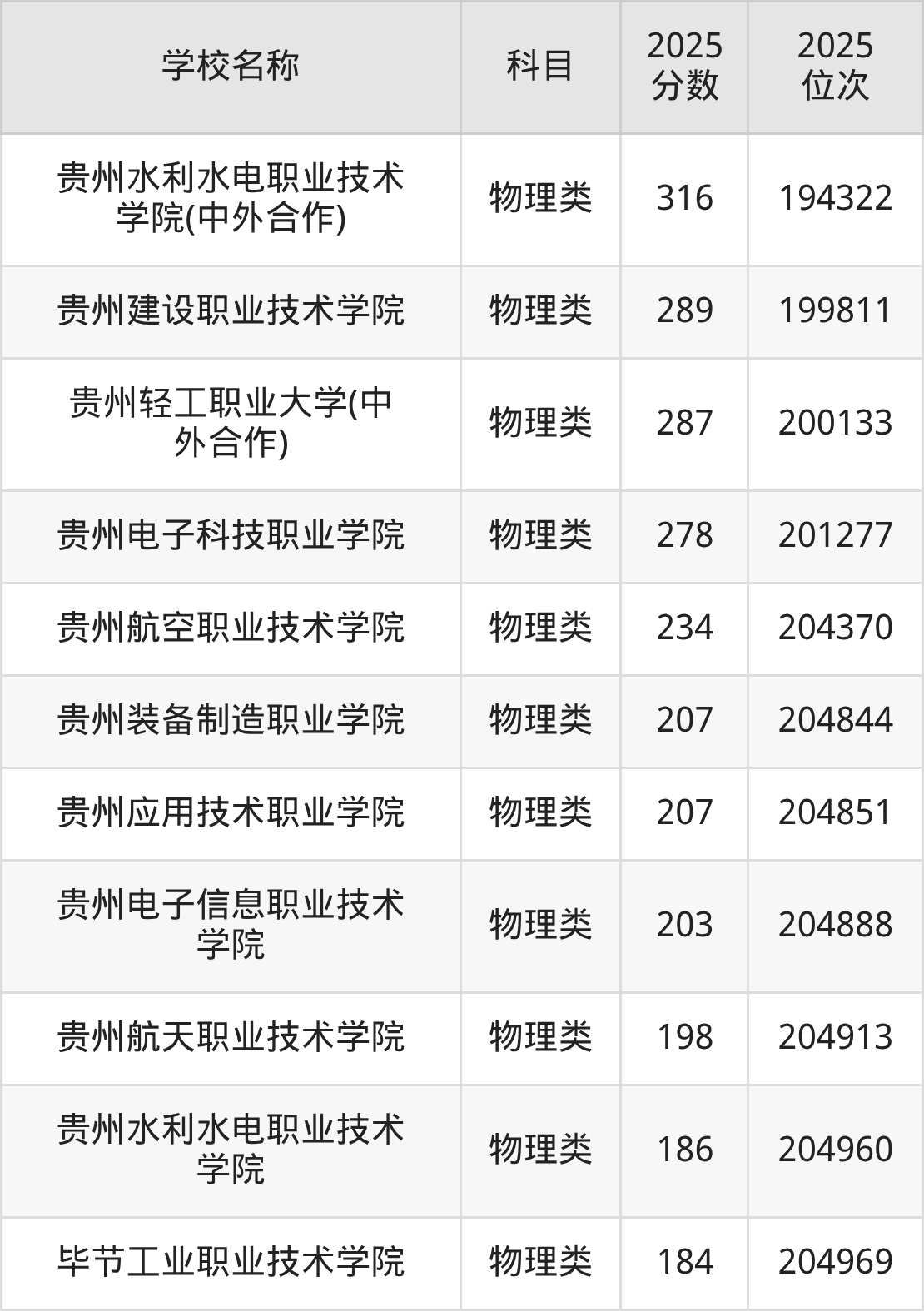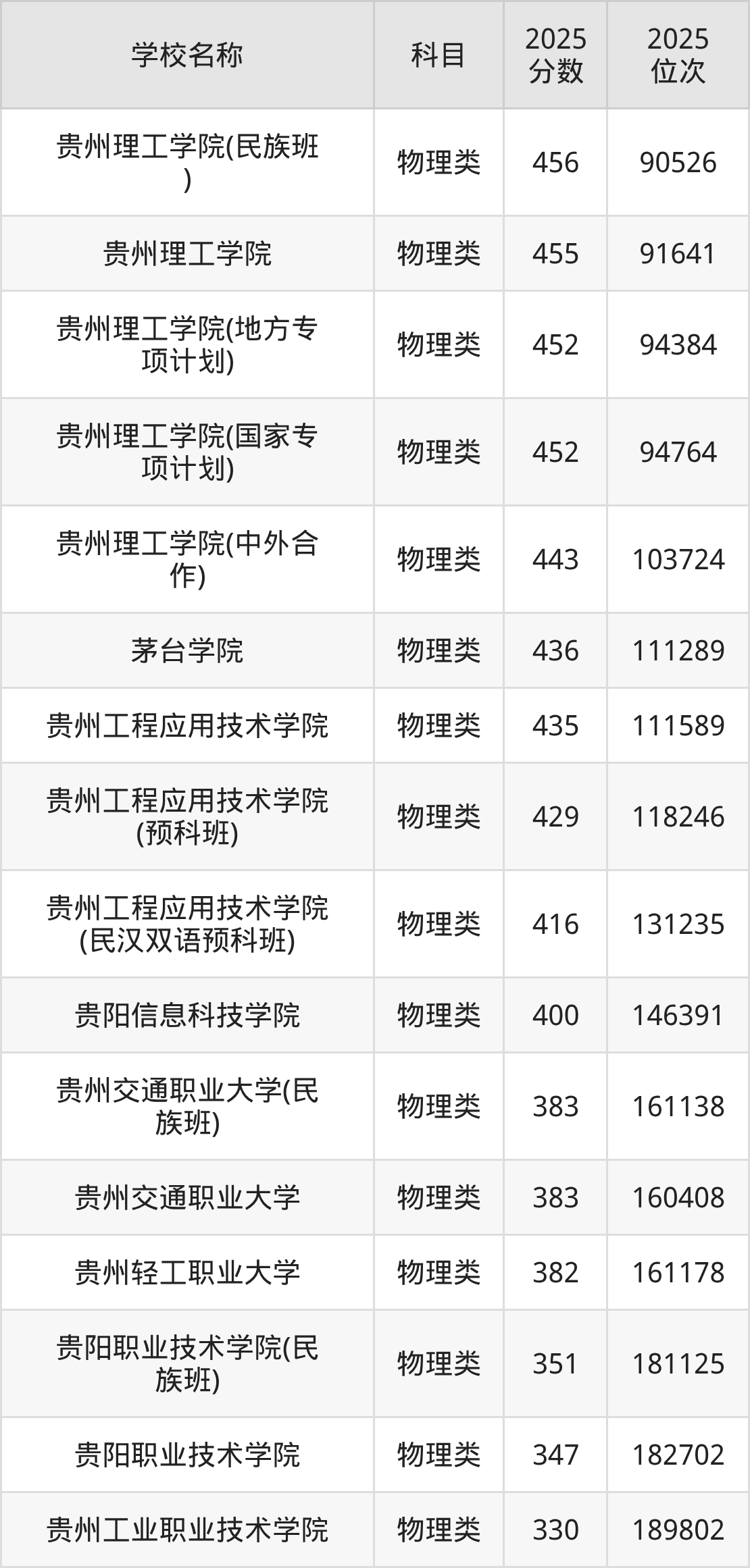 下文为2025年贵州省理工类大学在贵州物理类录取分数线和位次排名表,供大家参考: