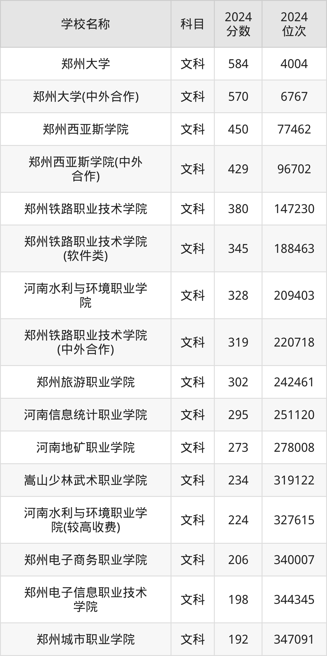 下文为2024年郑州市综合类大学在河南文科录取分数线和位次排名表,供大家参考: