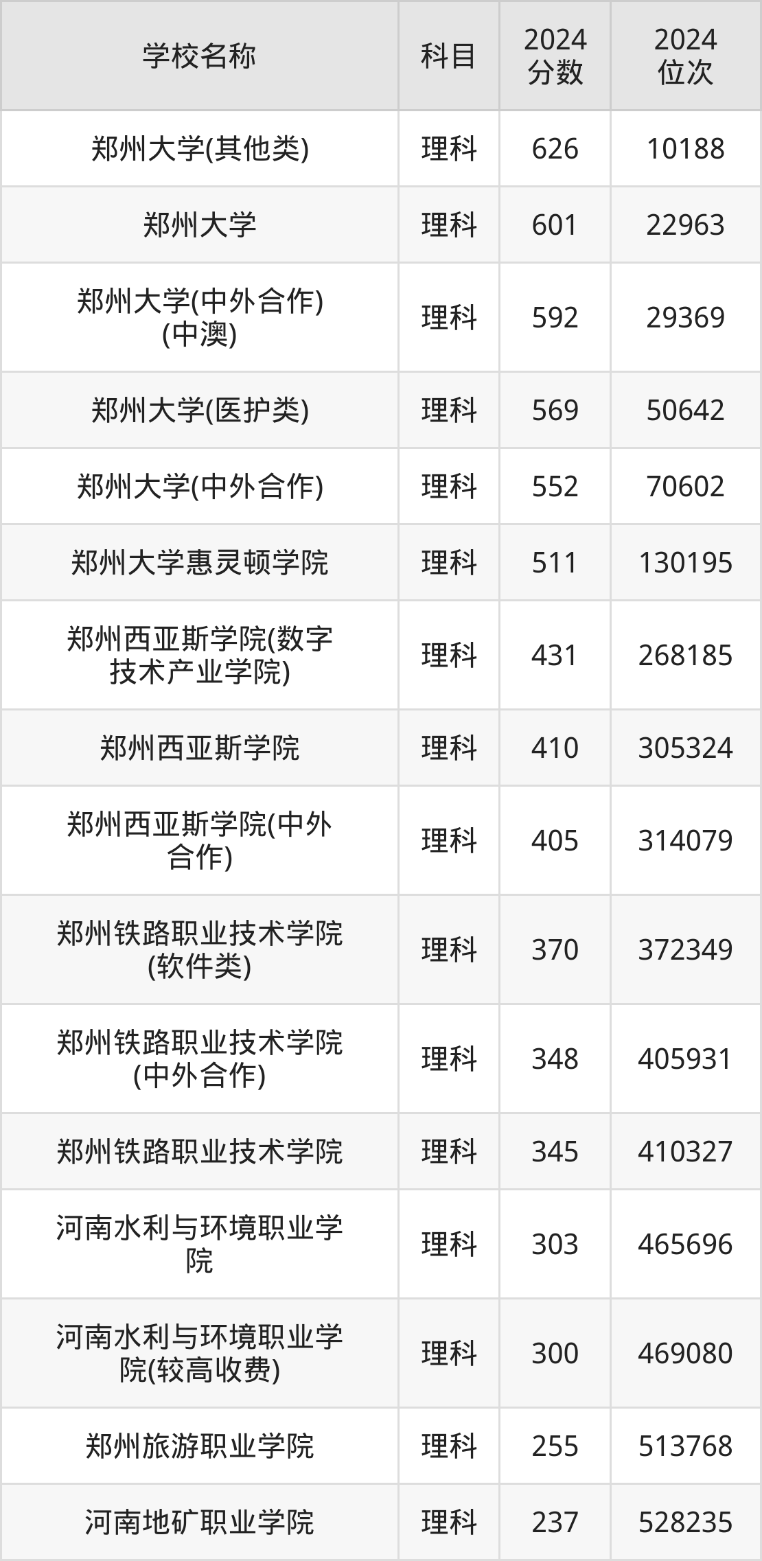 下文为2024年郑州市综合类大学在河南理科录取分数线和位次排名表,供大家参考: