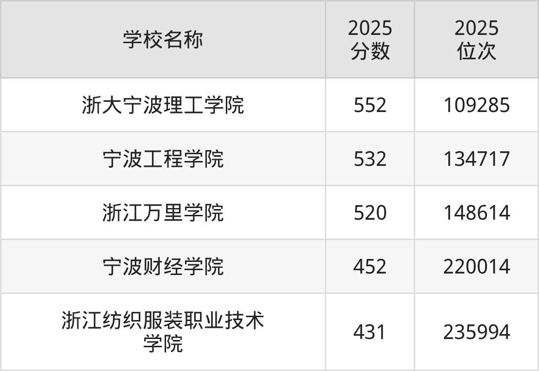 下文为2025年宁波市理工类大学在浙江录取分数线和位次排名表,供大家参考: