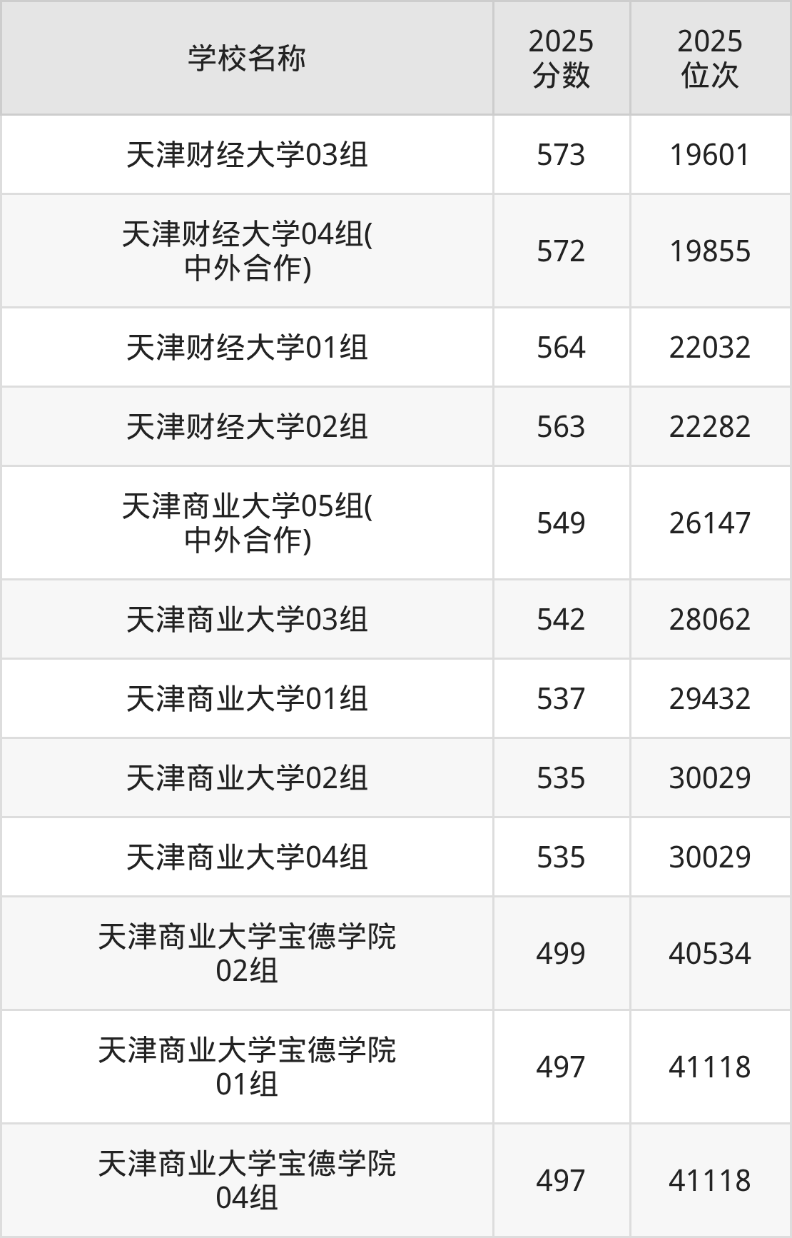 下文为2025年天津市财经类大学在天津录取分数线和位次排名表,供大家参考: