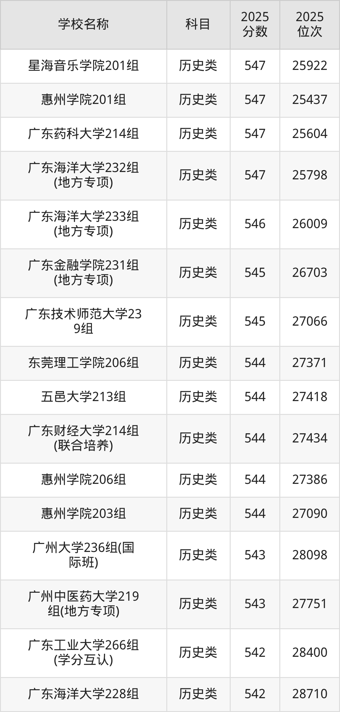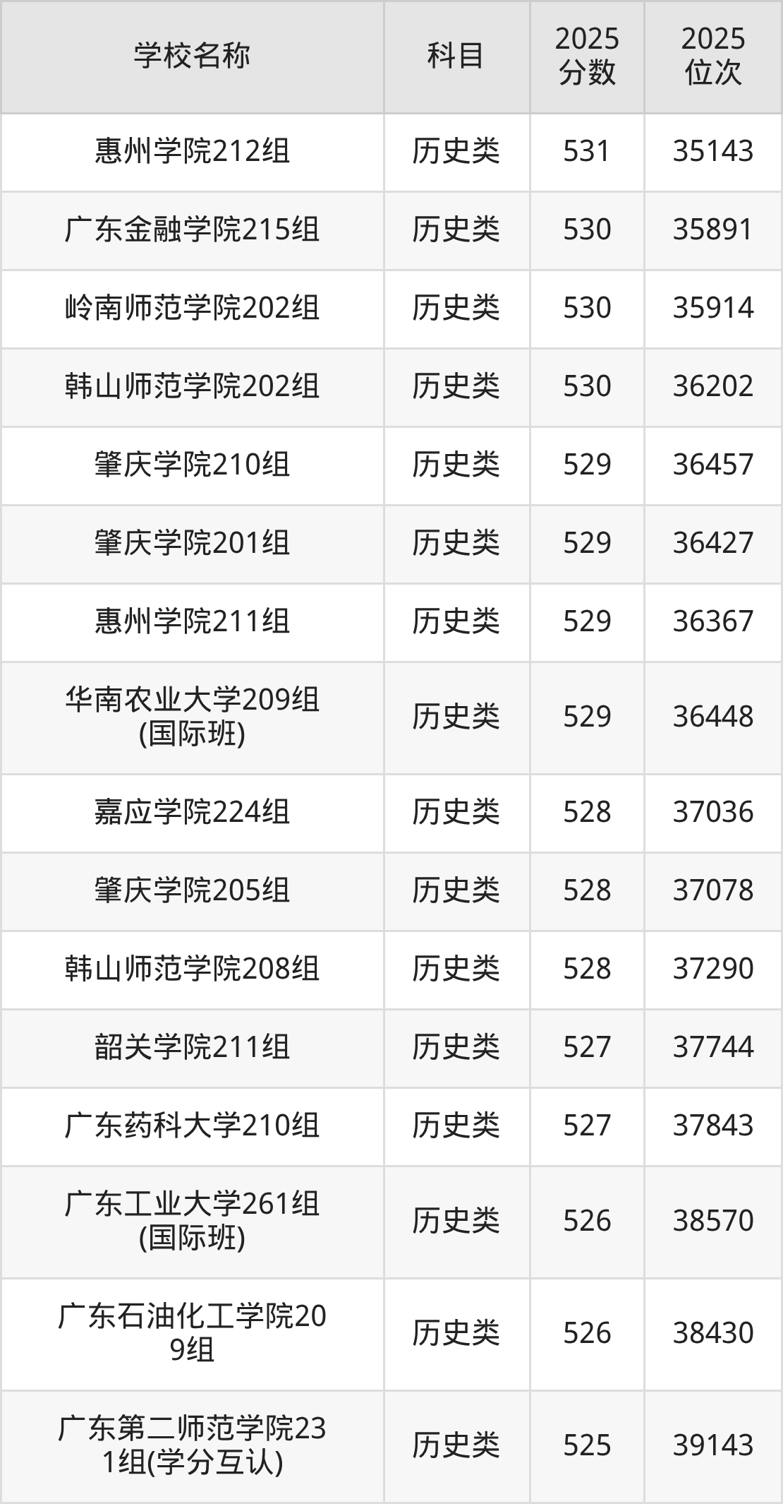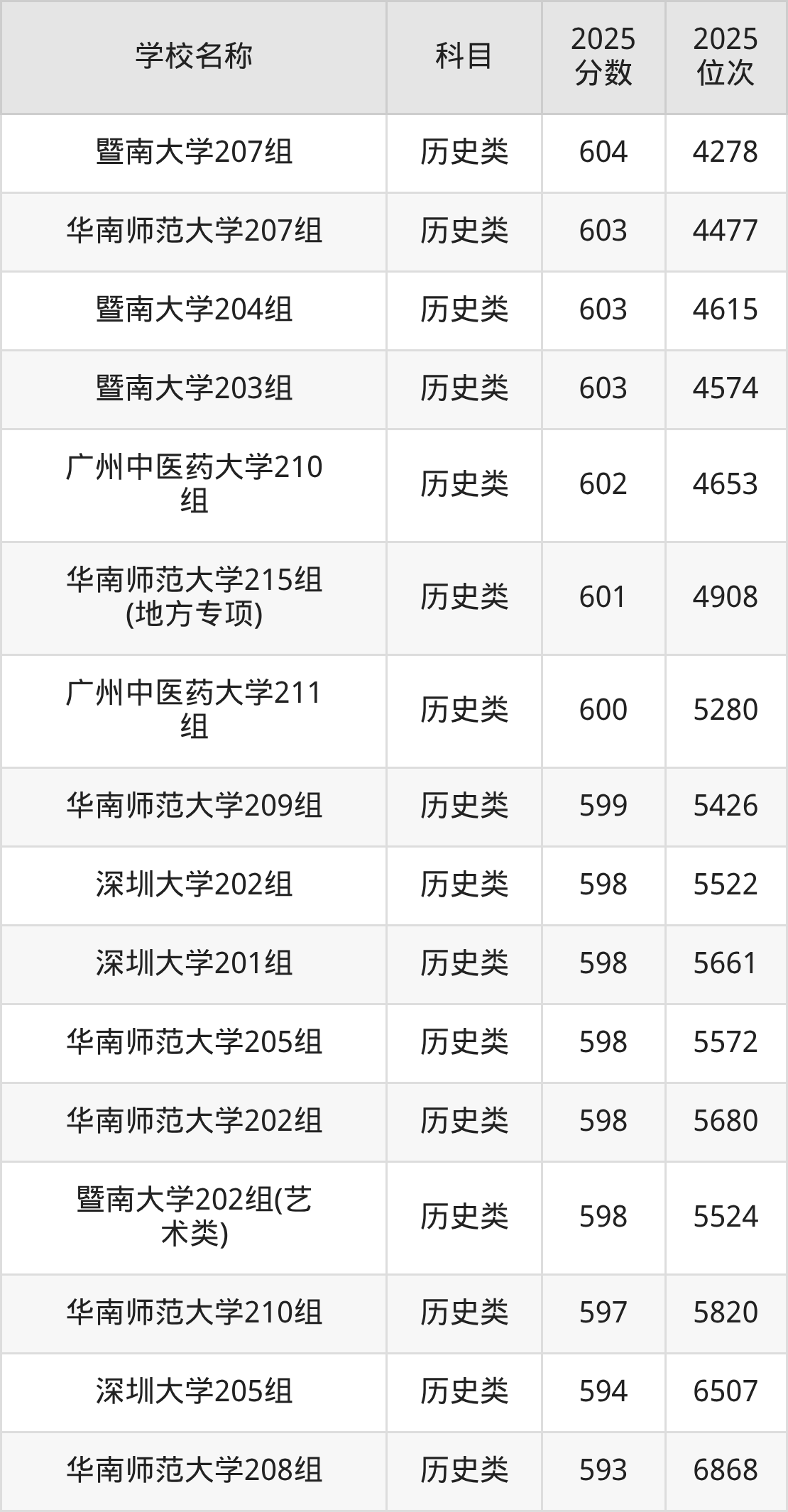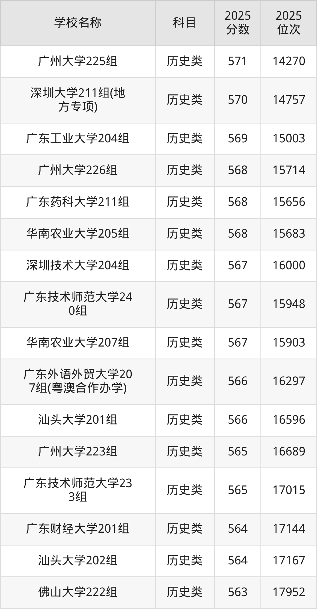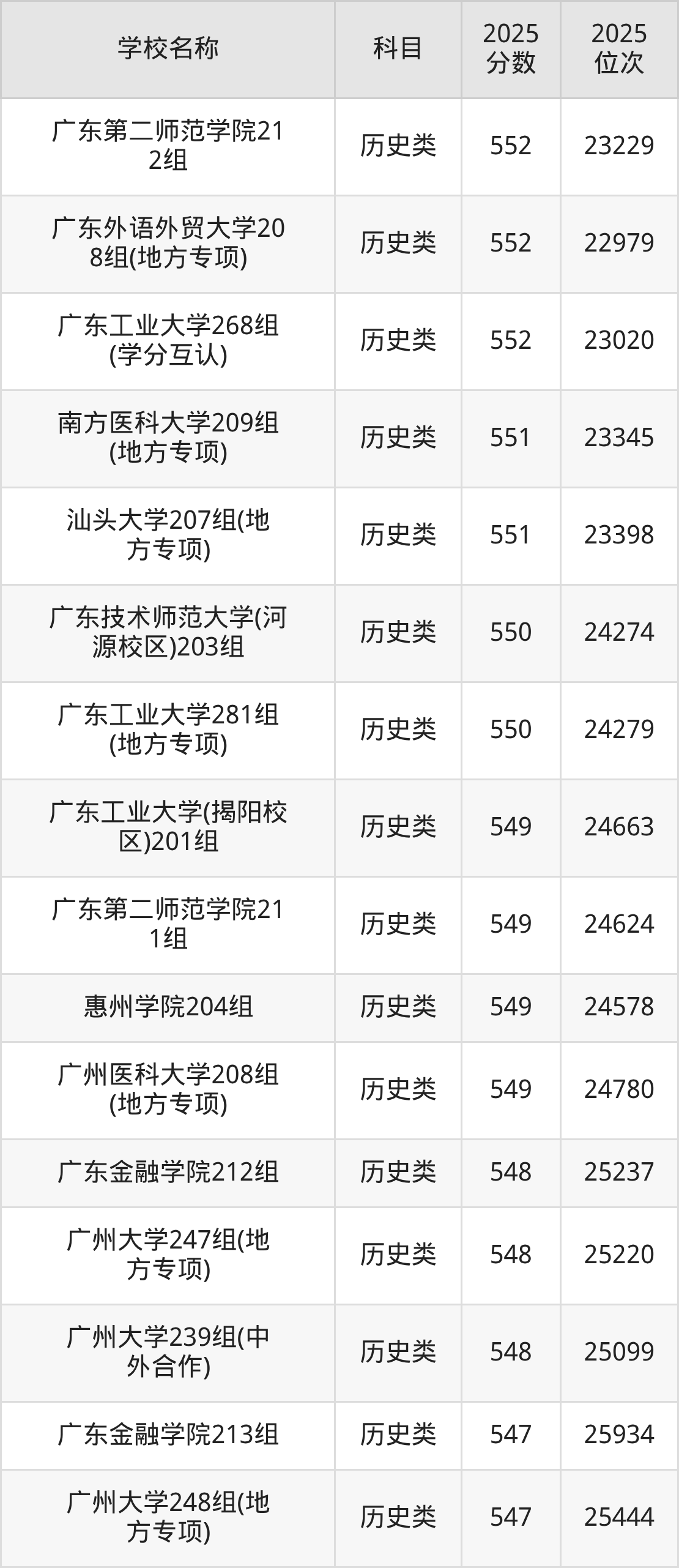 下文为2025年广东省本科大学在广东历史类录取分数线和位次排名表,供大家参考: