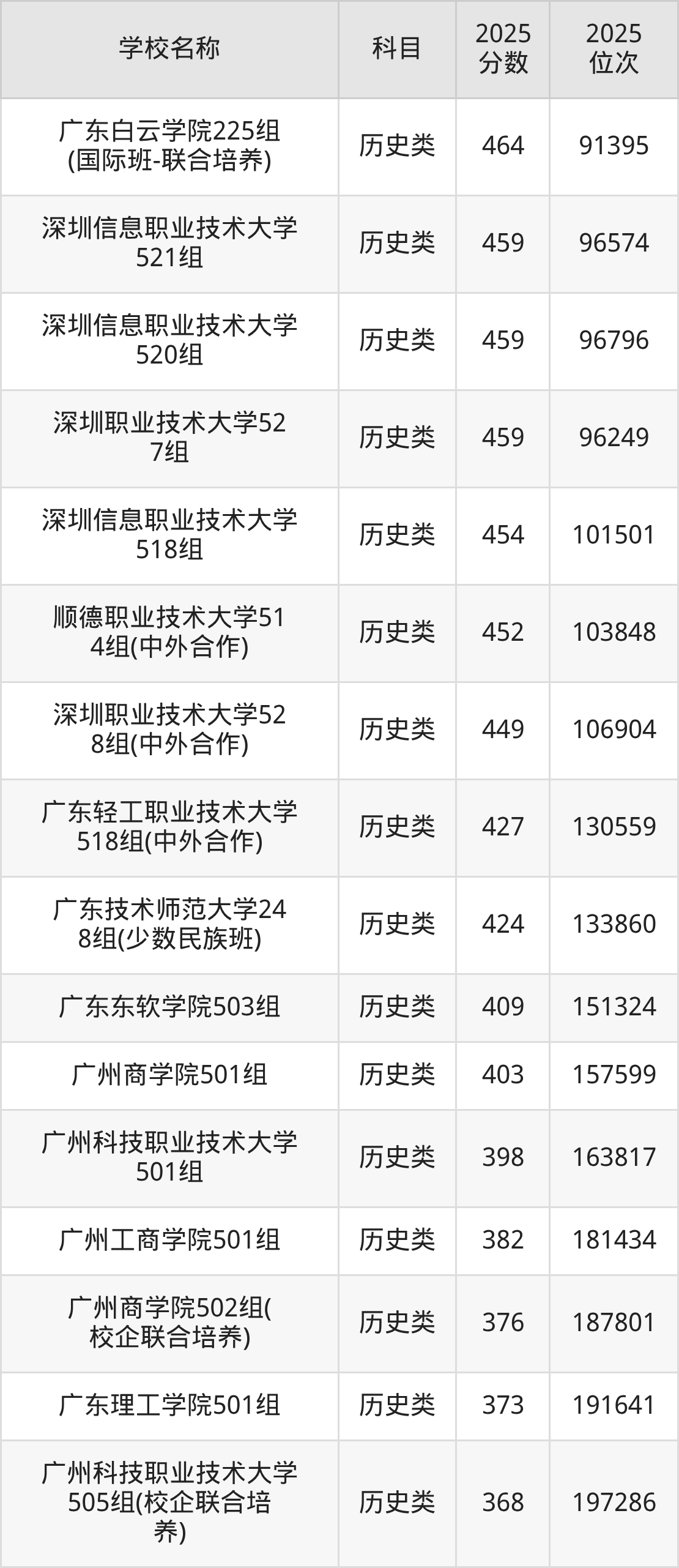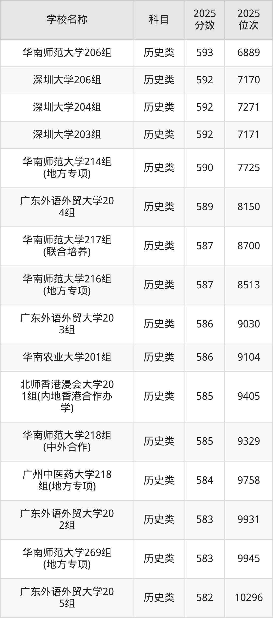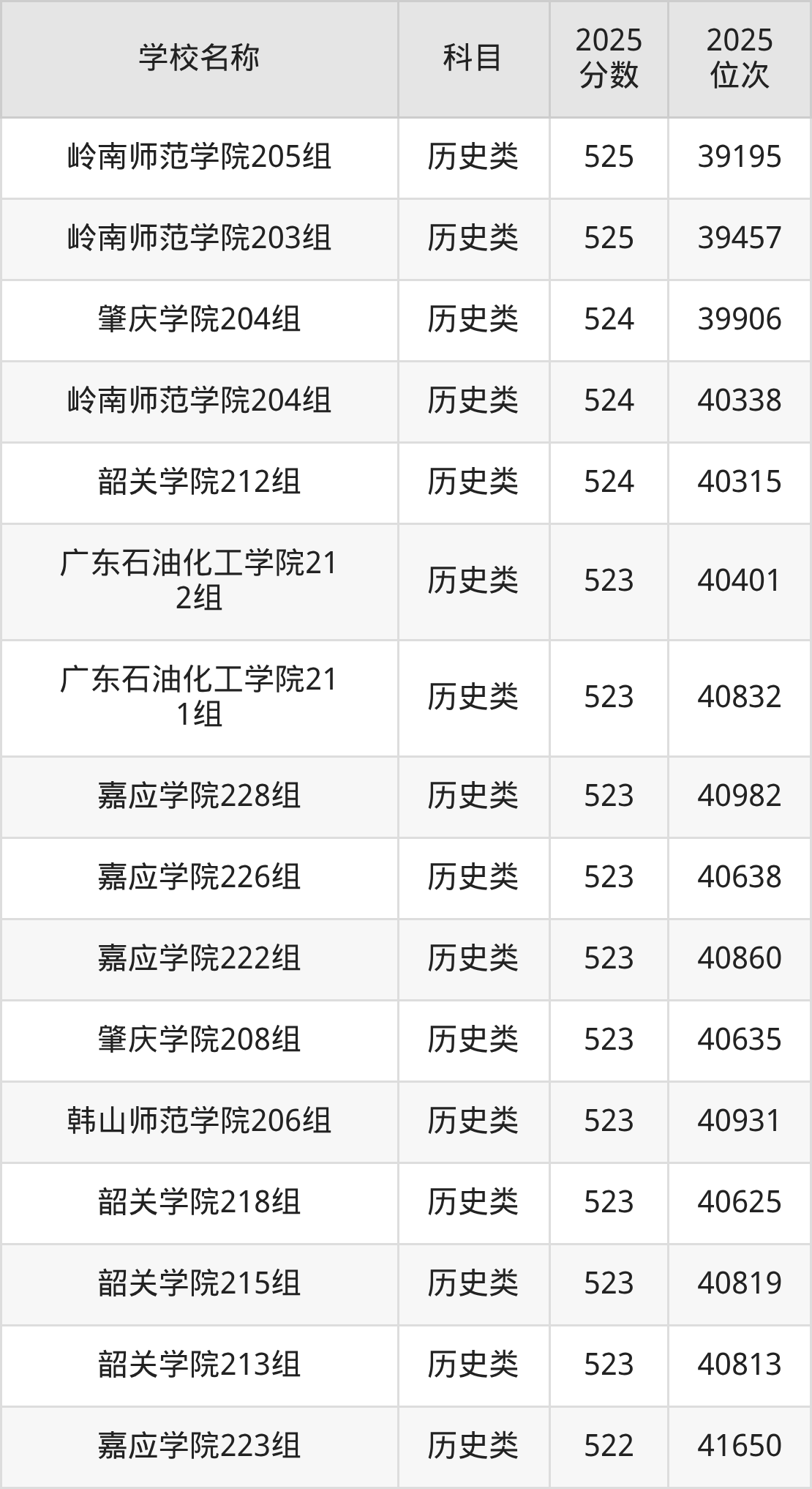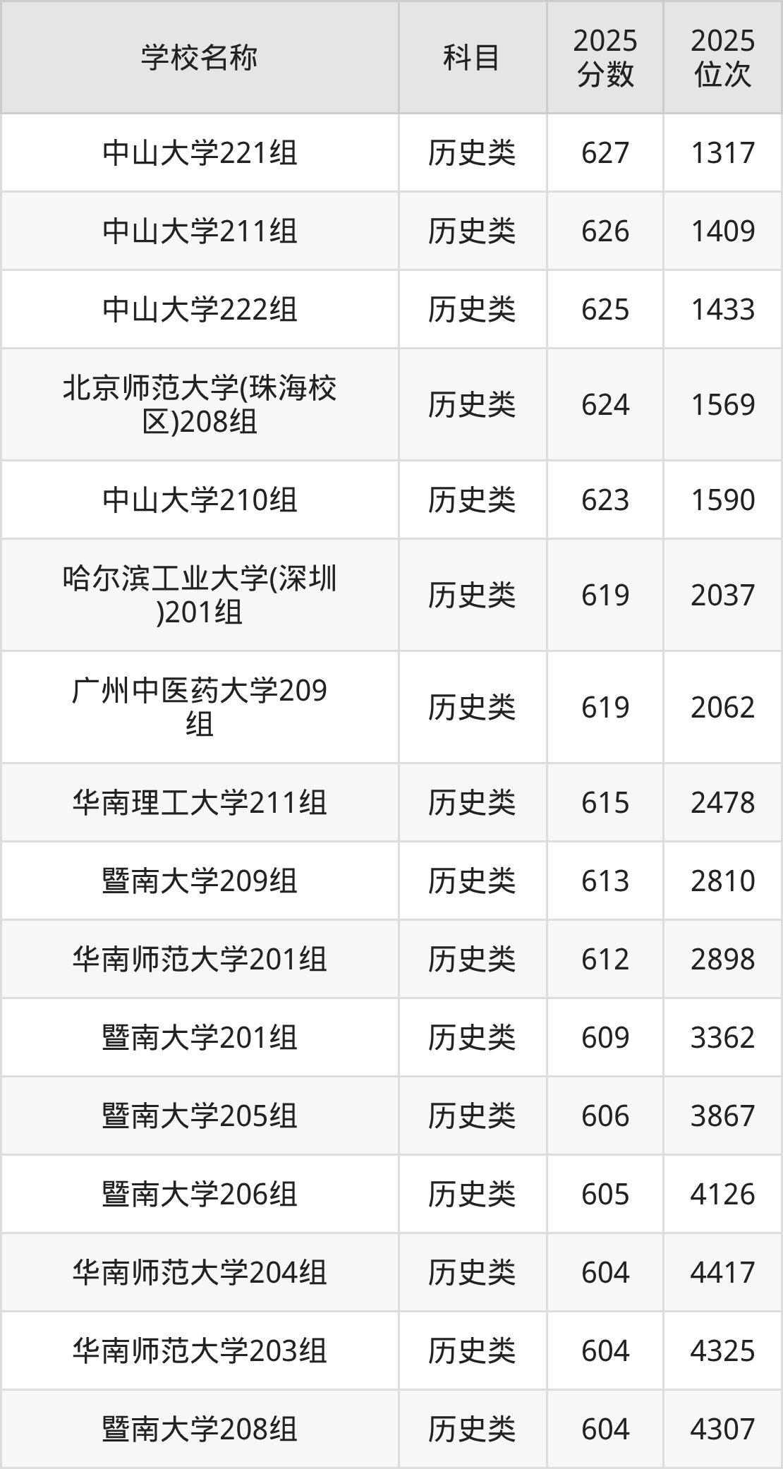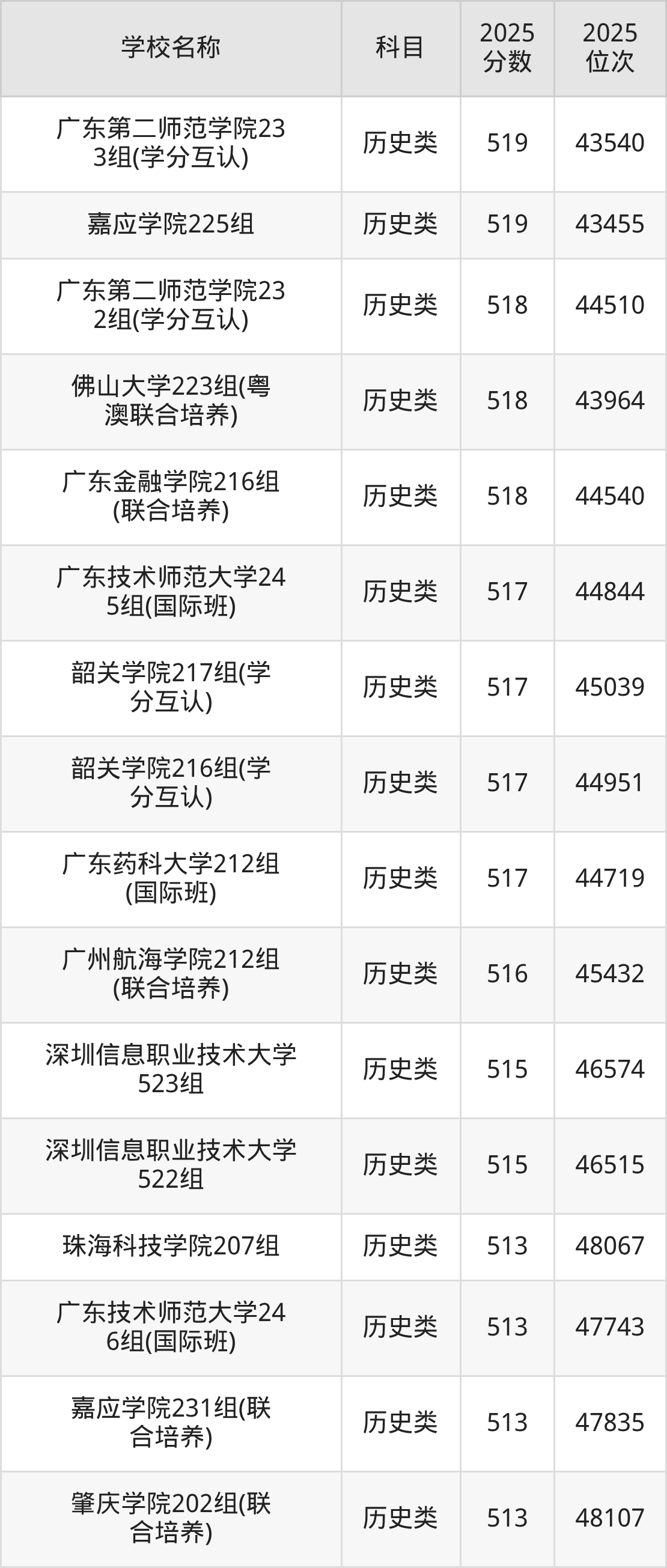 下文为2025年广东省本科大学在广东历史类录取分数线和位次排名表,供大家参考: