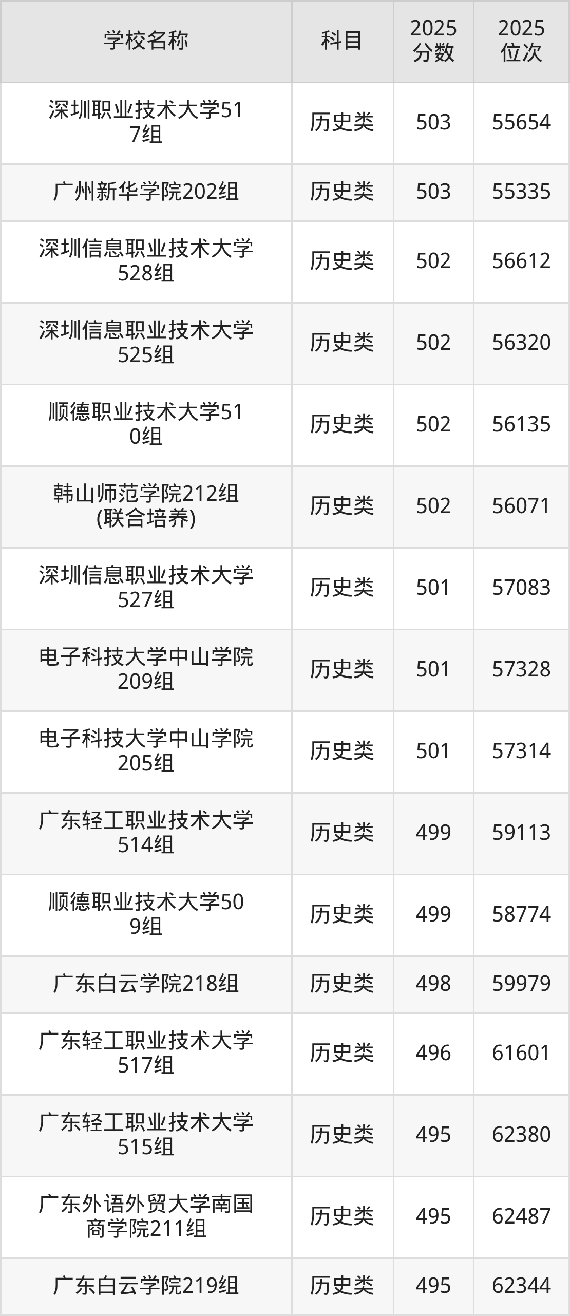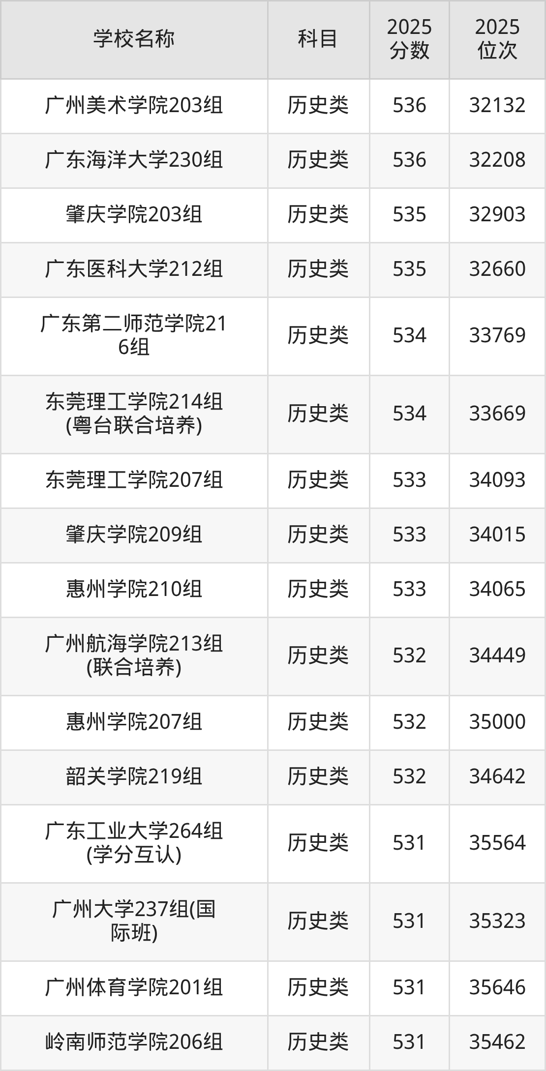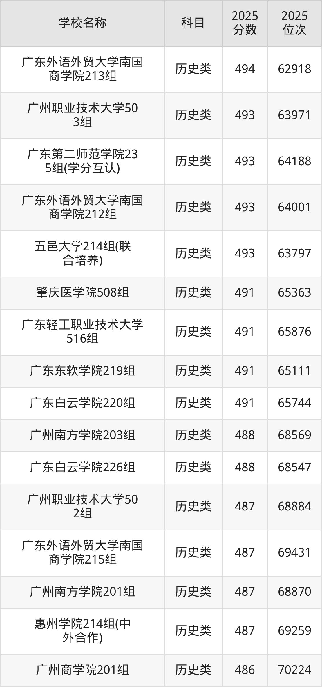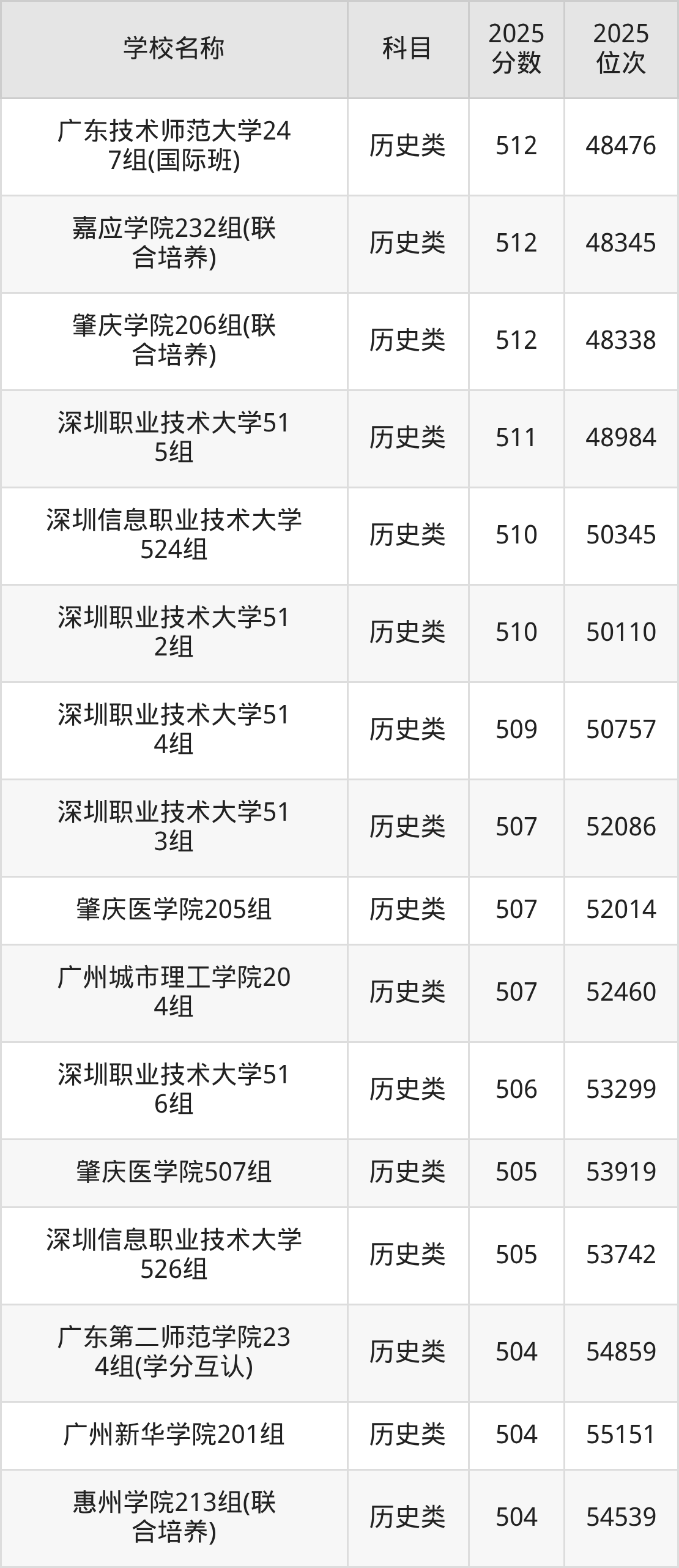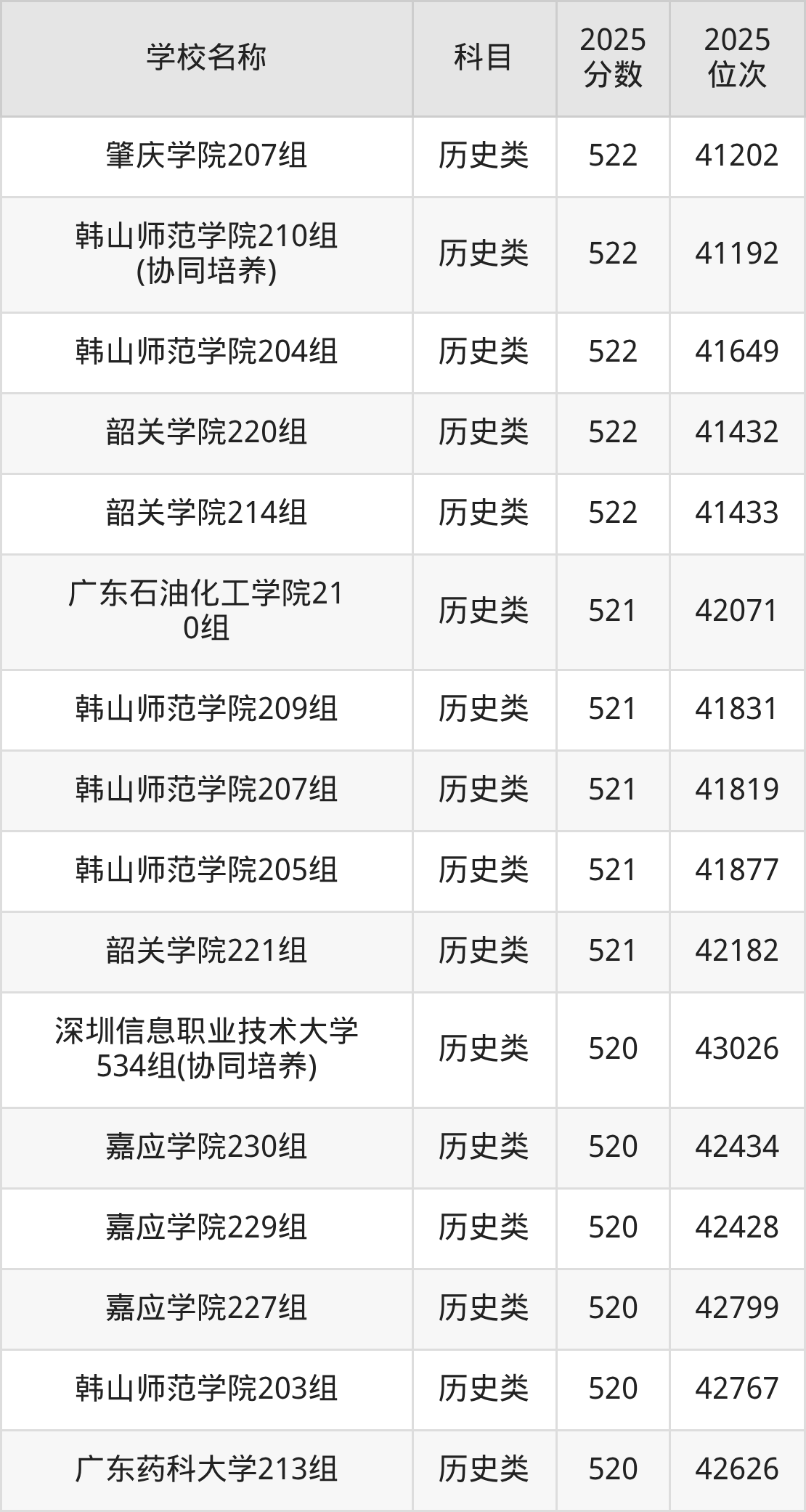 下文为2025年广东省本科大学在广东历史类录取分数线和位次排名表,供大家参考: