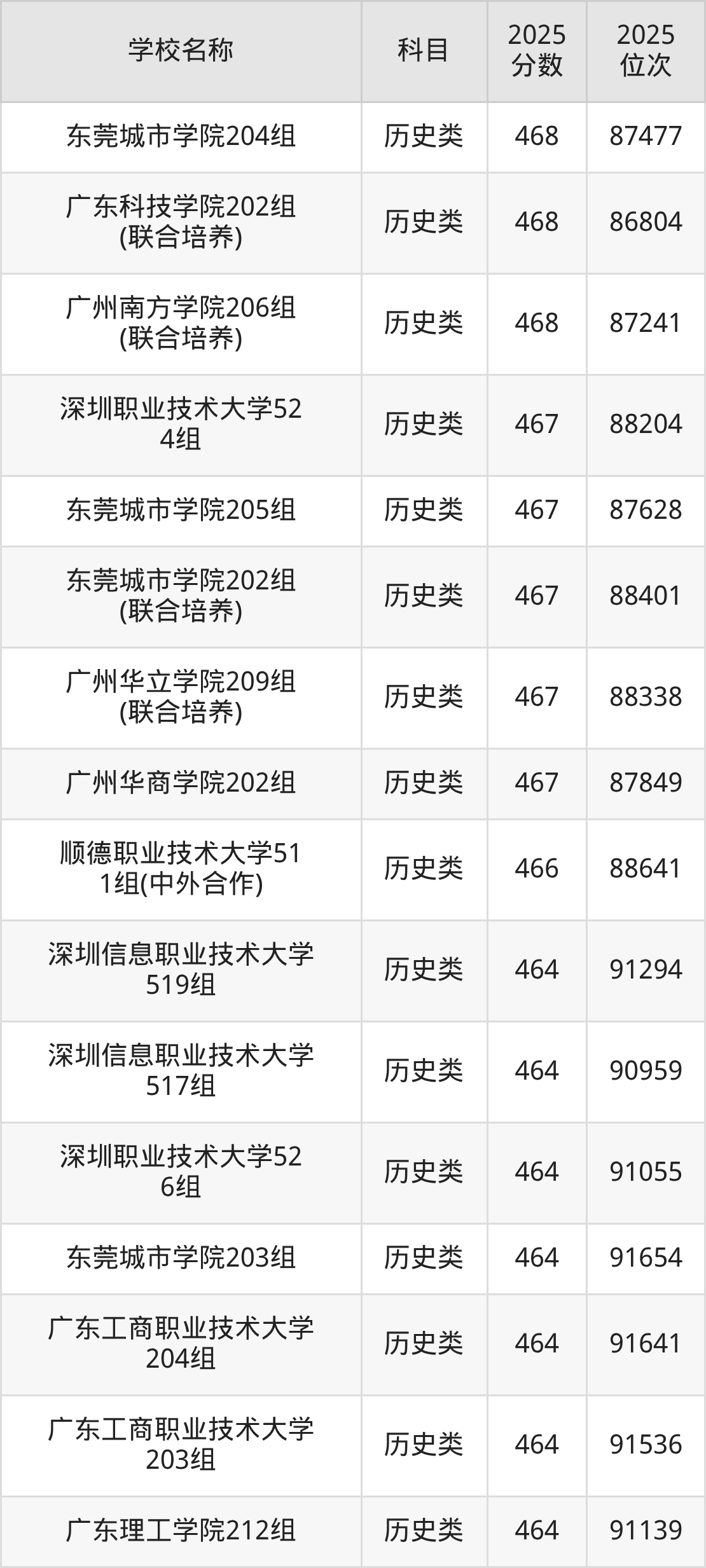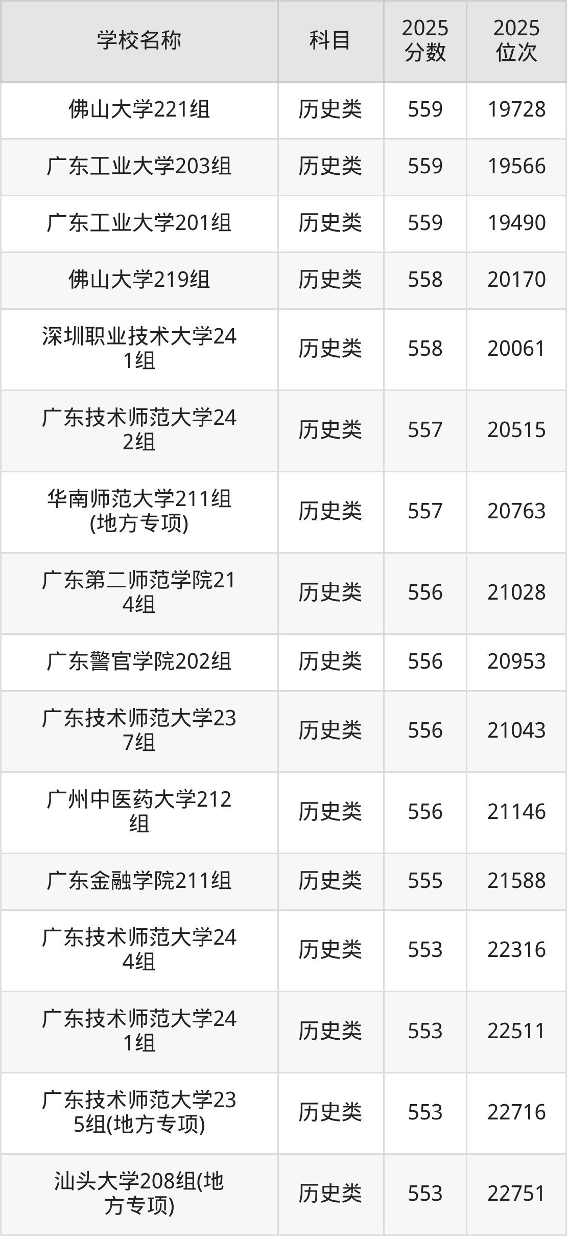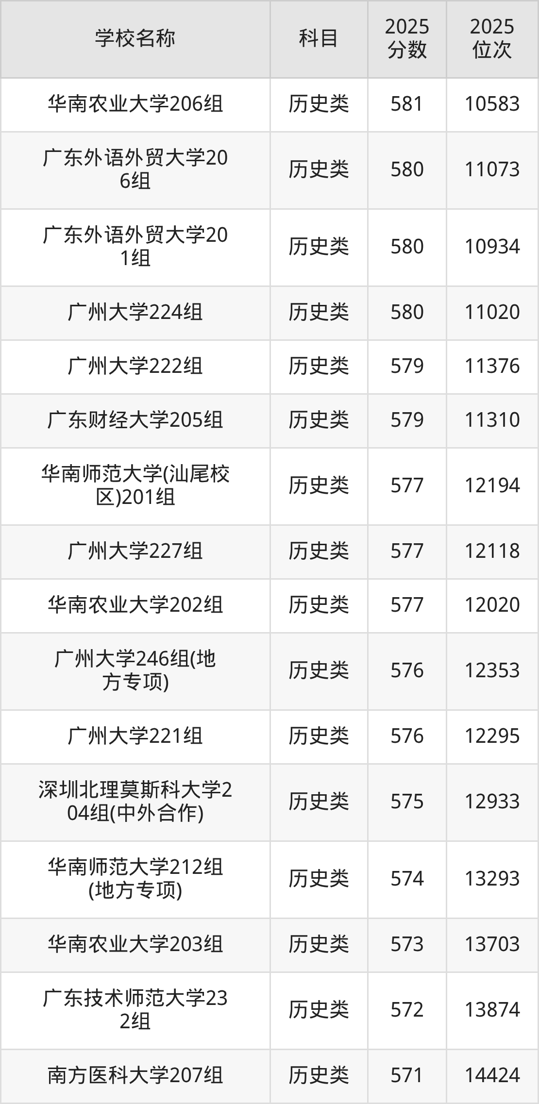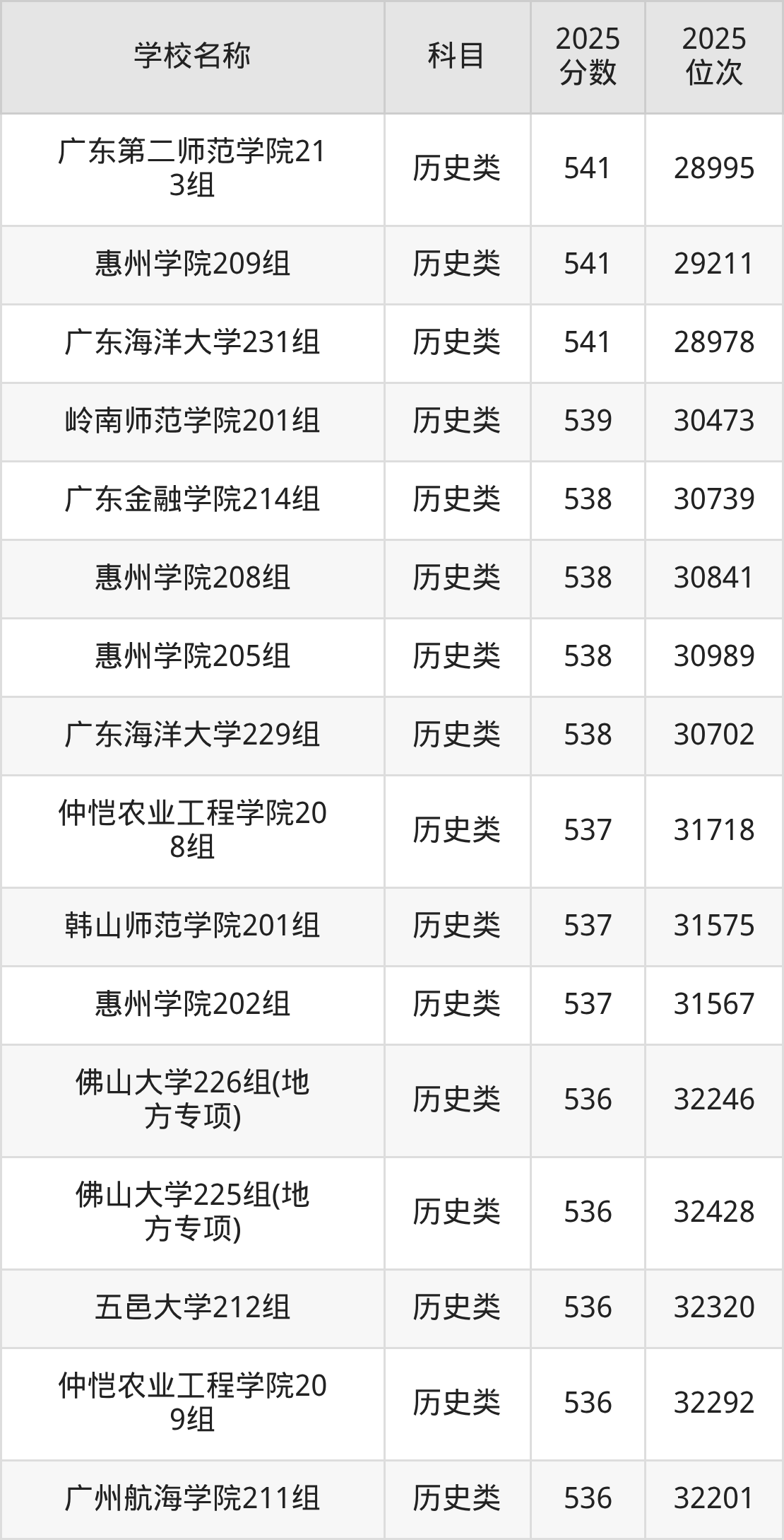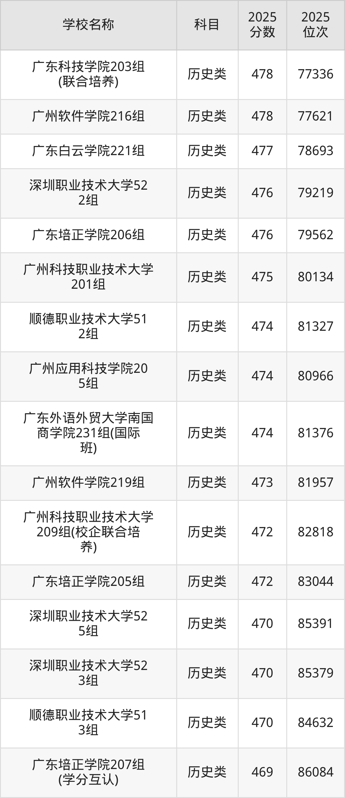 下文为2025年广东省本科大学在广东历史类录取分数线和位次排名表,供大家参考: