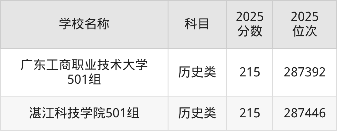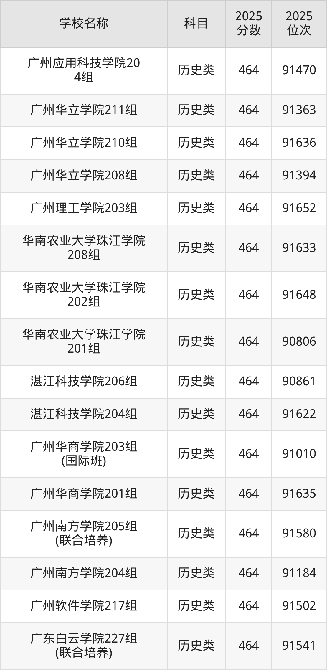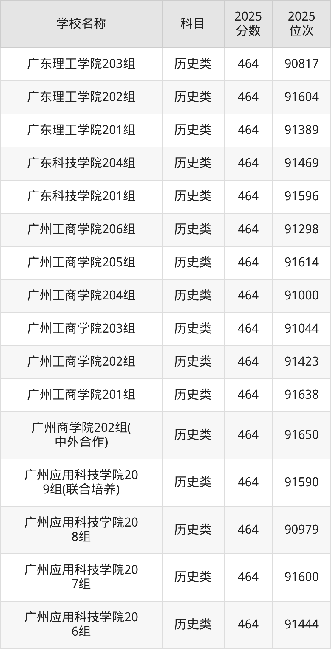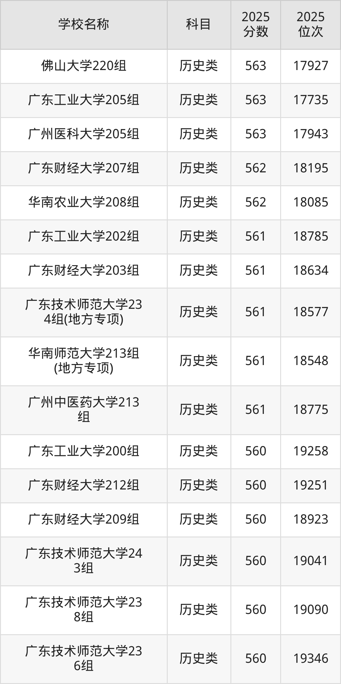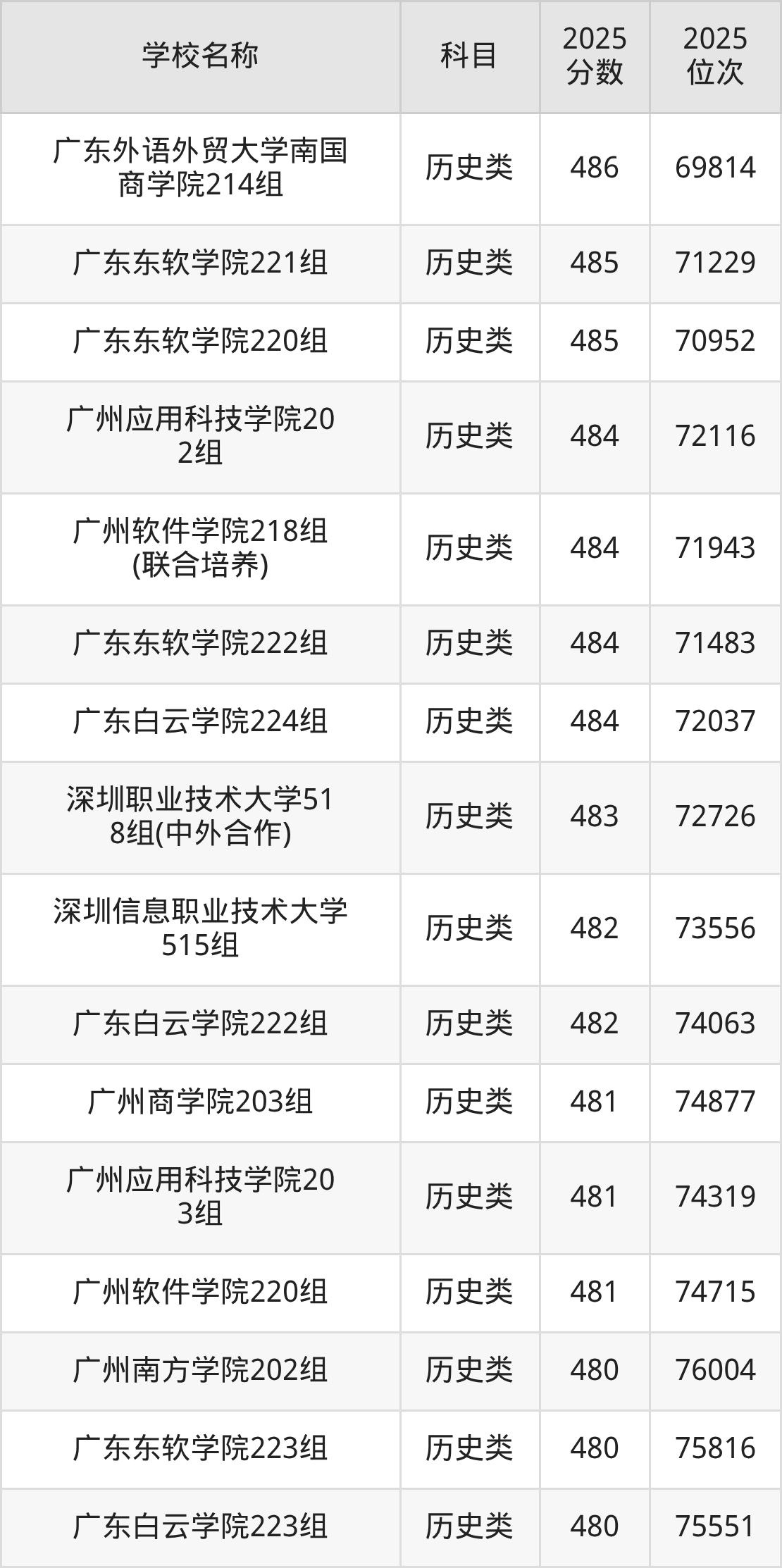 下文为2025年广东省本科大学在广东历史类录取分数线和位次排名表,供大家参考: