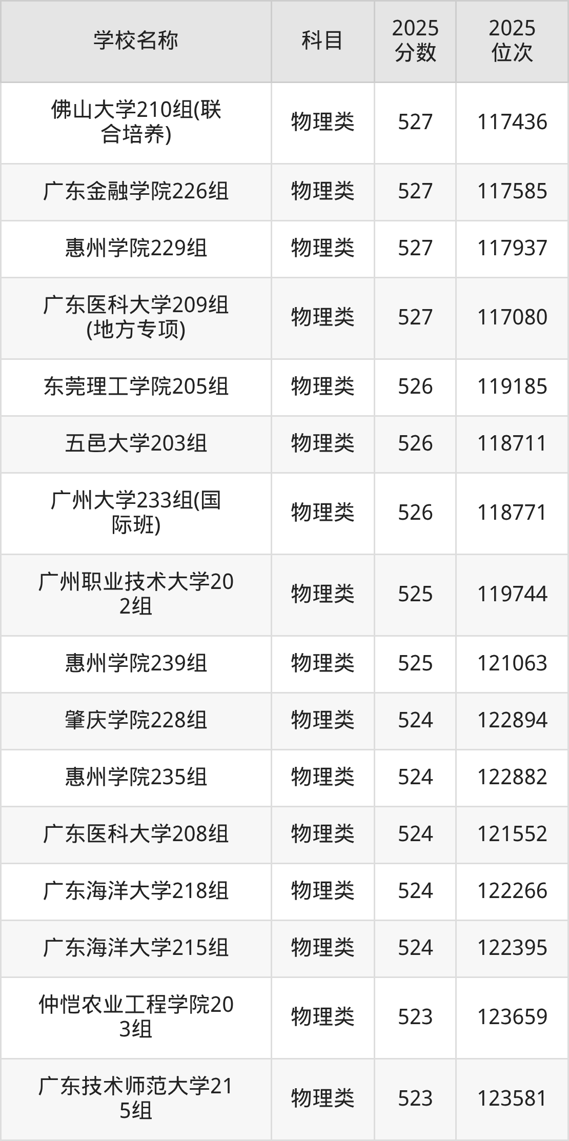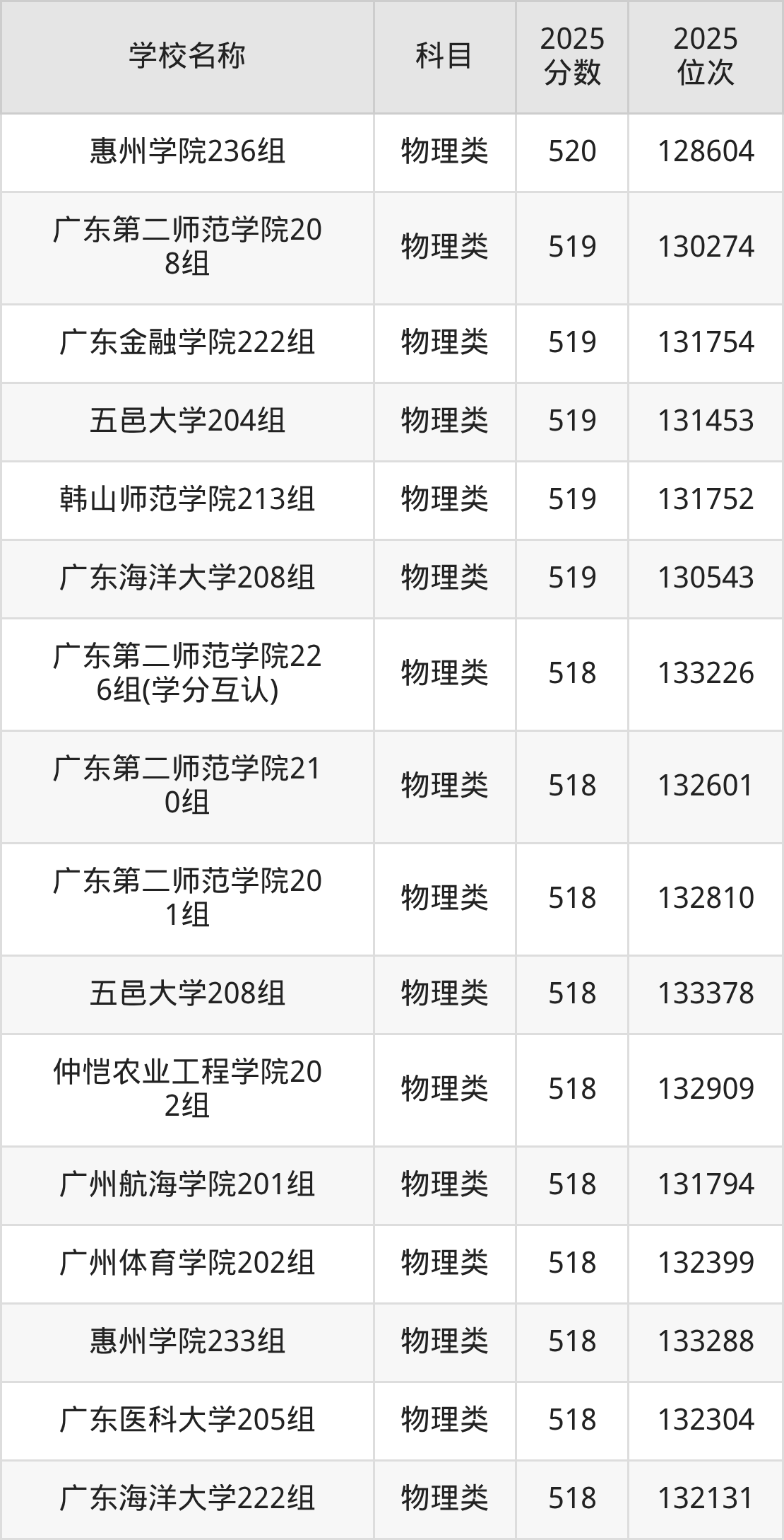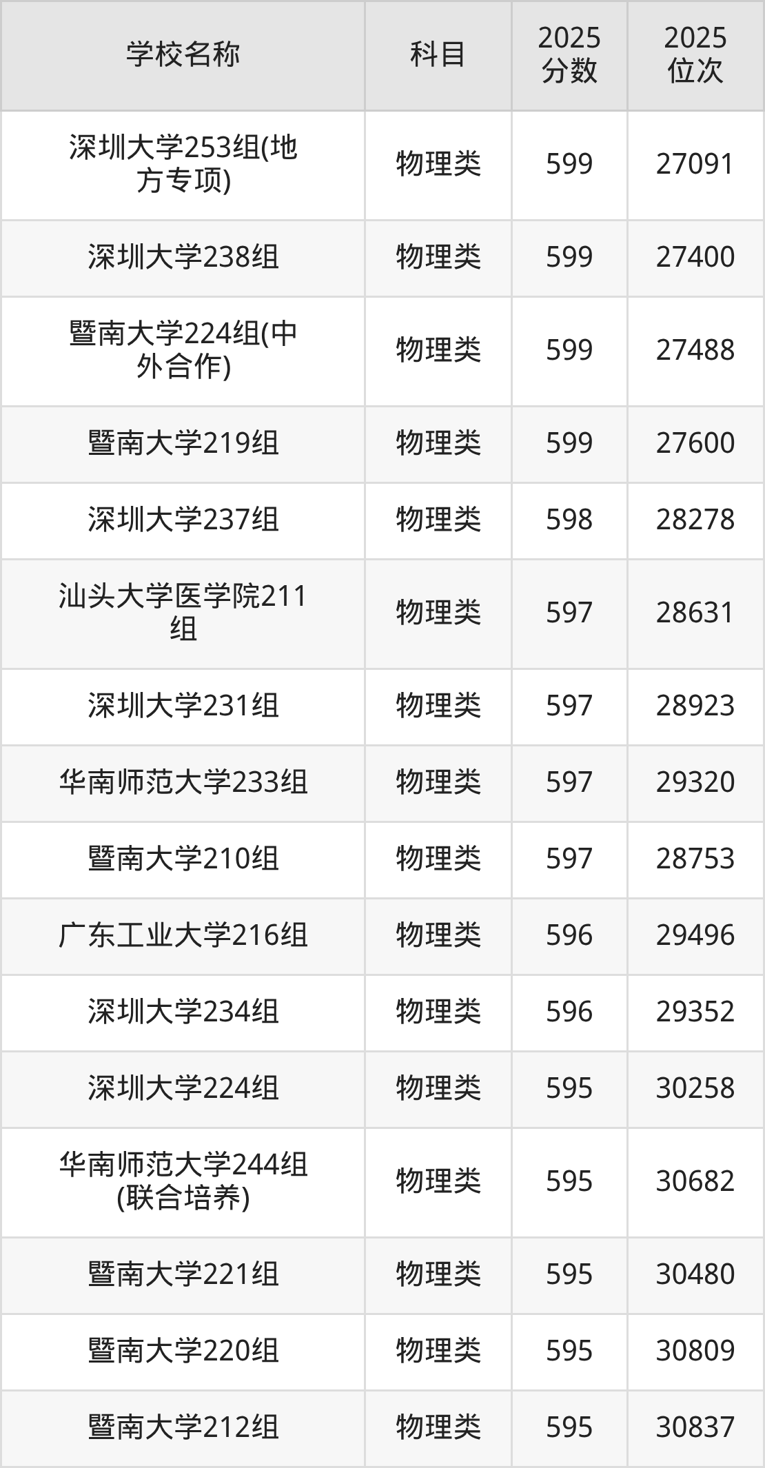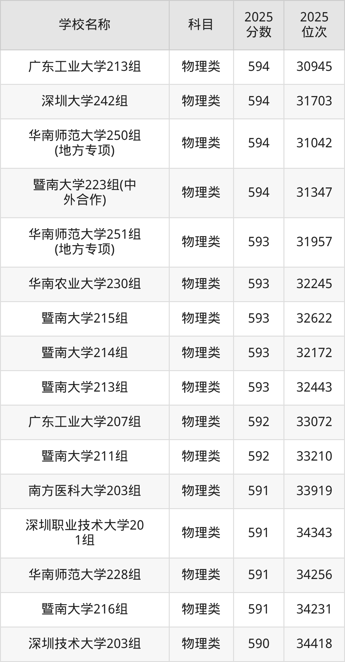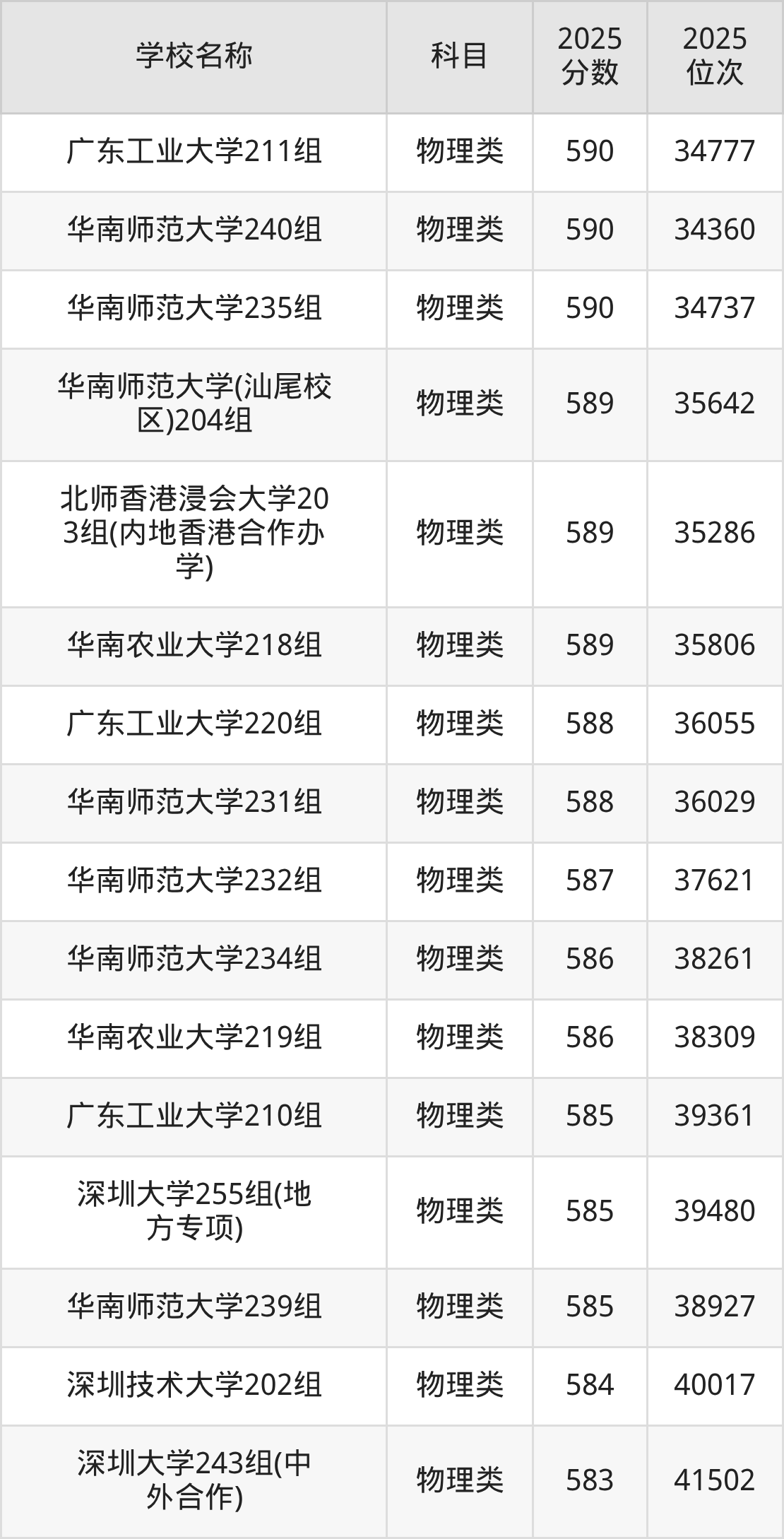 下文为2025年广东省本科大学在广东物理类录取分数线和位次排名表,供大家参考: