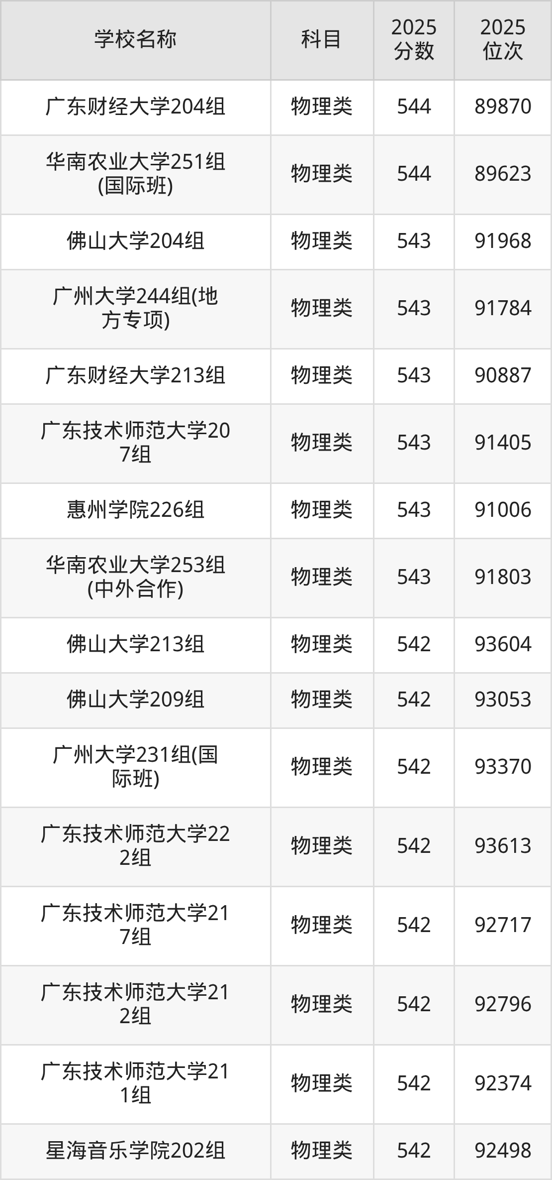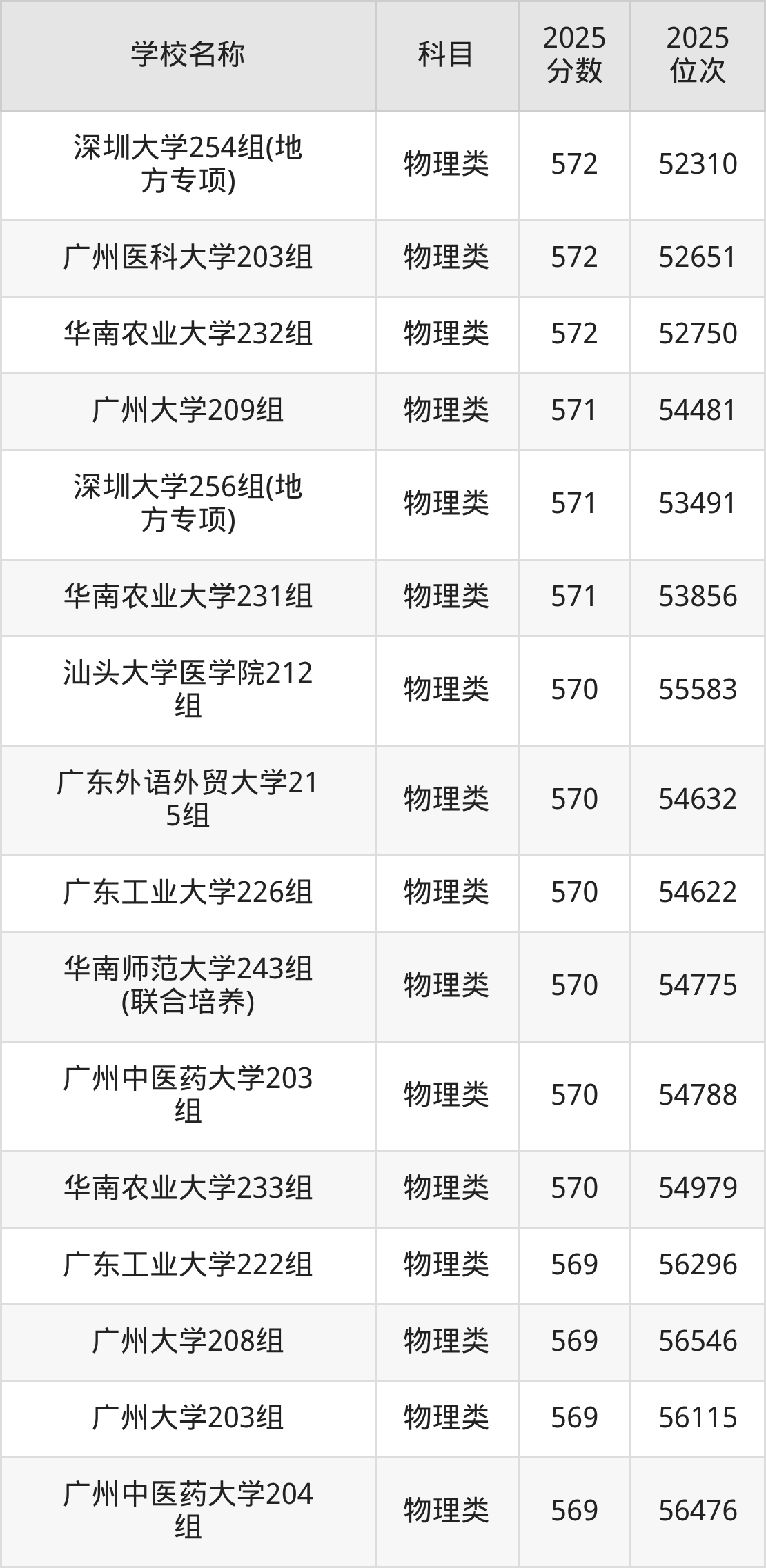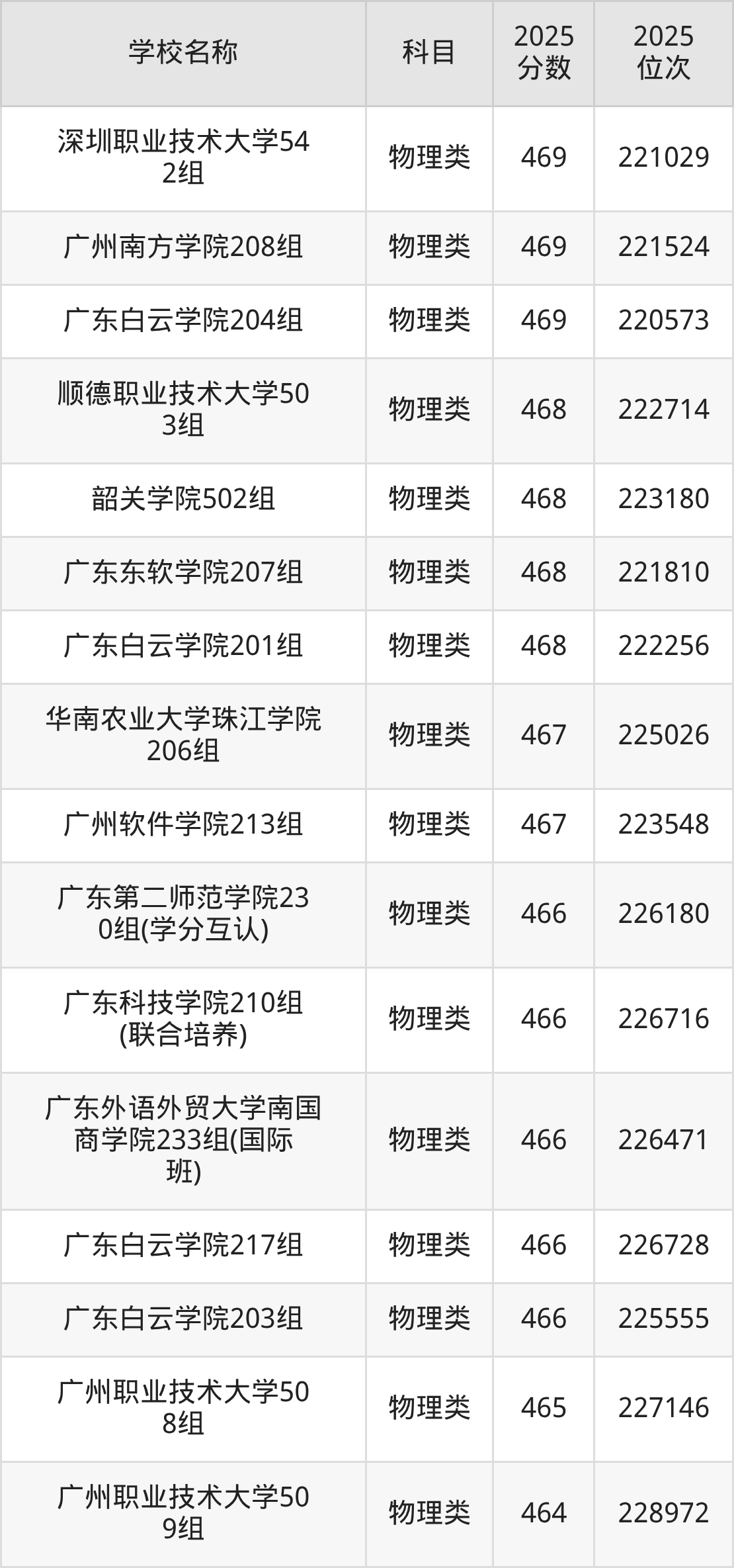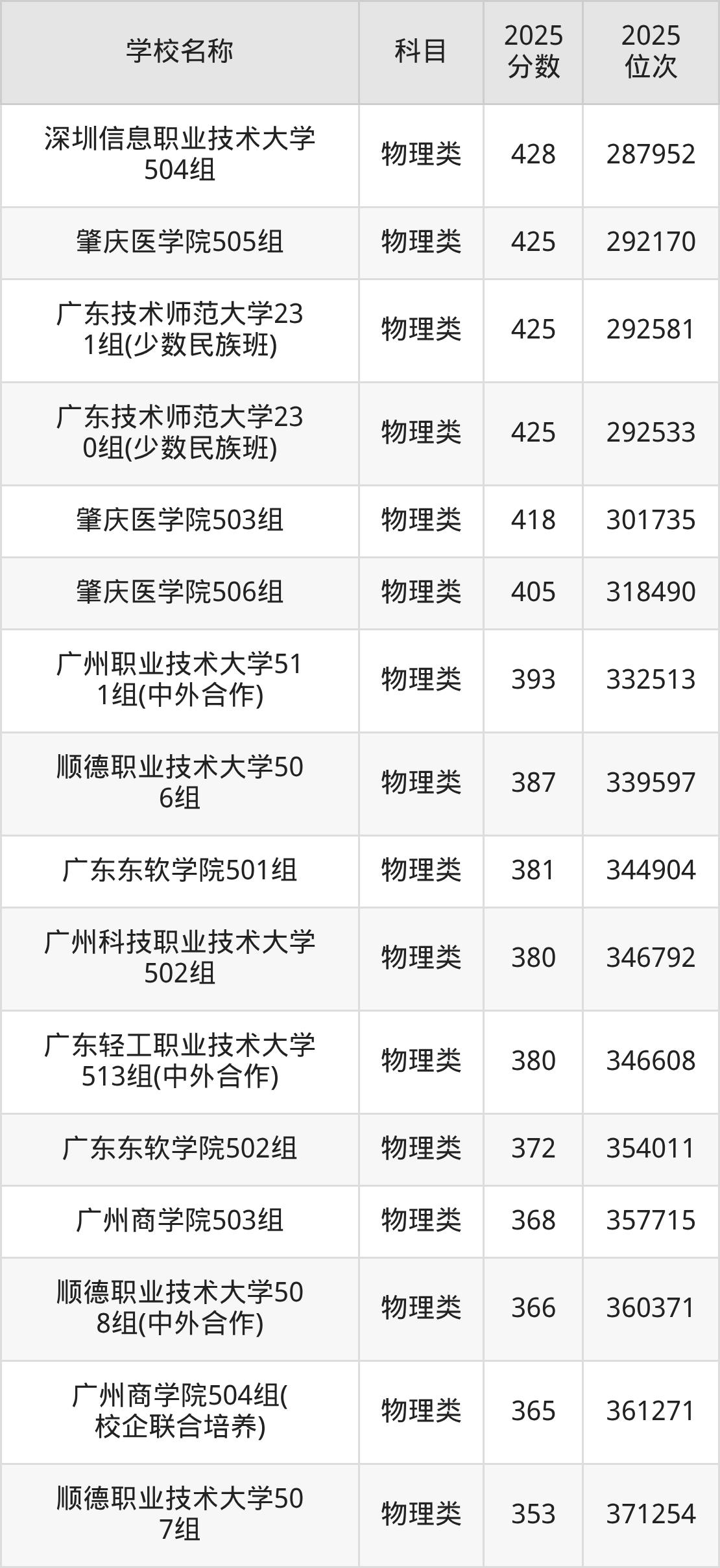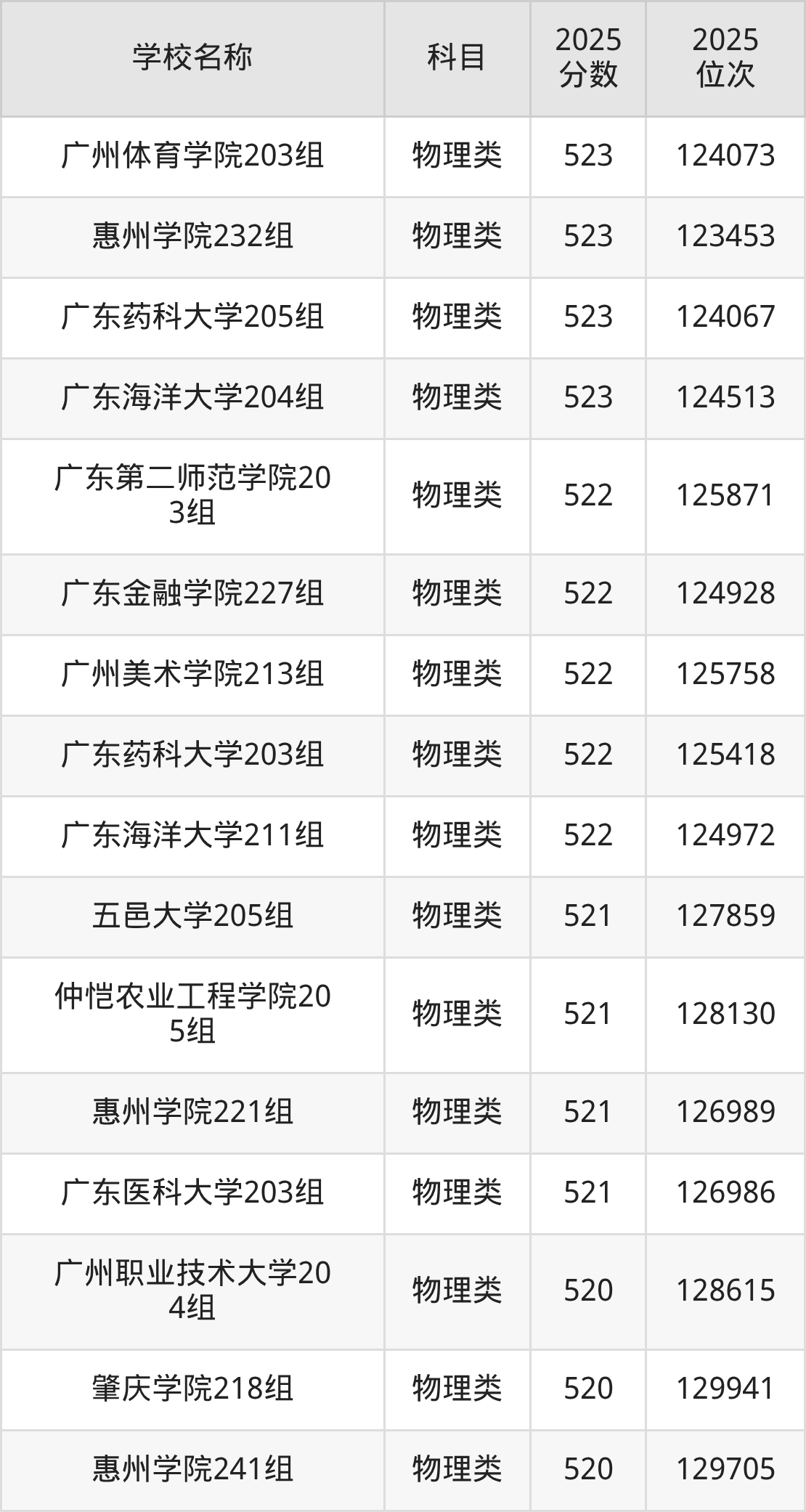 下文为2025年广东省本科大学在广东物理类录取分数线和位次排名表,供大家参考: