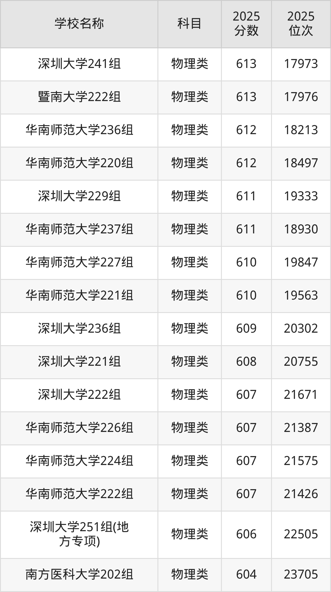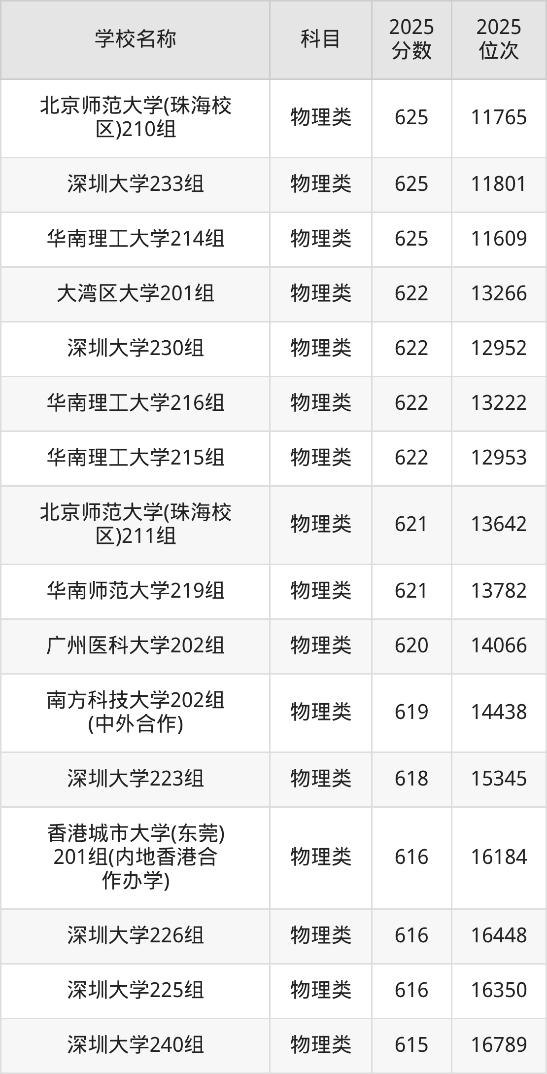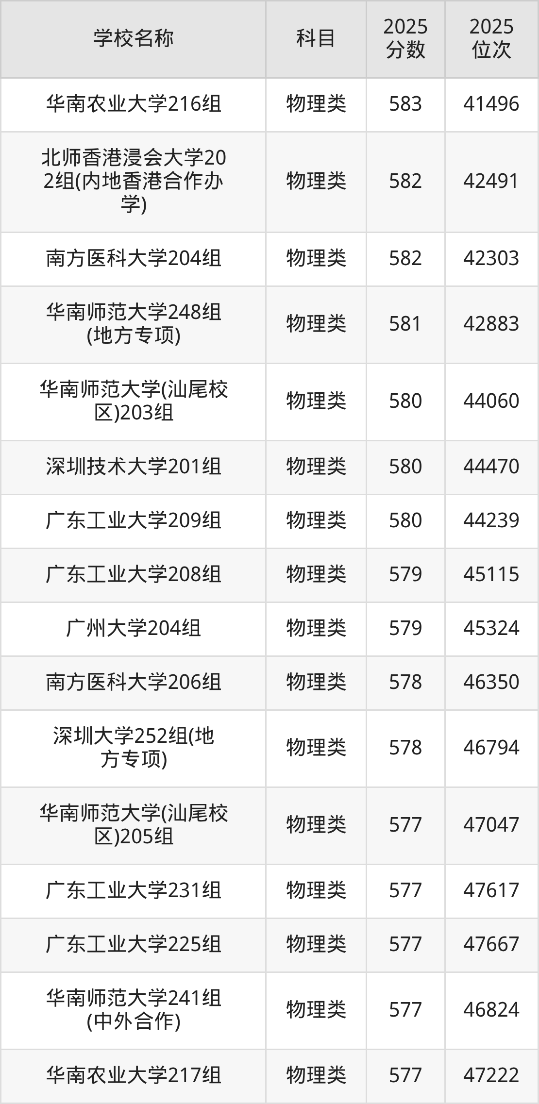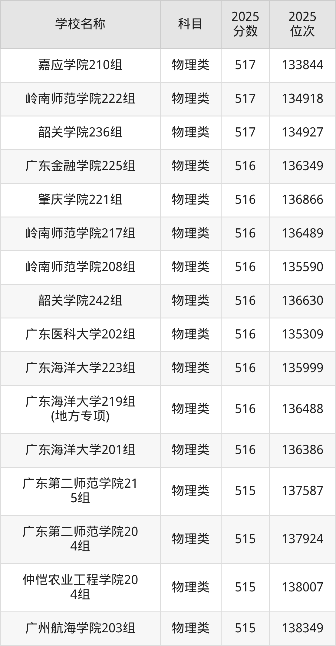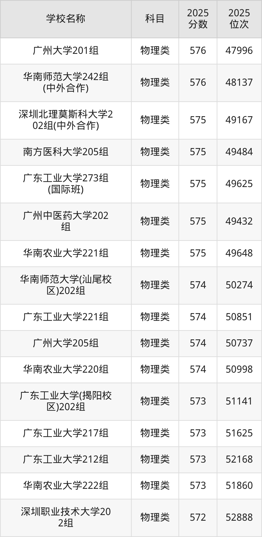 下文为2025年广东省本科大学在广东物理类录取分数线和位次排名表,供大家参考: