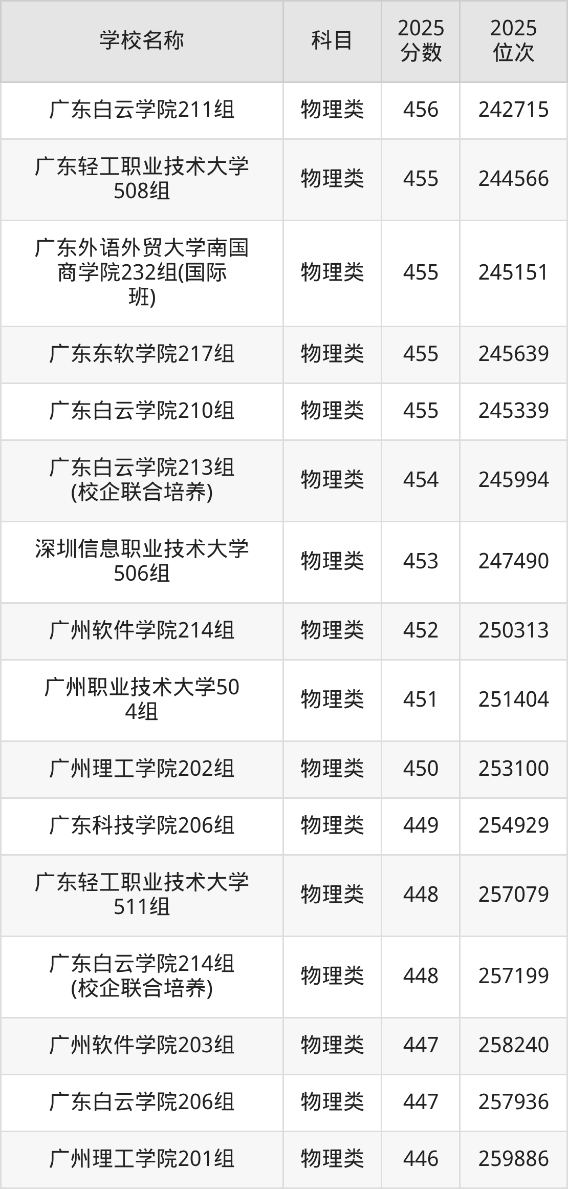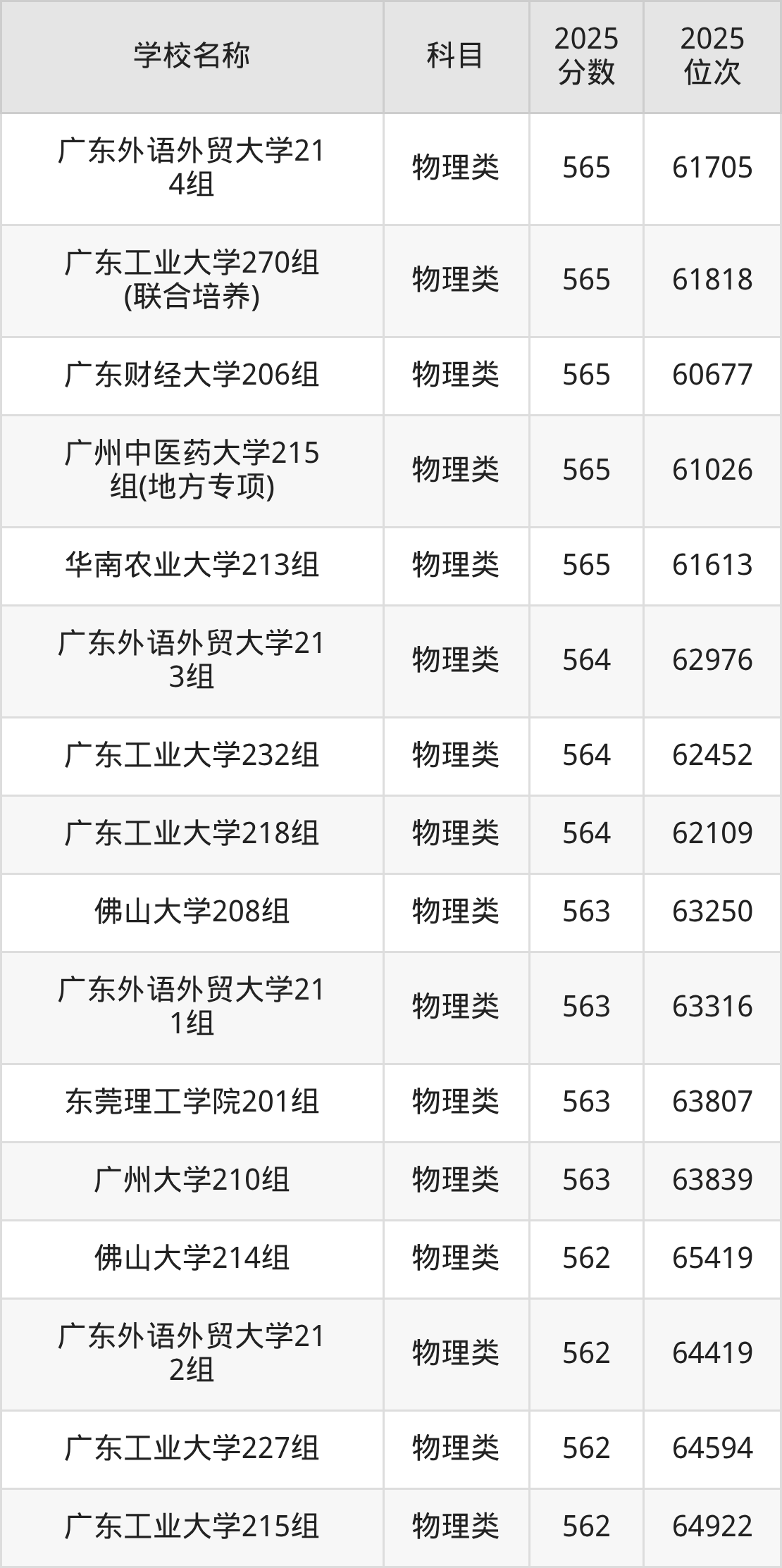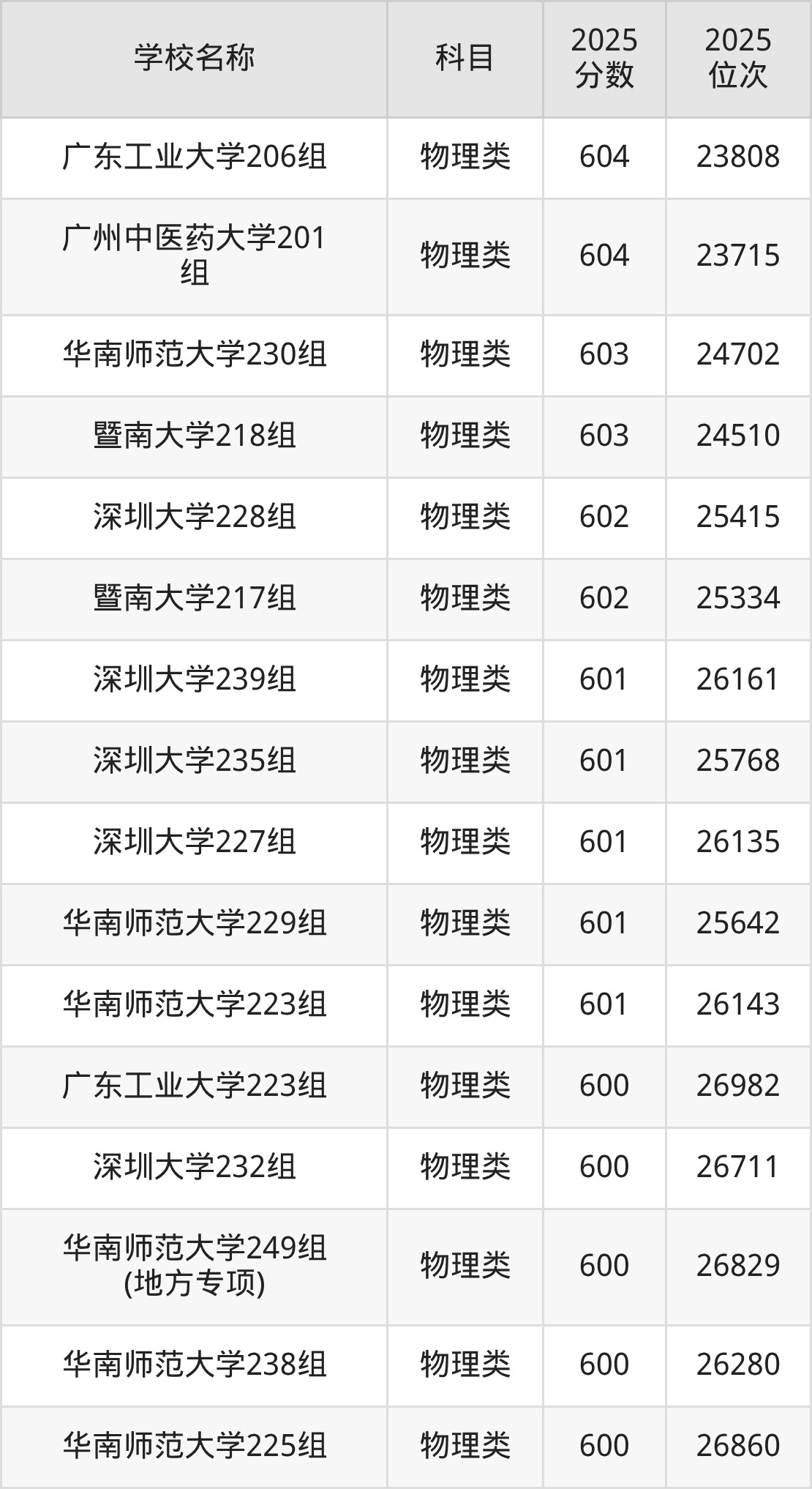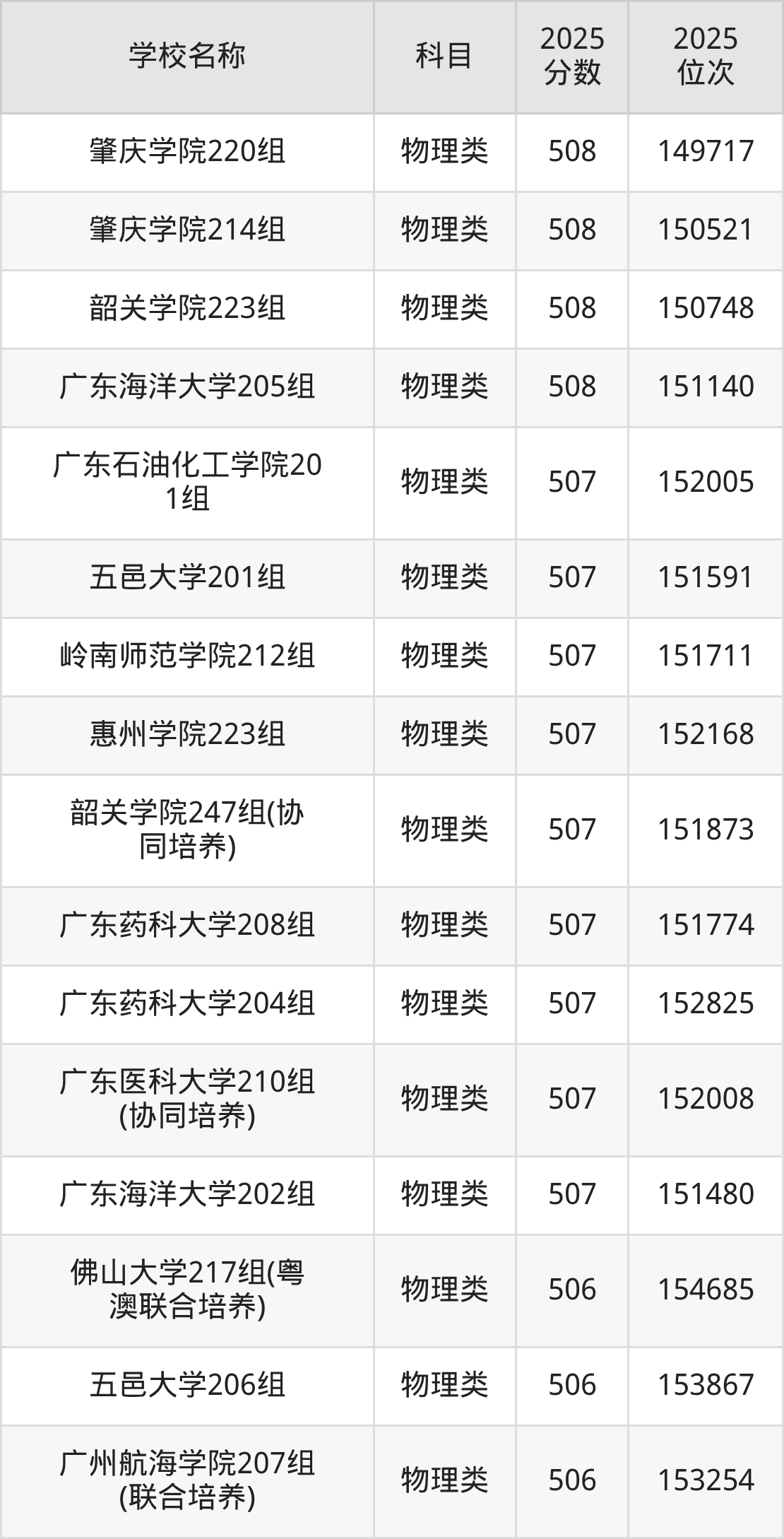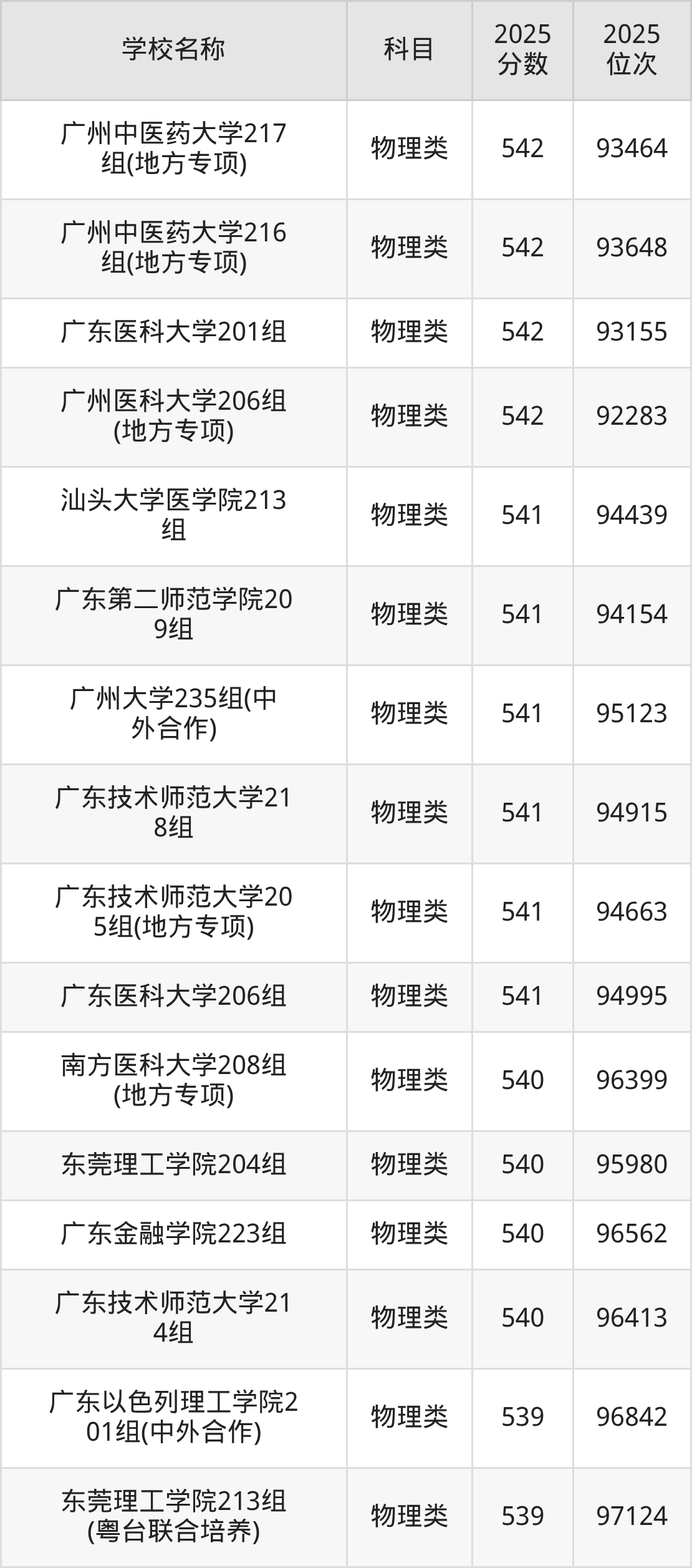 下文为2025年广东省本科大学在广东物理类录取分数线和位次排名表,供大家参考: