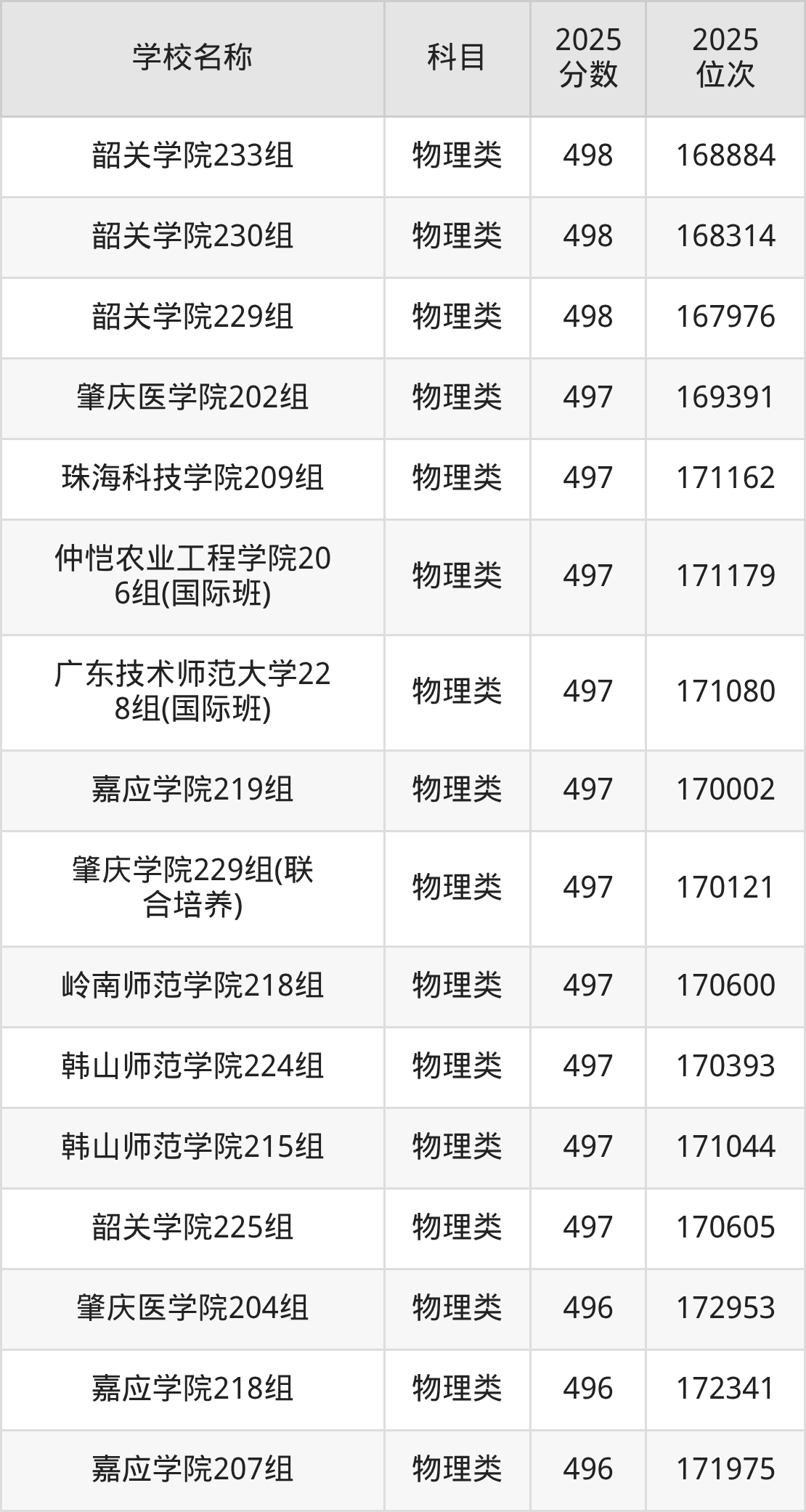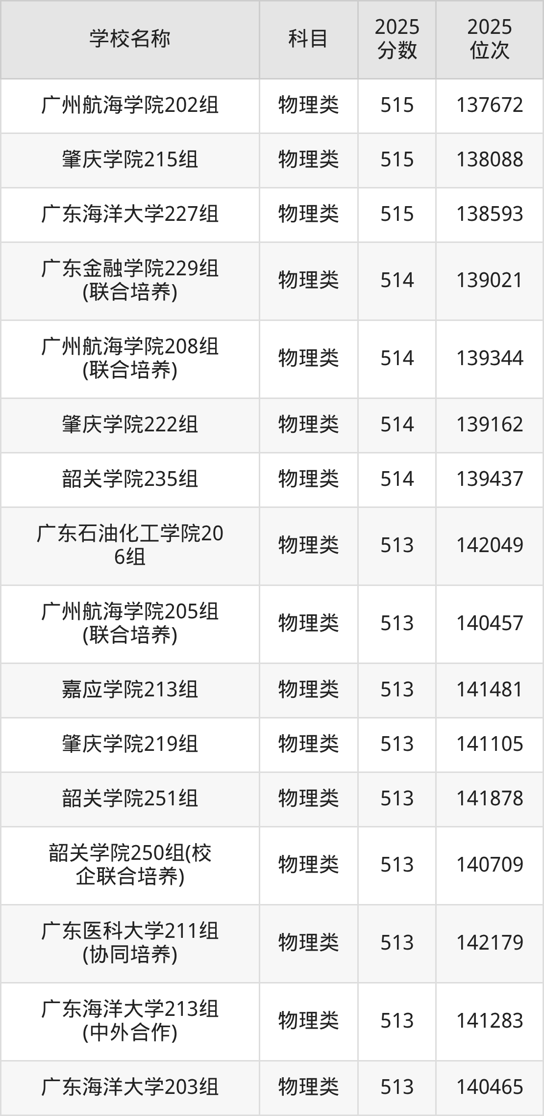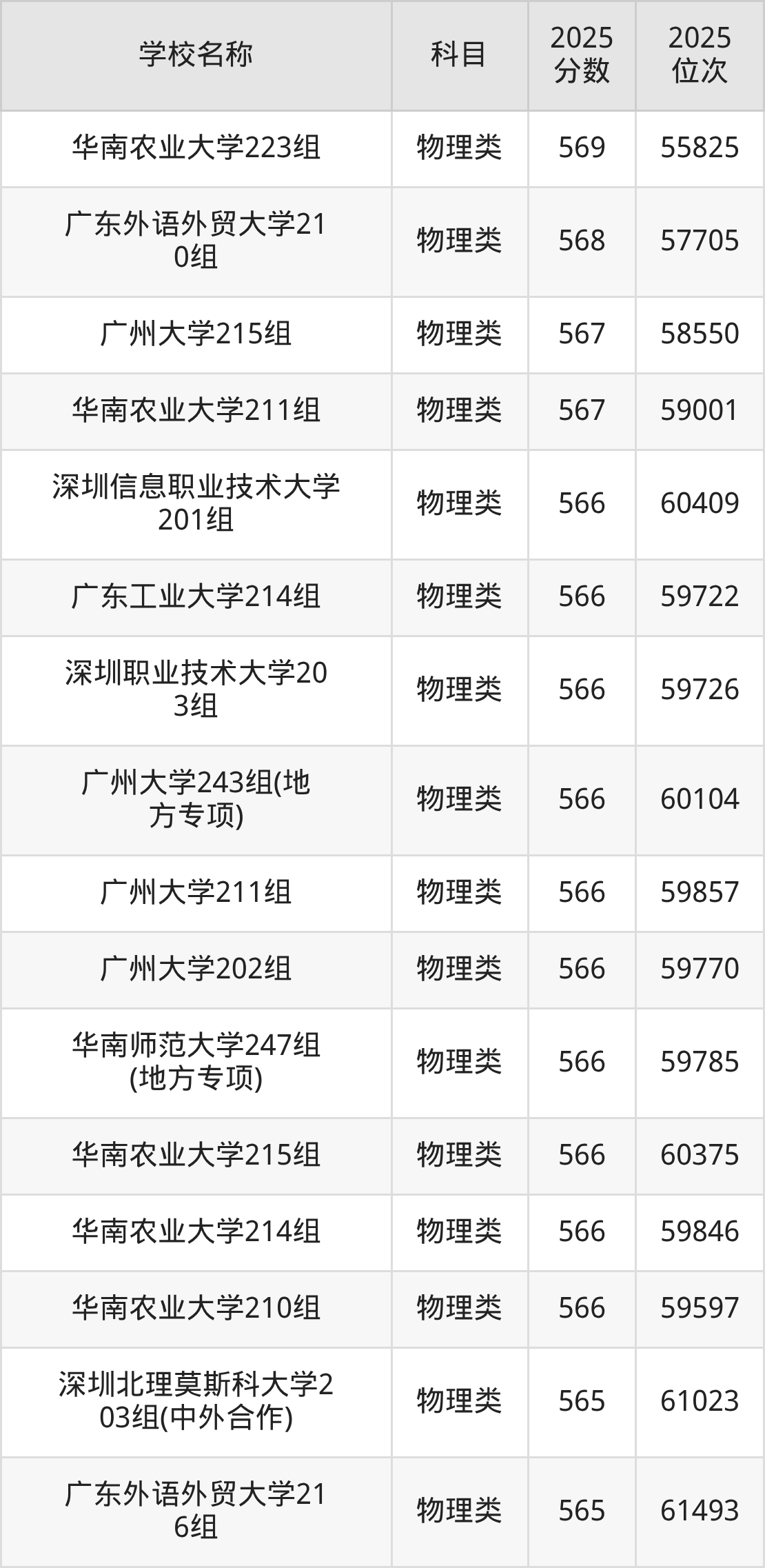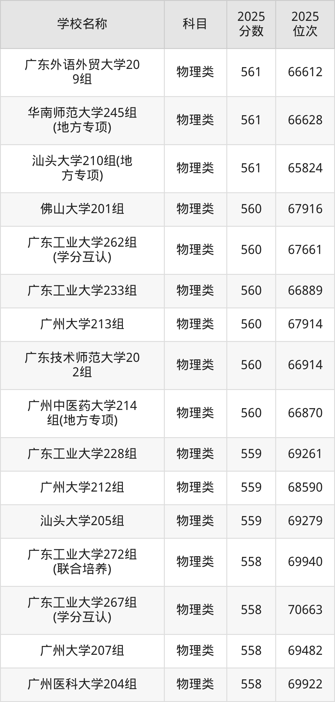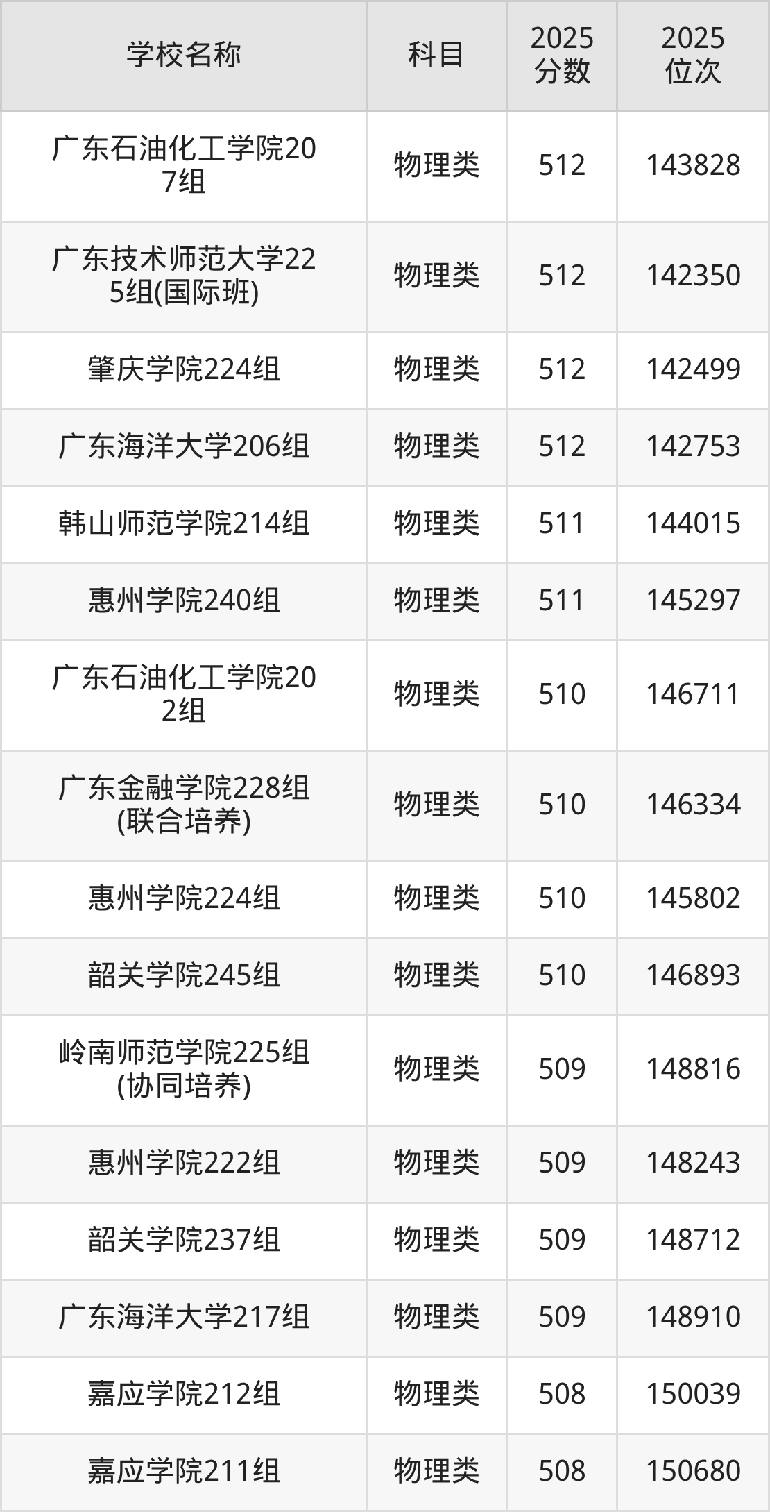 下文为2025年广东省本科大学在广东物理类录取分数线和位次排名表,供大家参考: