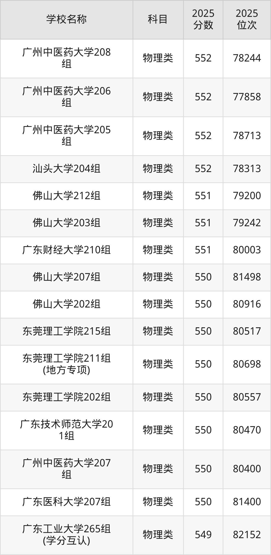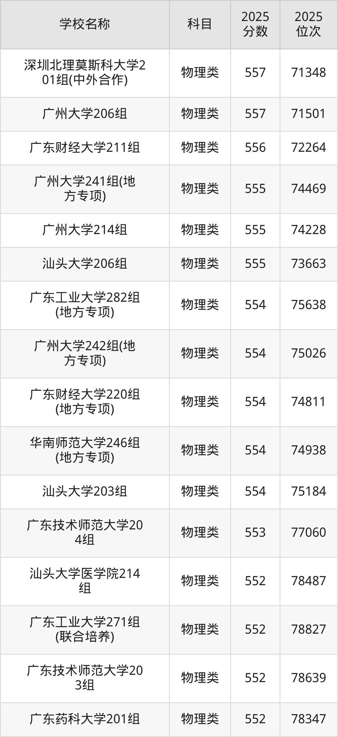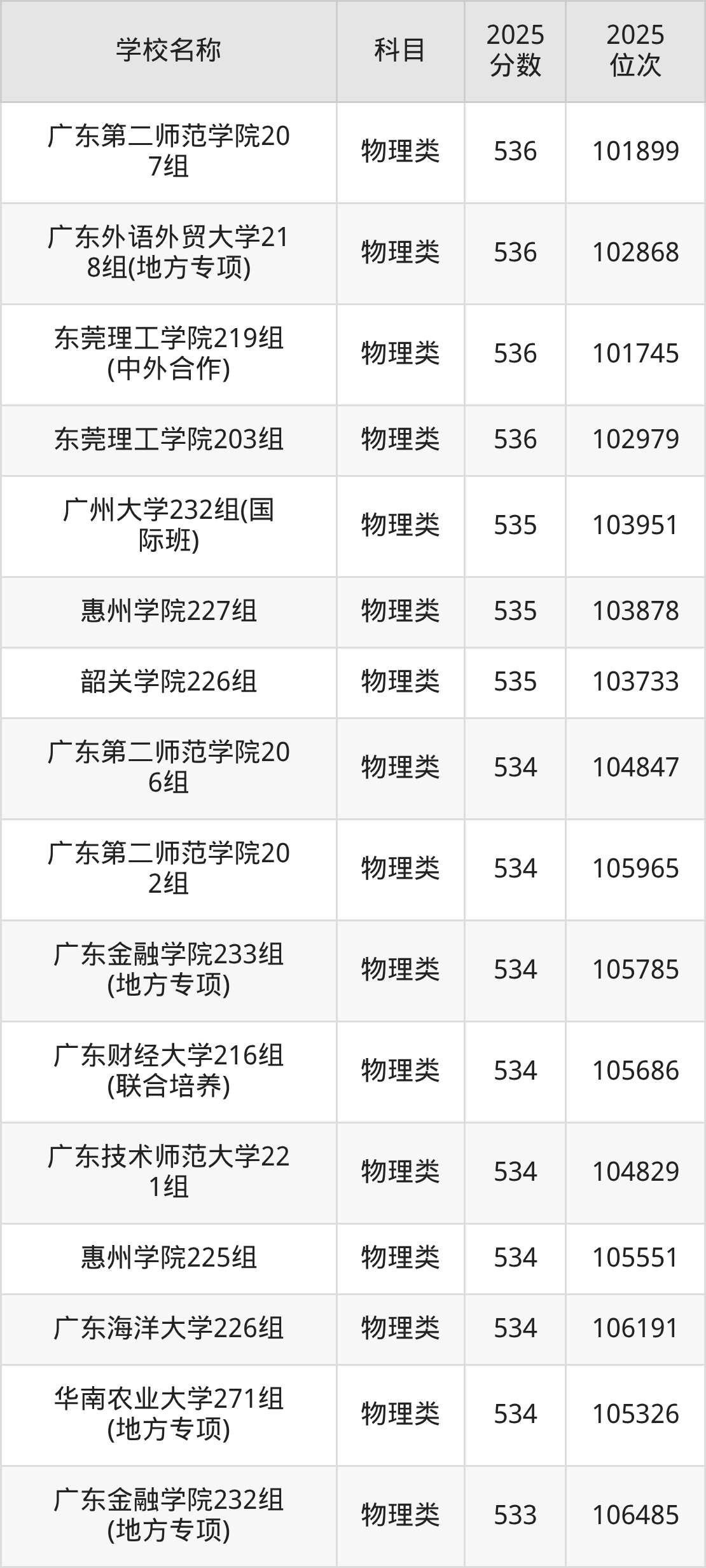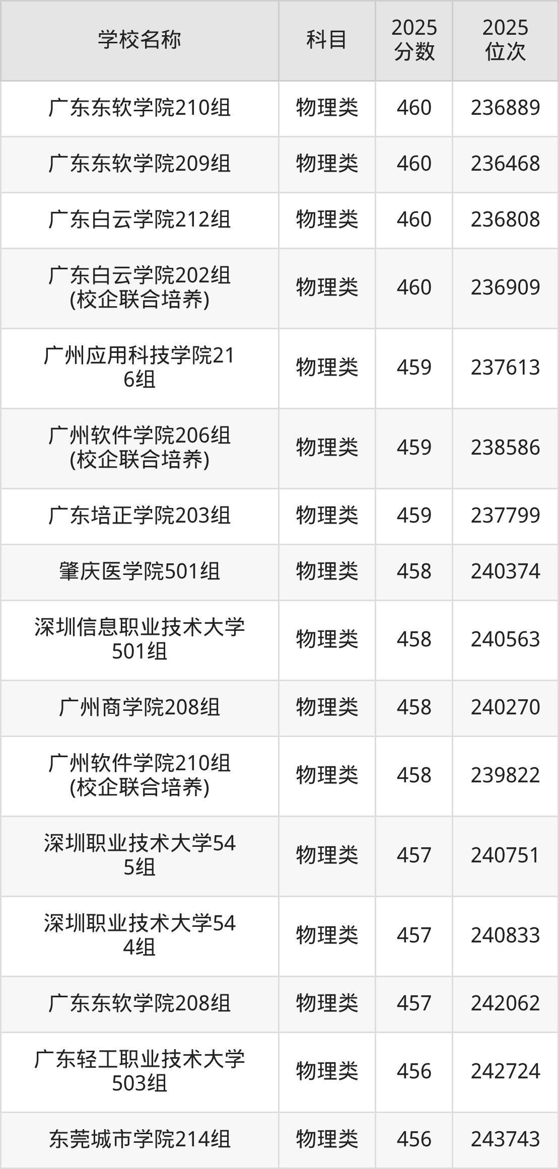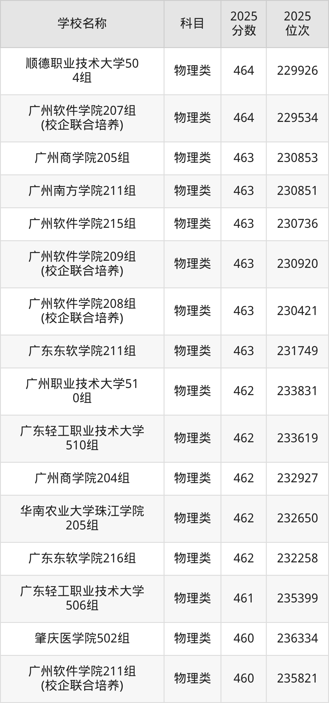 下文为2025年广东省本科大学在广东物理类录取分数线和位次排名表,供大家参考: