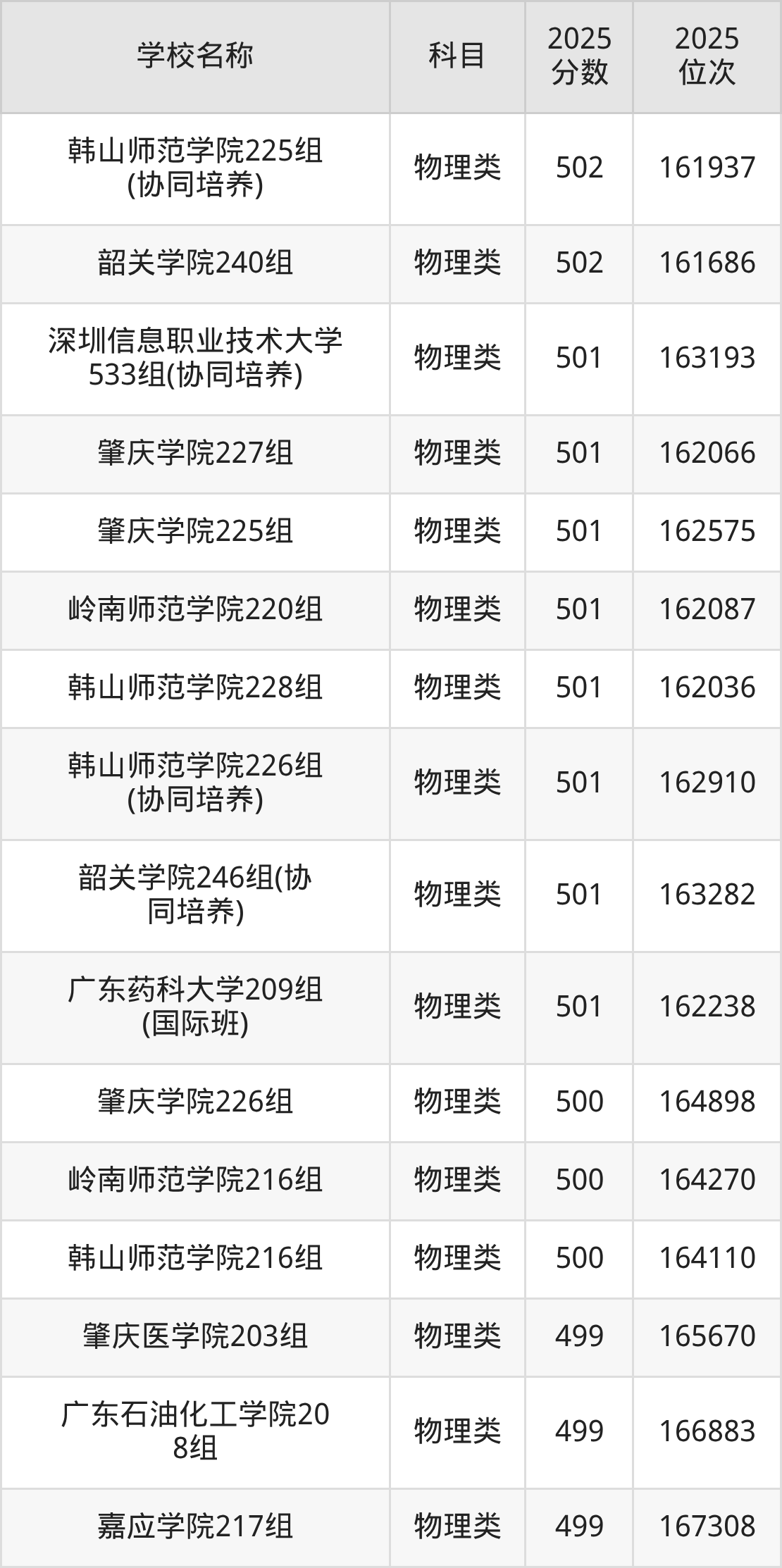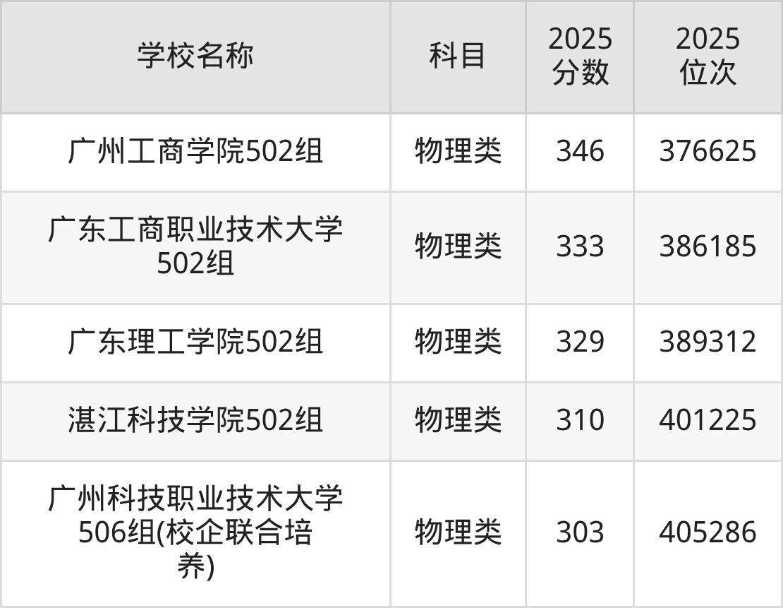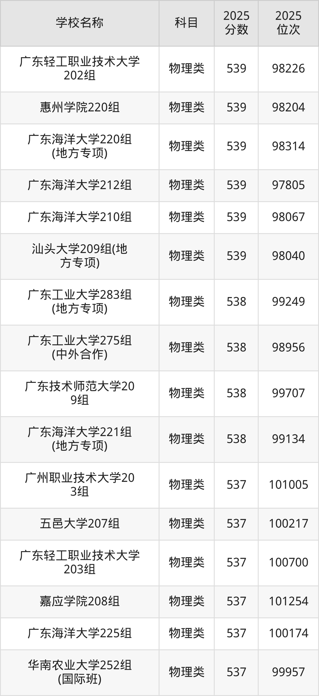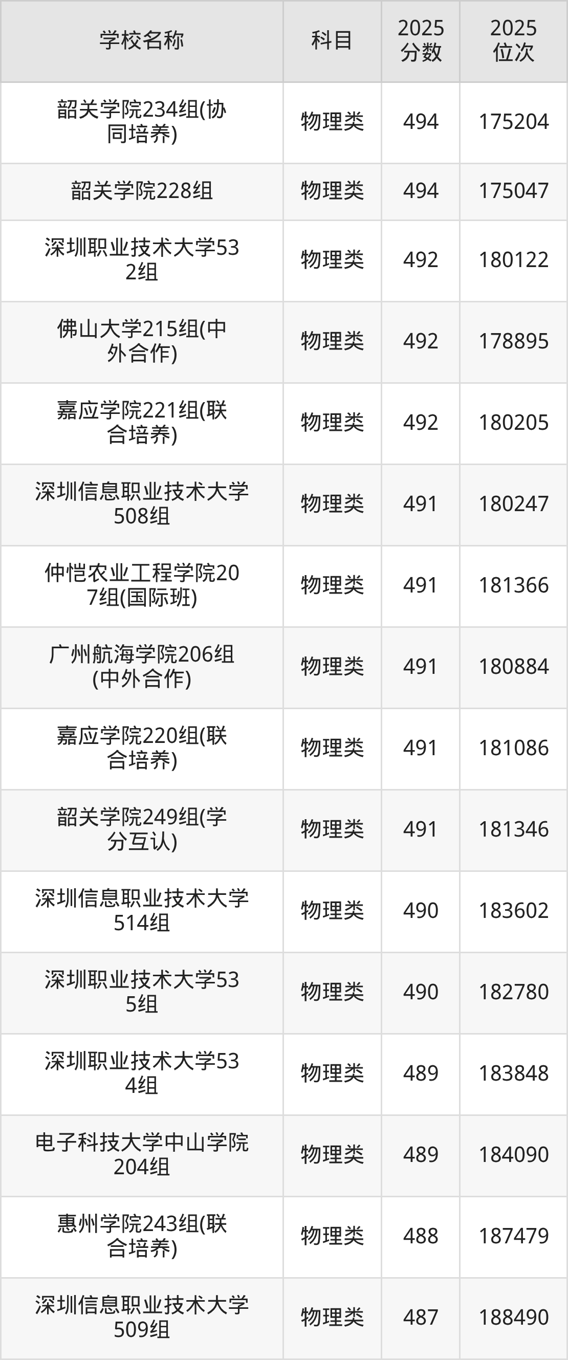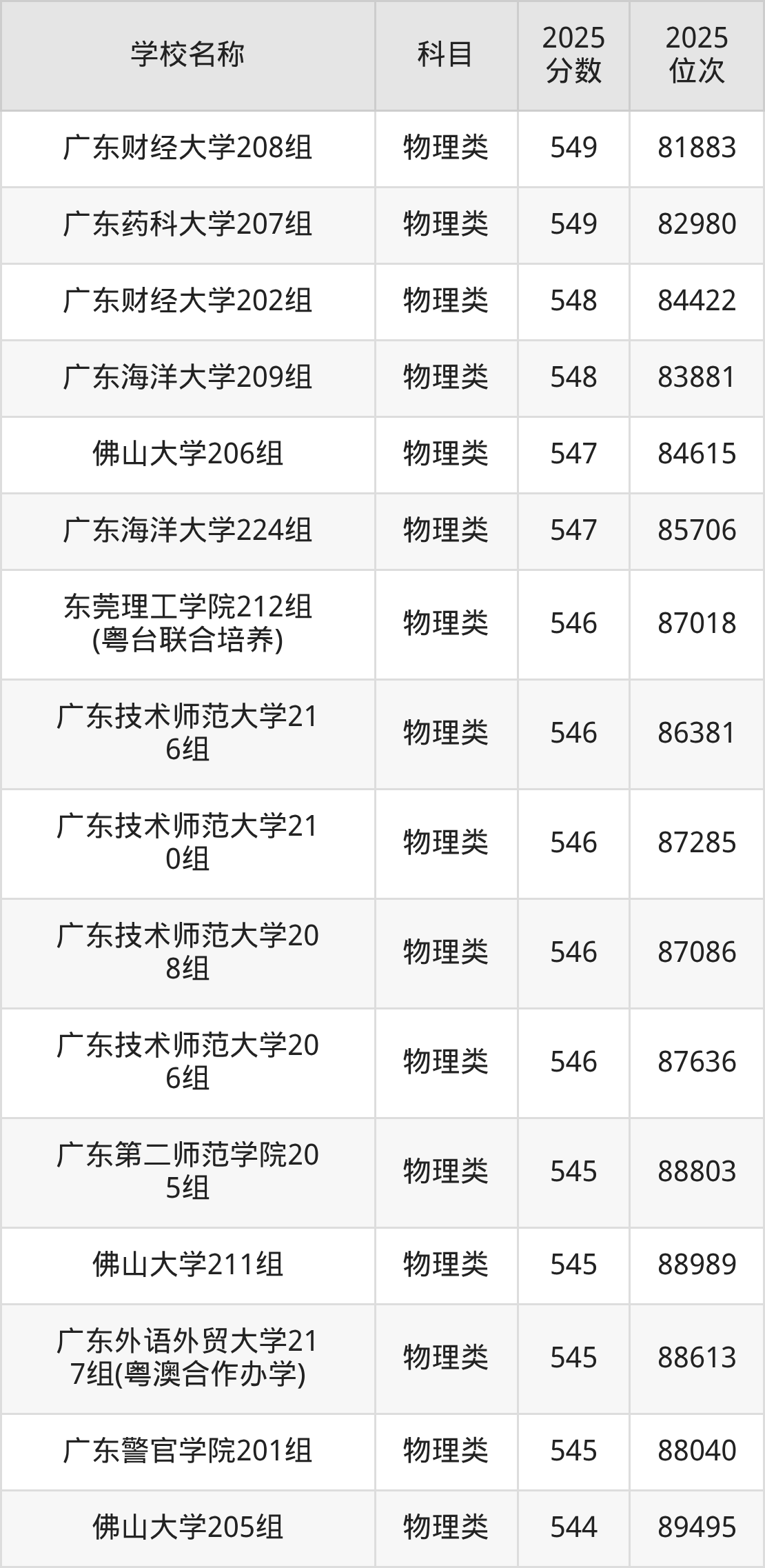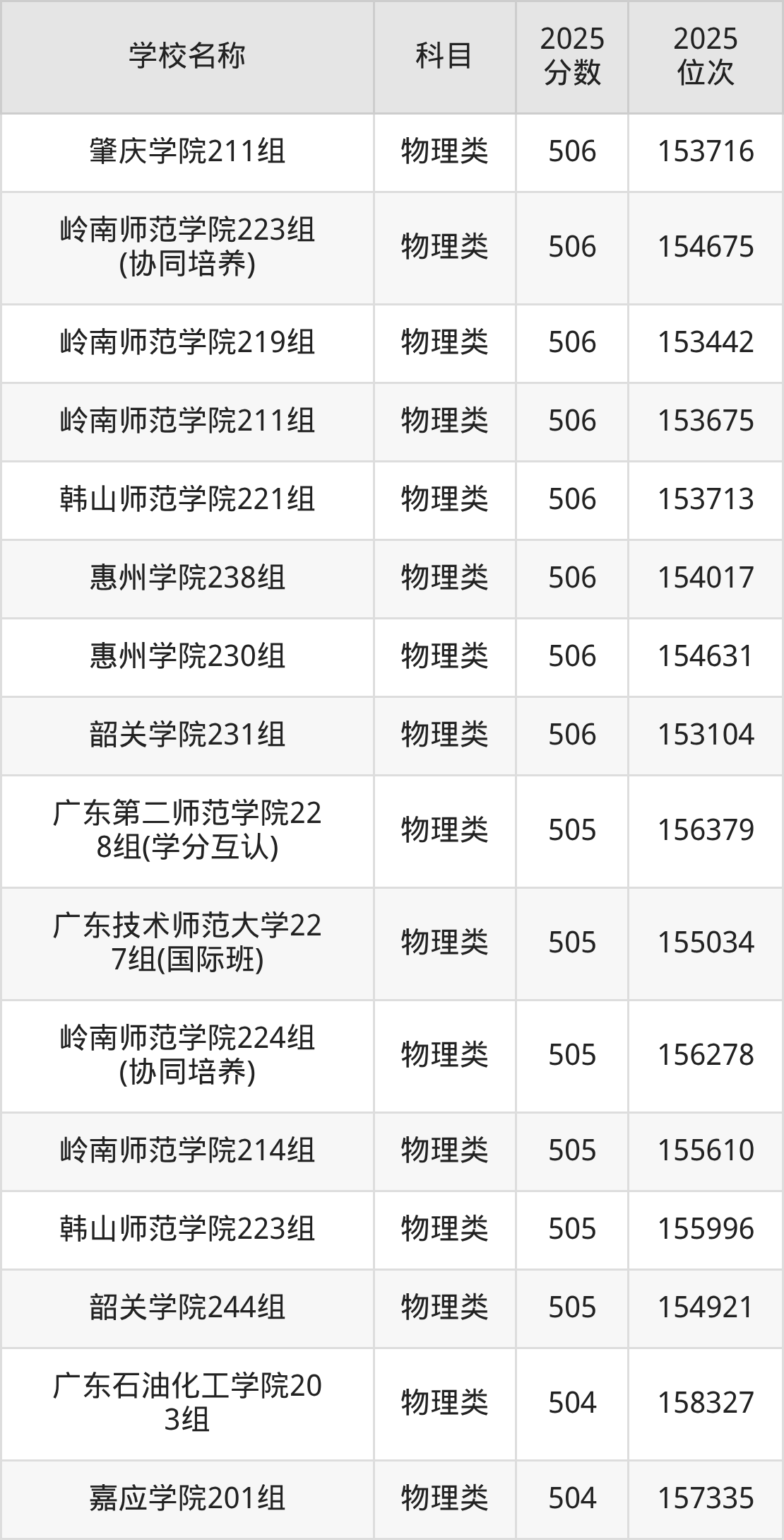 下文为2025年广东省本科大学在广东物理类录取分数线和位次排名表,供大家参考: