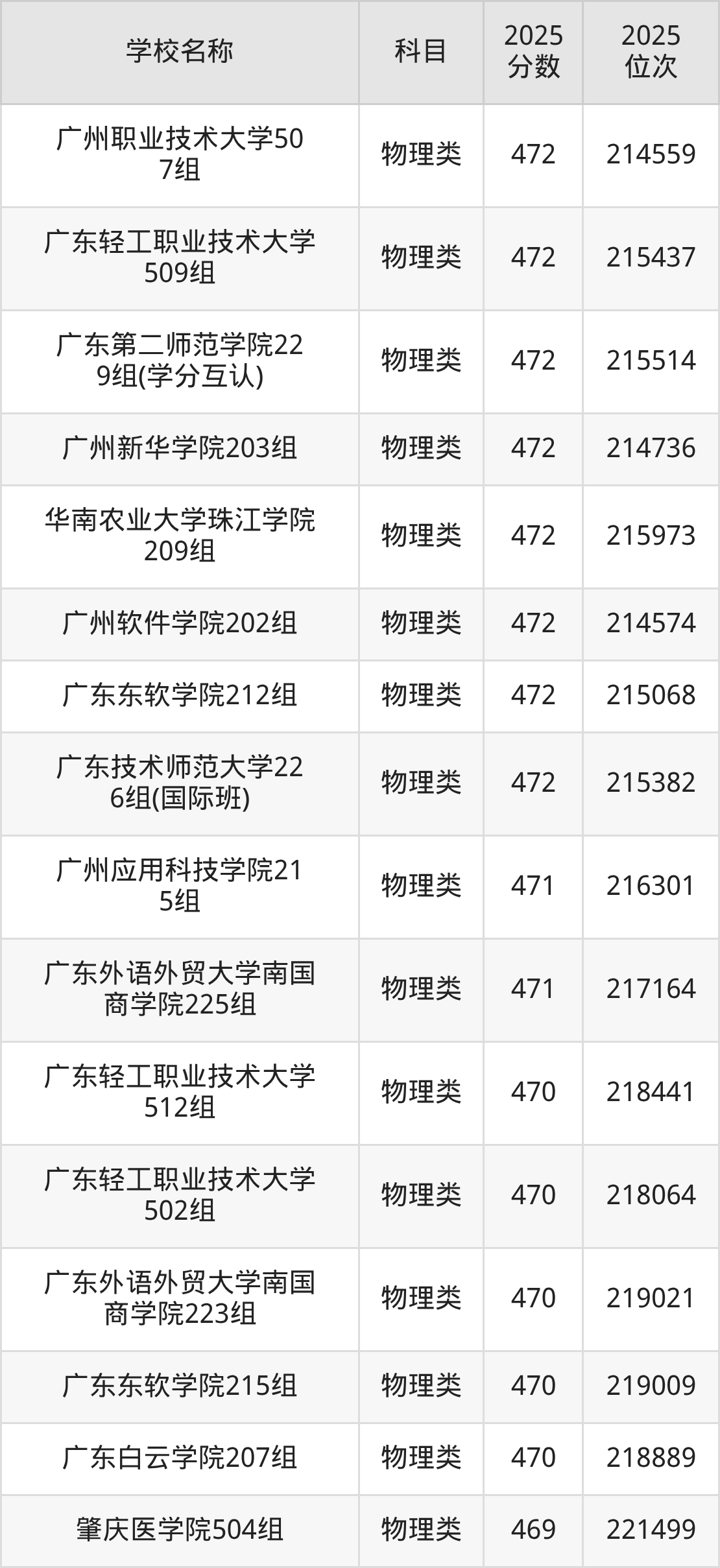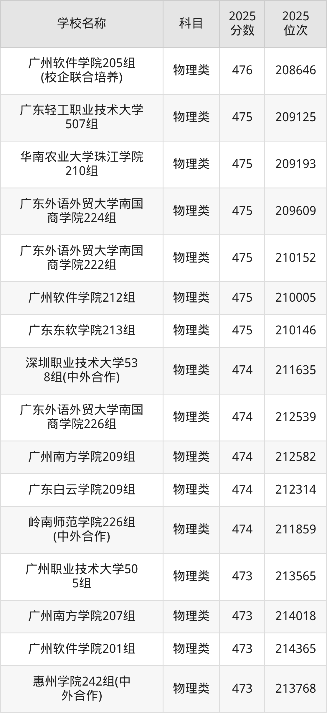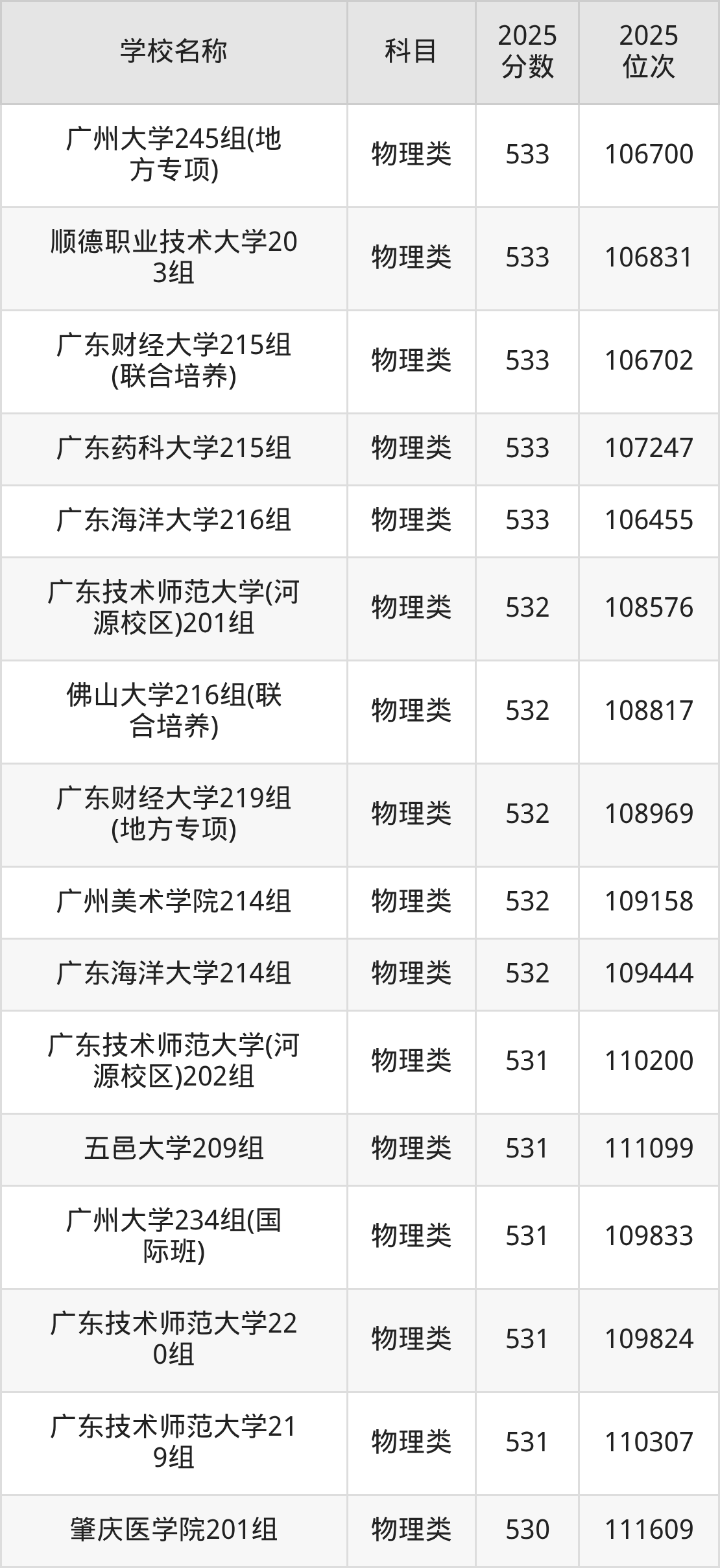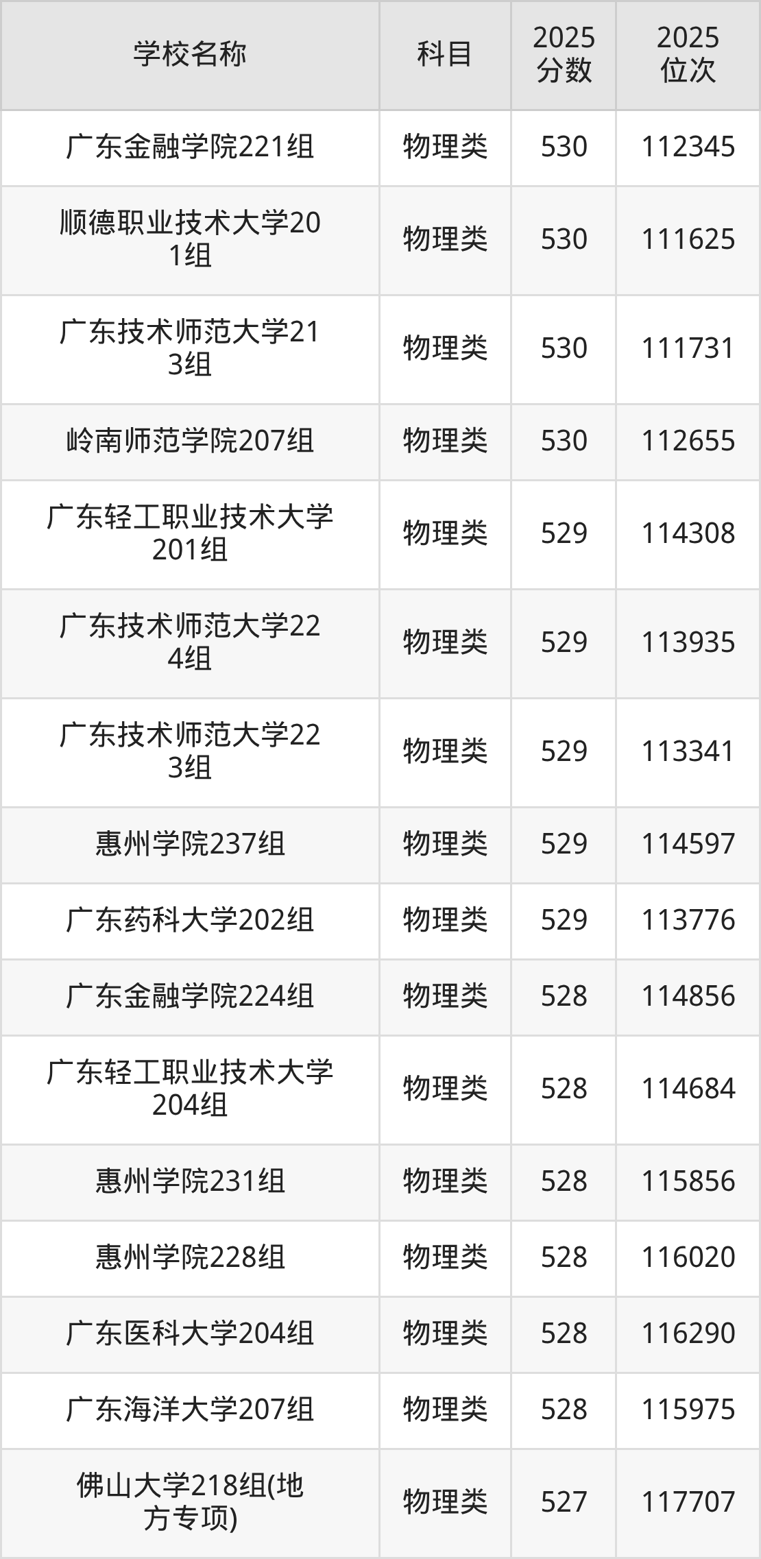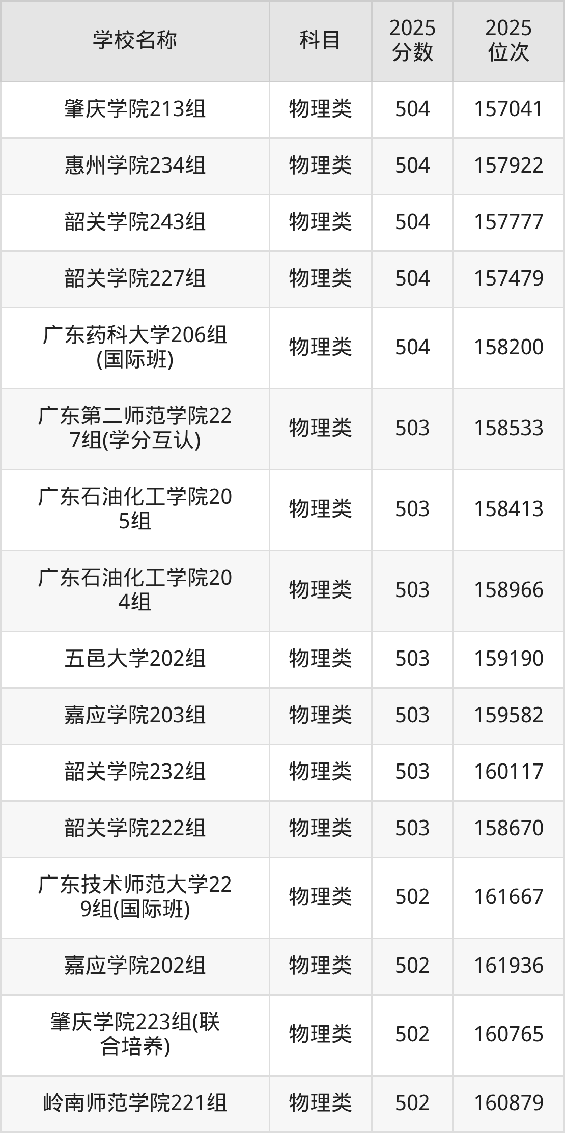 下文为2025年广东省本科大学在广东物理类录取分数线和位次排名表,供大家参考: