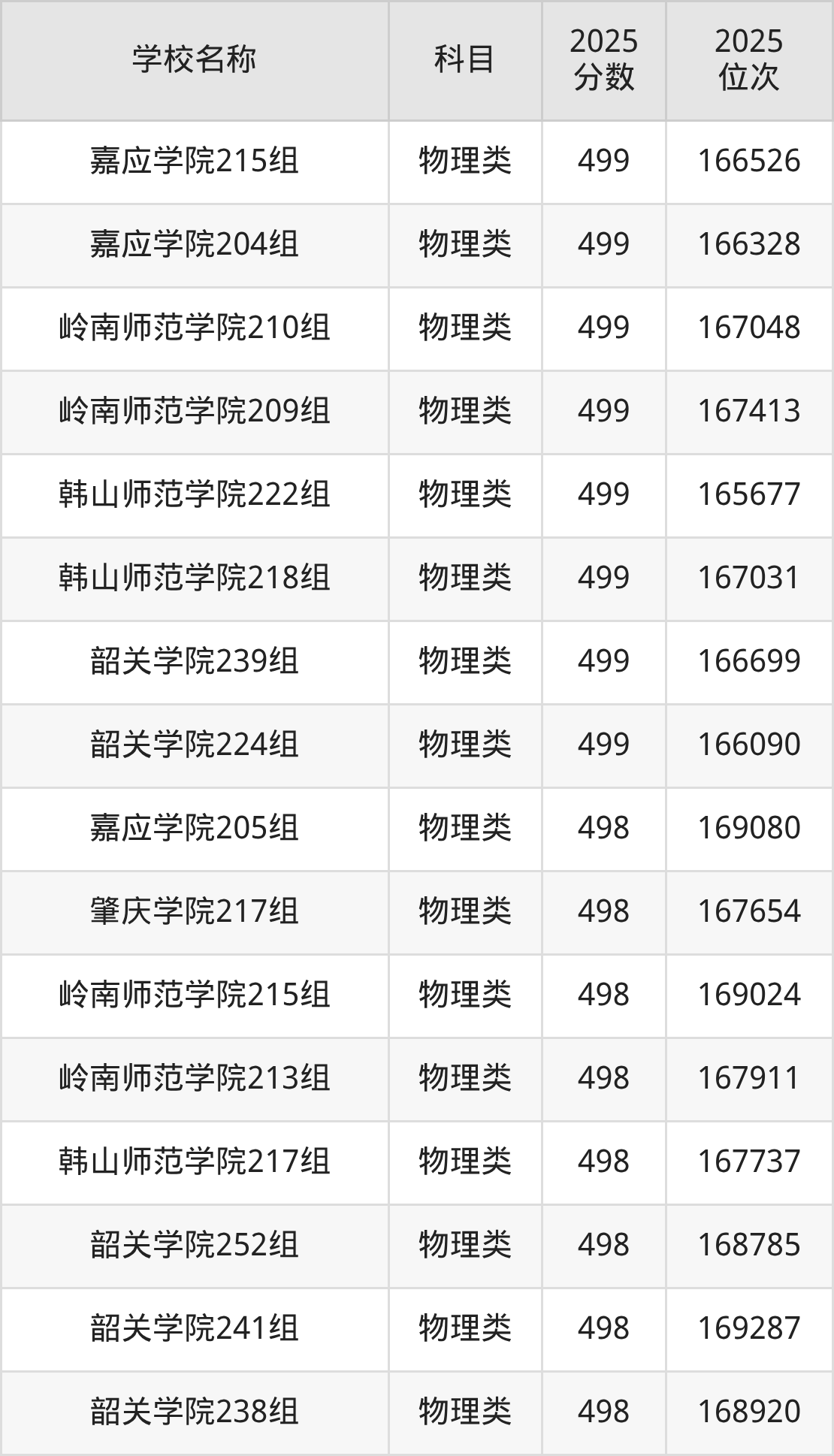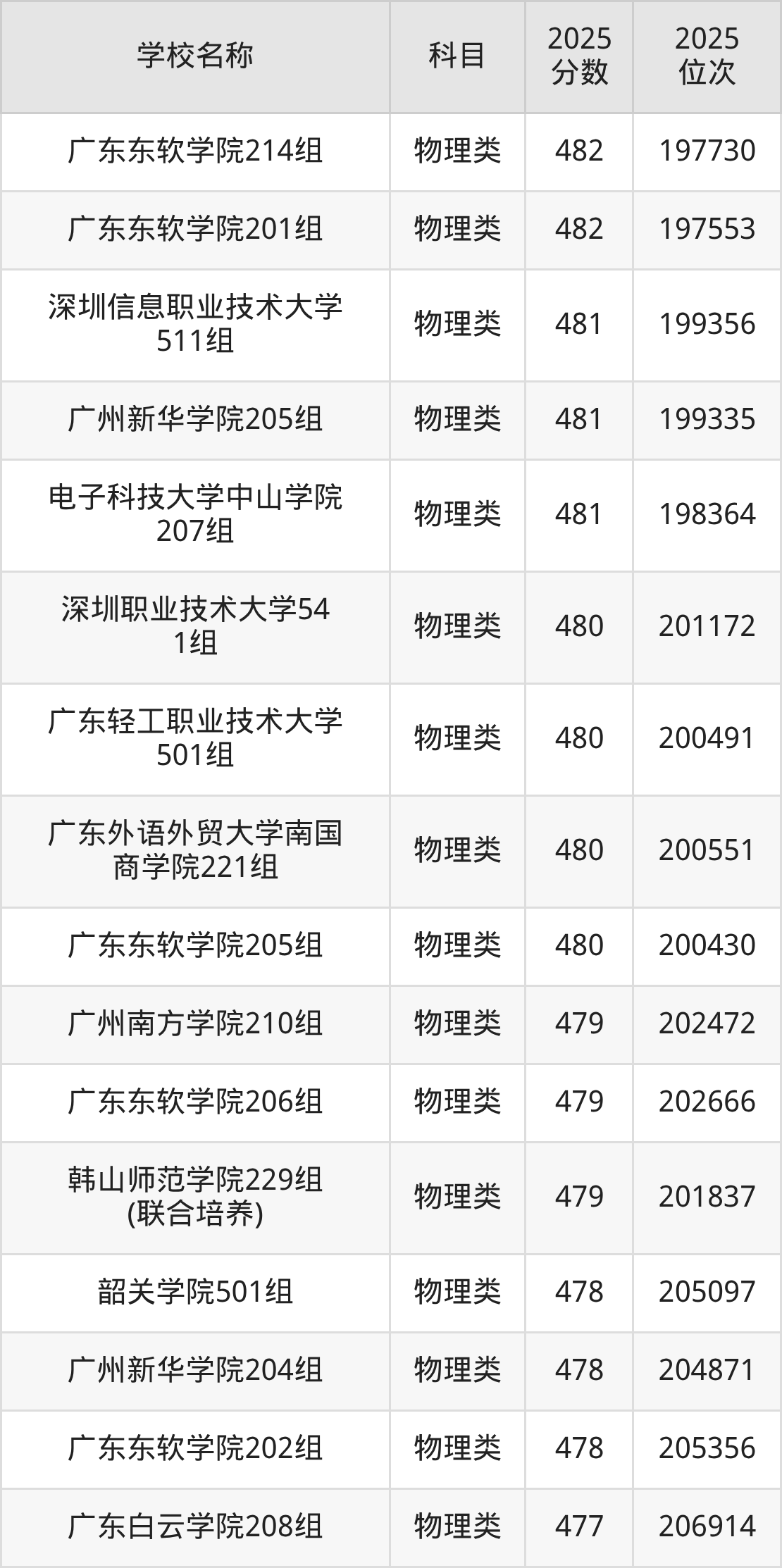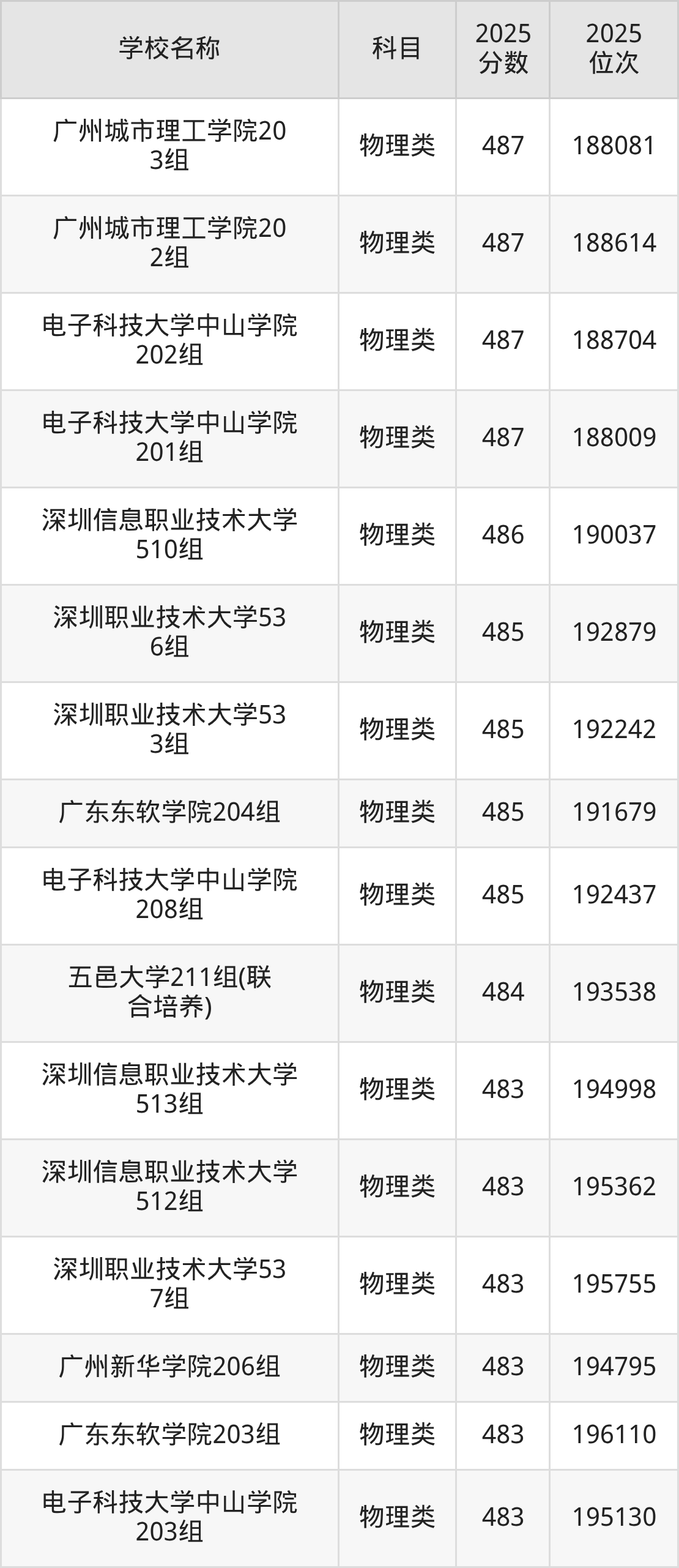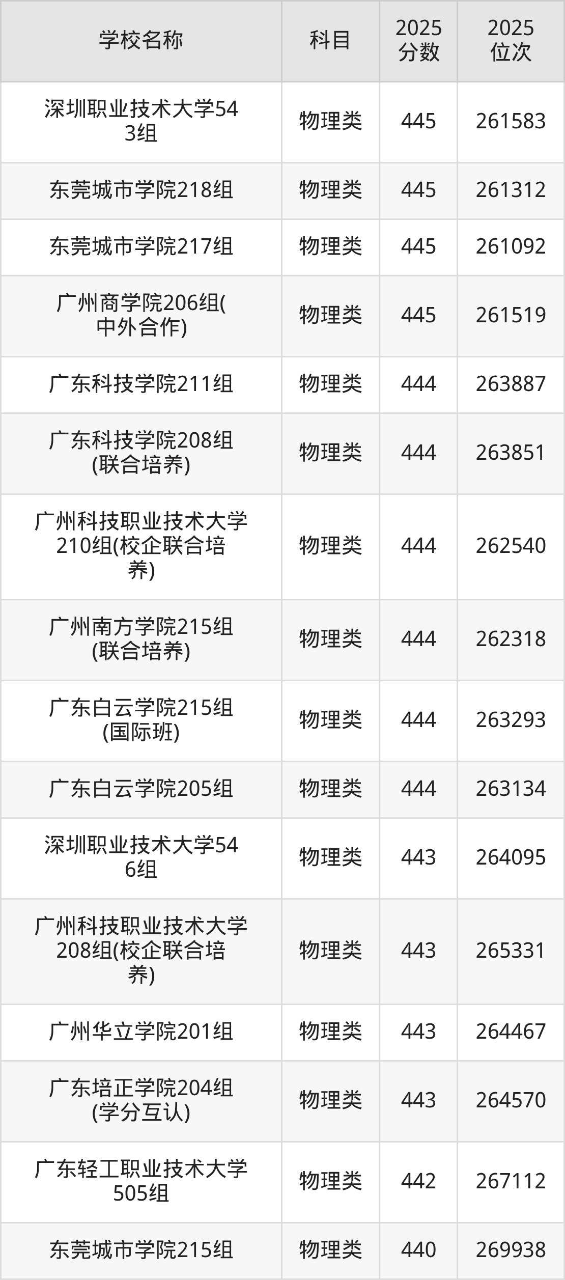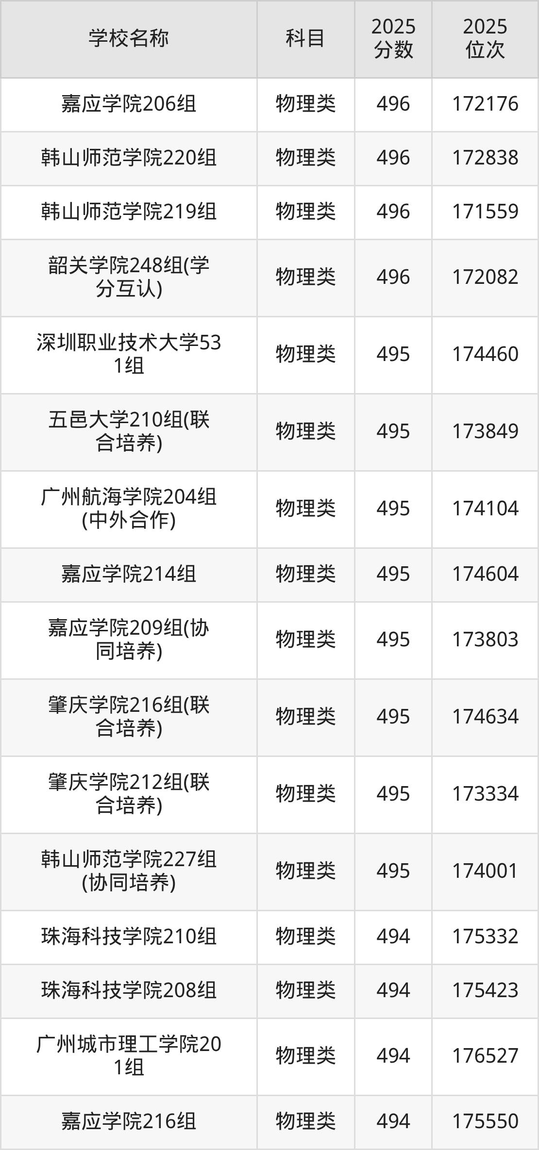 下文为2025年广东省本科大学在广东物理类录取分数线和位次排名表,供大家参考: