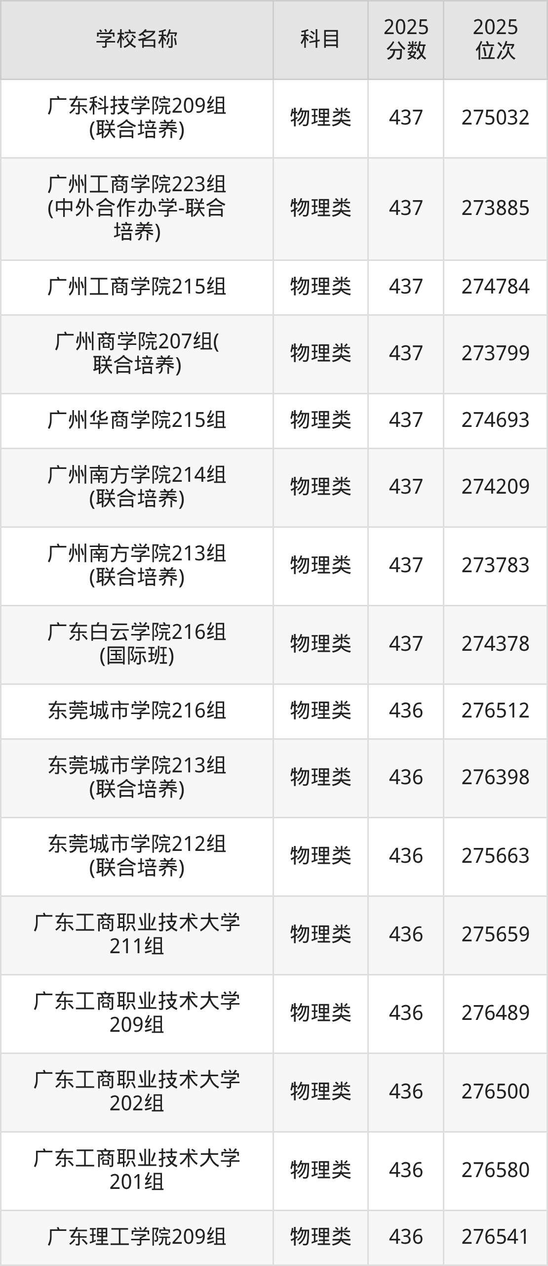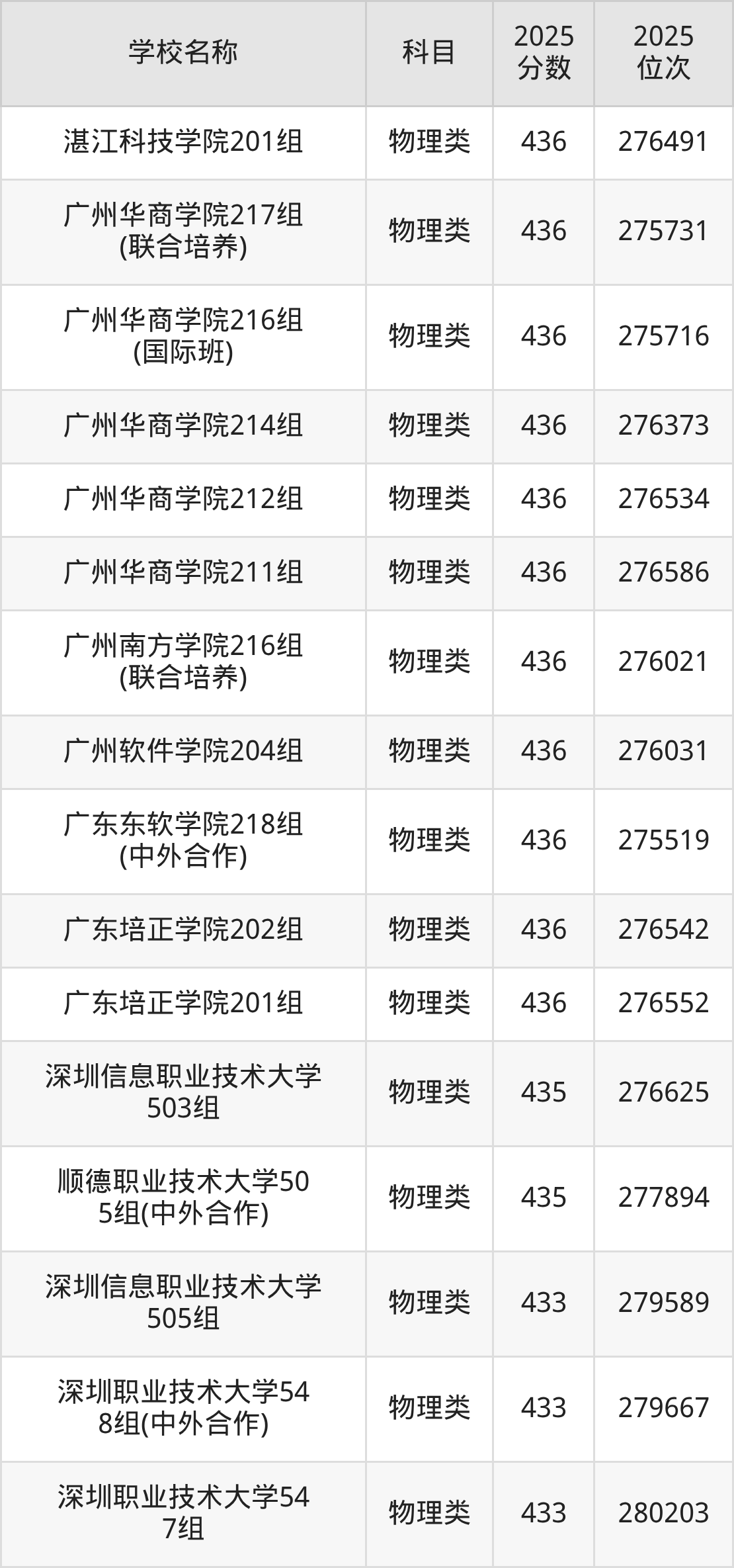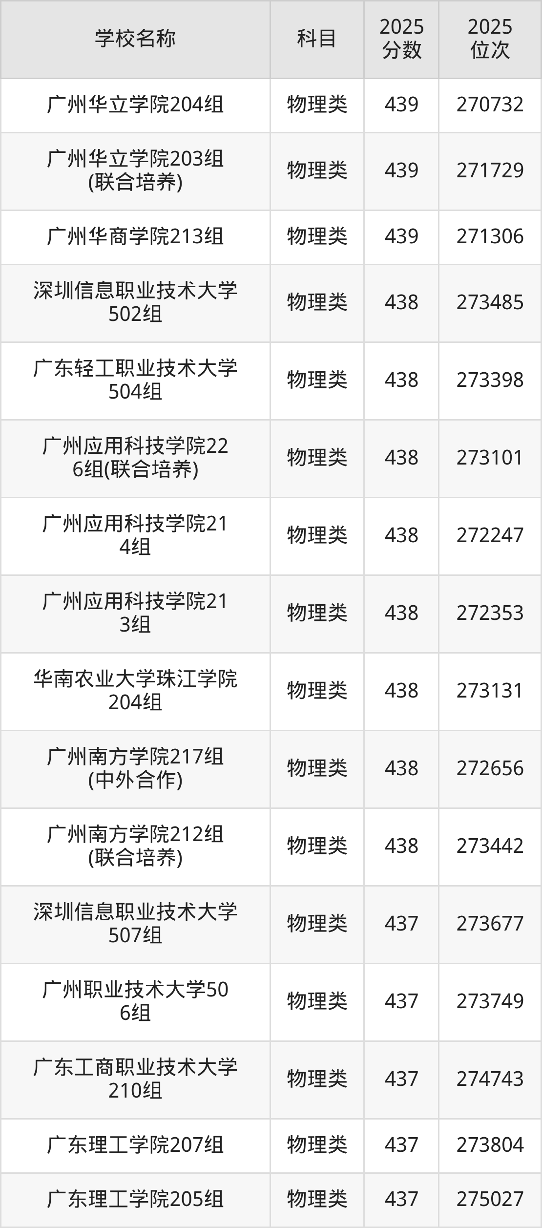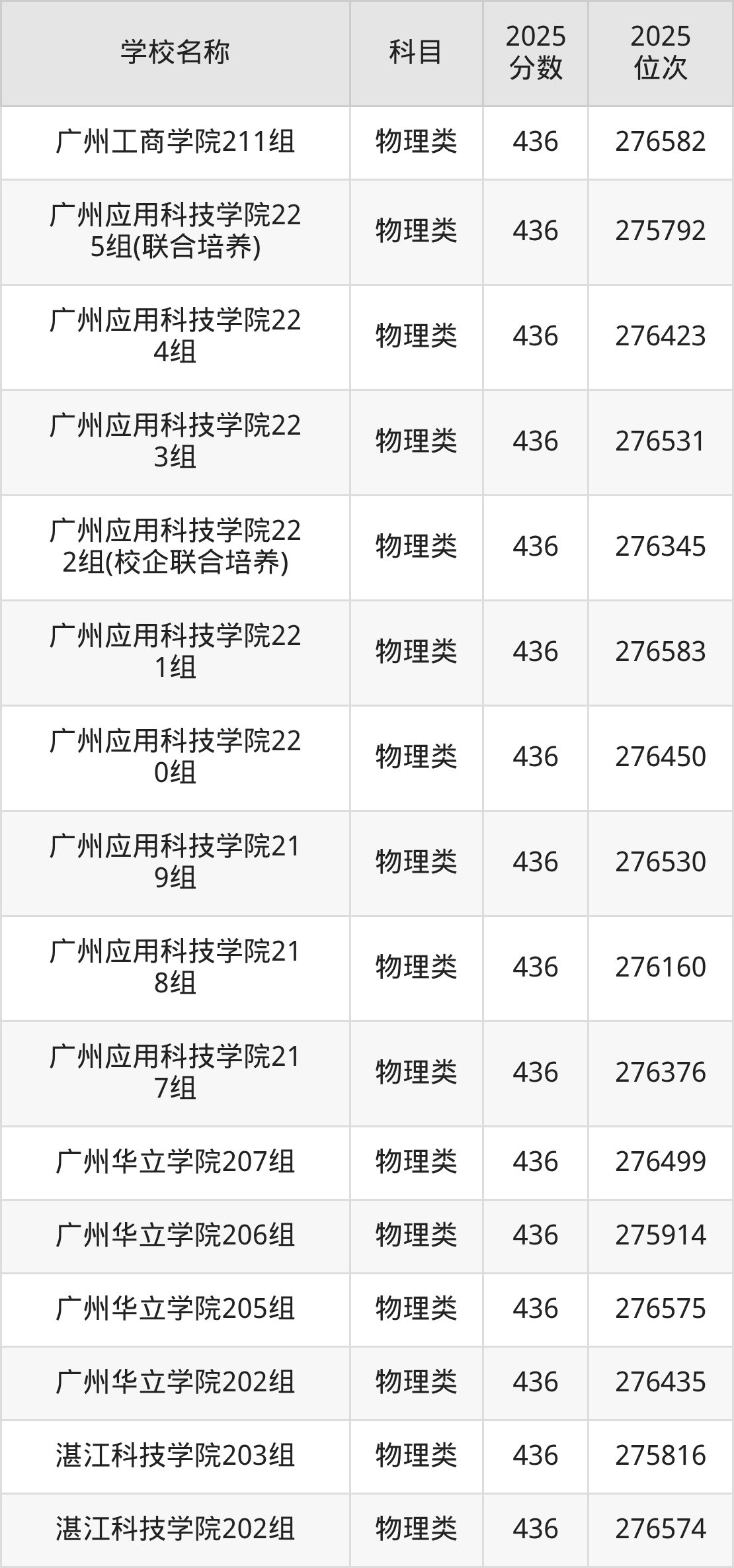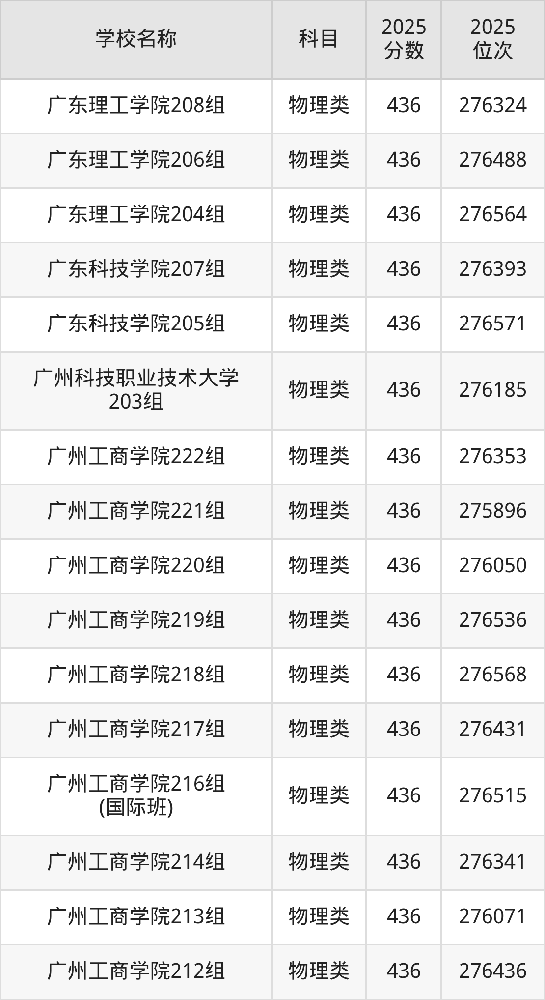 下文为2025年广东省本科大学在广东物理类录取分数线和位次排名表,供大家参考: